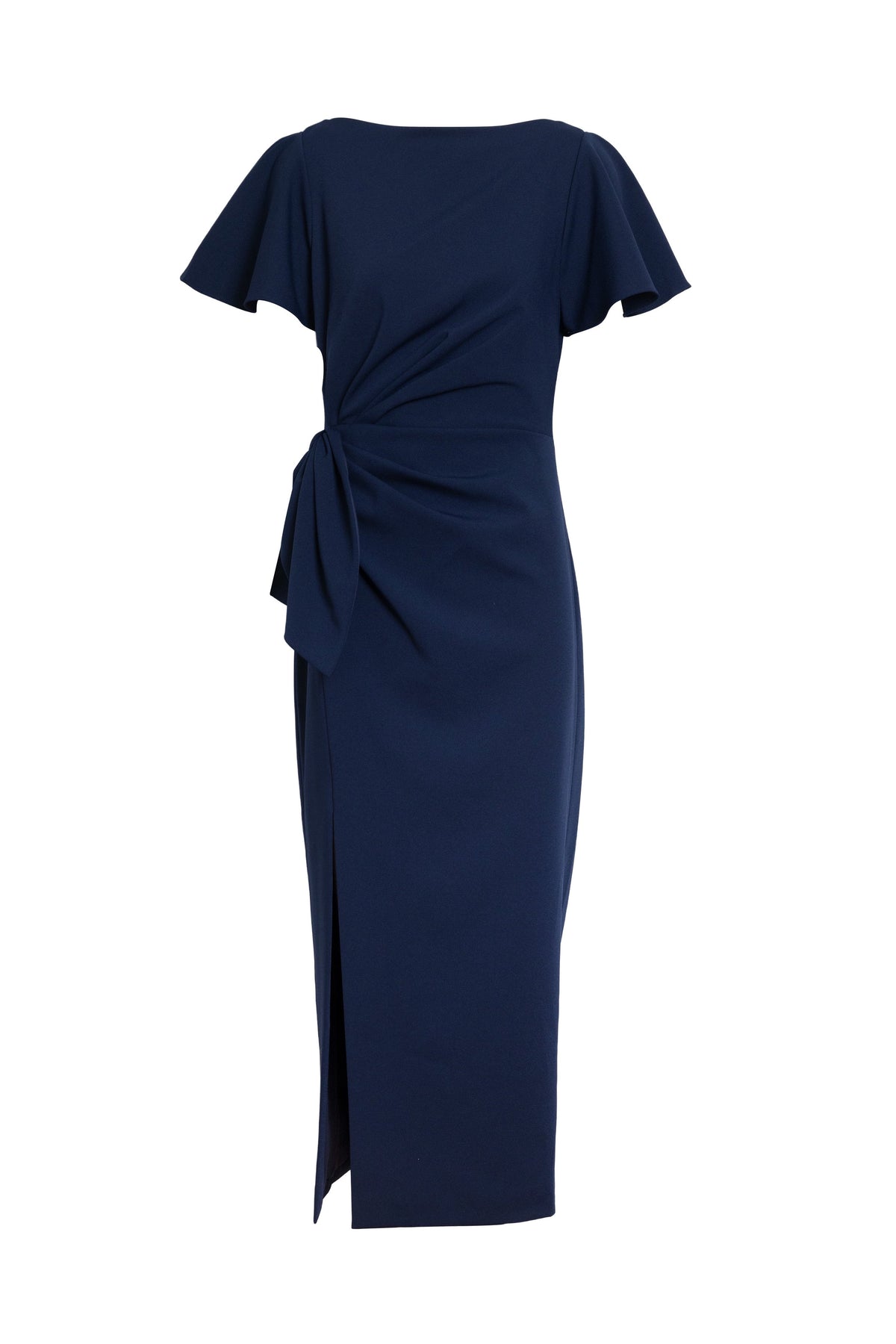 A fitted midi-length dress with a fluttered sleeve that whispers grace and a bow cinched at the waist like a secret—she’s perfectly timed for a standing ovation. She has a hint of stretch and the slit? Just a little drama after the second cocktail.