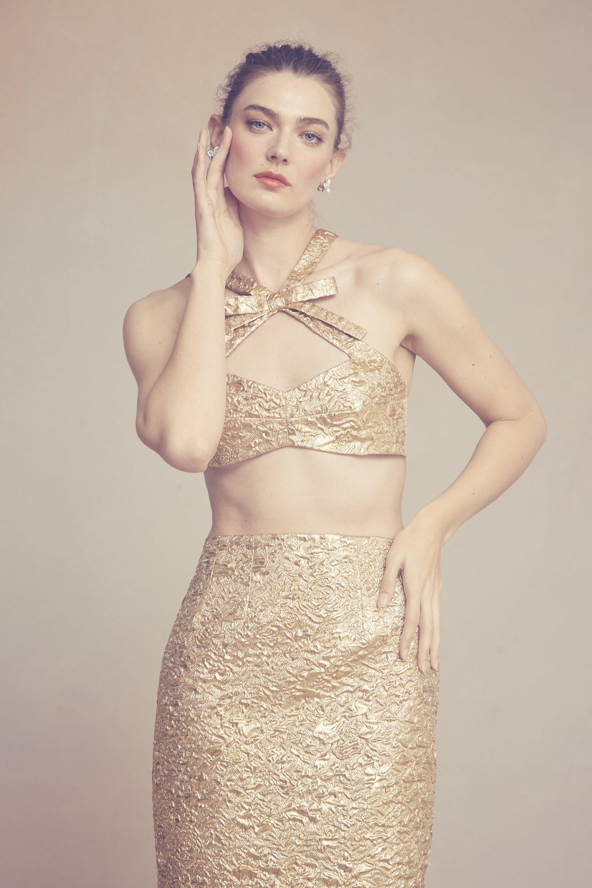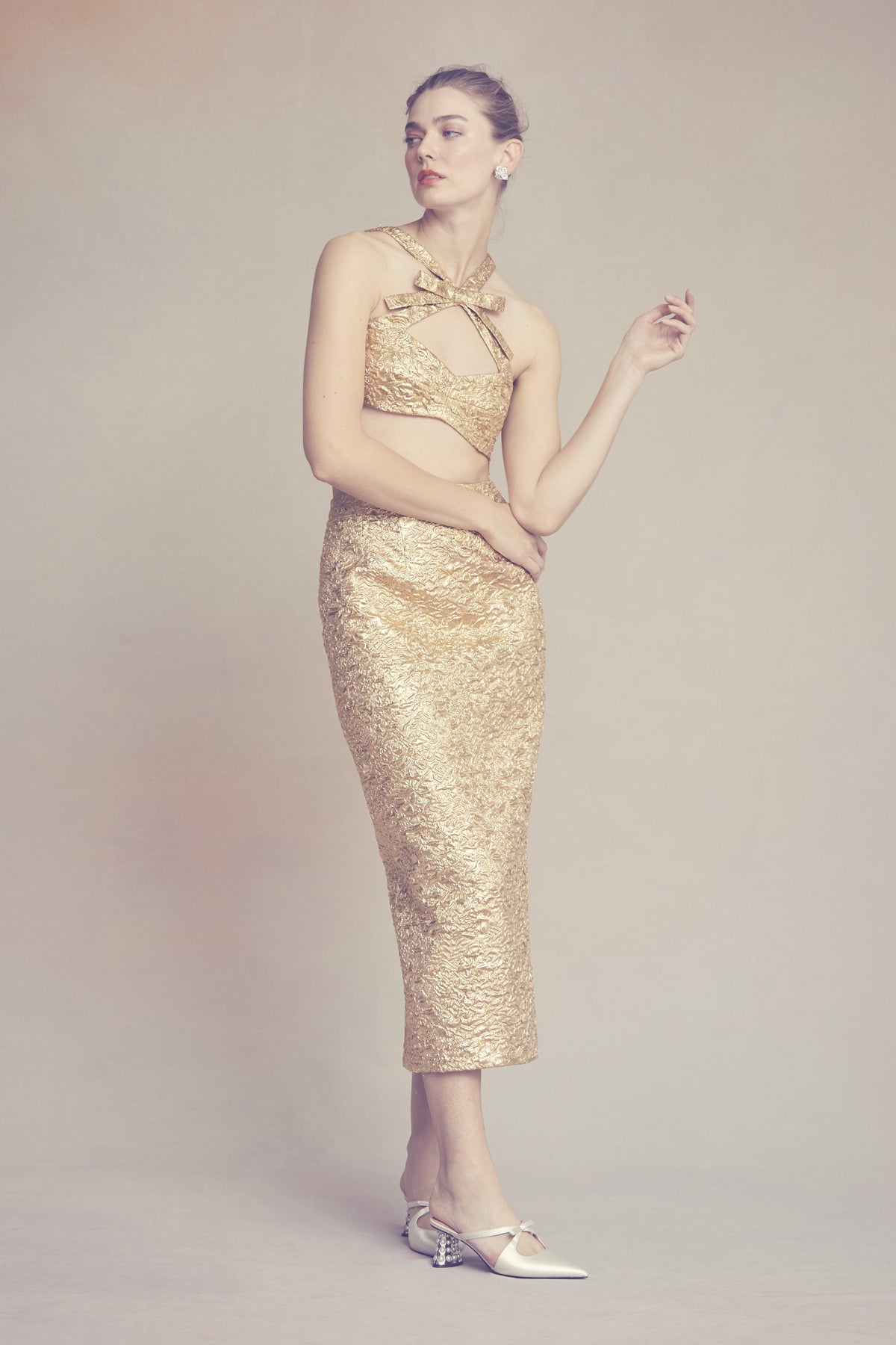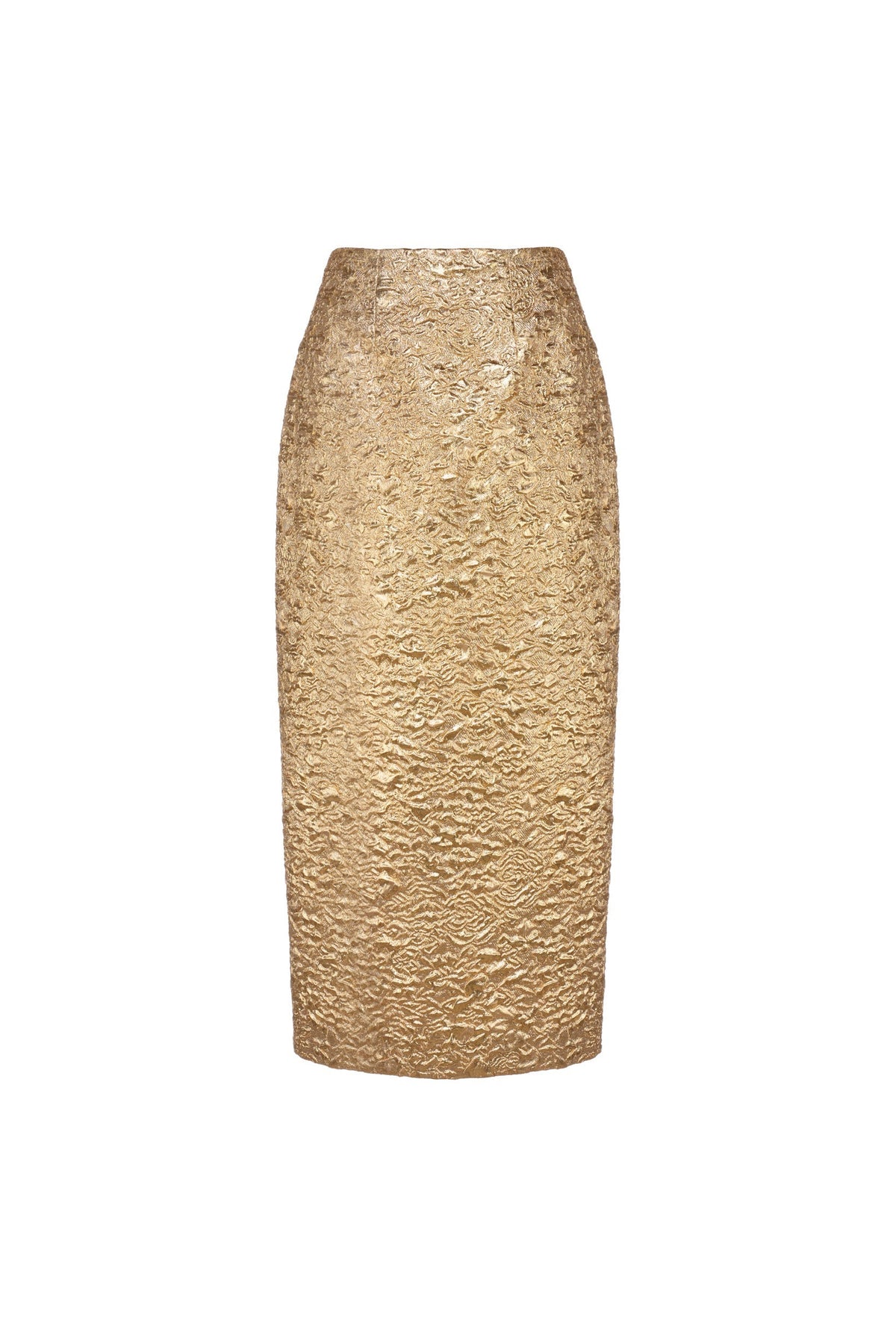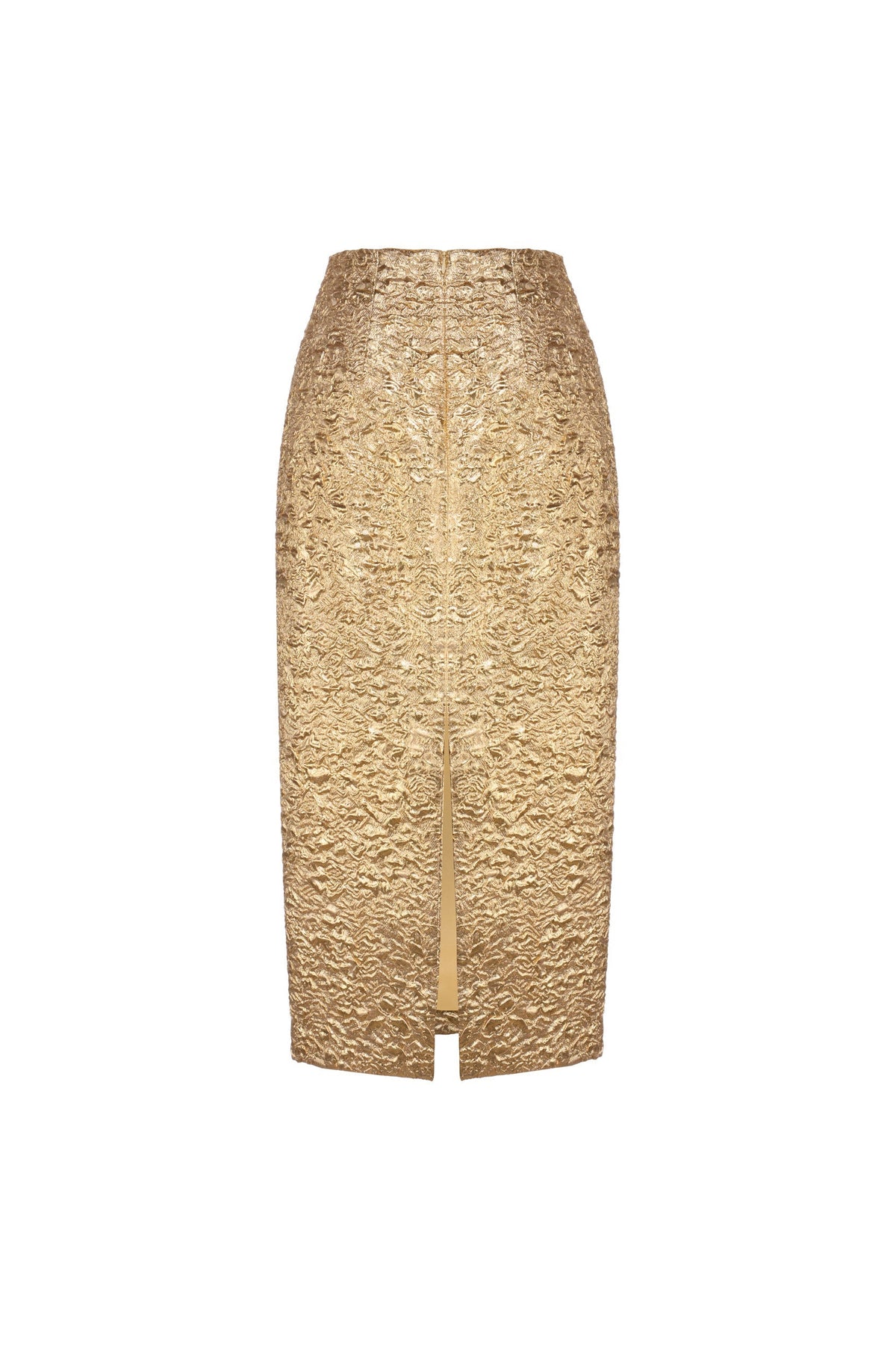 Crafted in our luxurious, metallic gold brocade, our Effie Pencil Skirt offers a classic silhouette in a modern, textured fabrication. This lustrous fabric is woven with a subtle floral design that reflects light for a maximalist effect. This skirt can be paired with the Olivia Bow Top. Features a slit at center back and an invisible zipper.