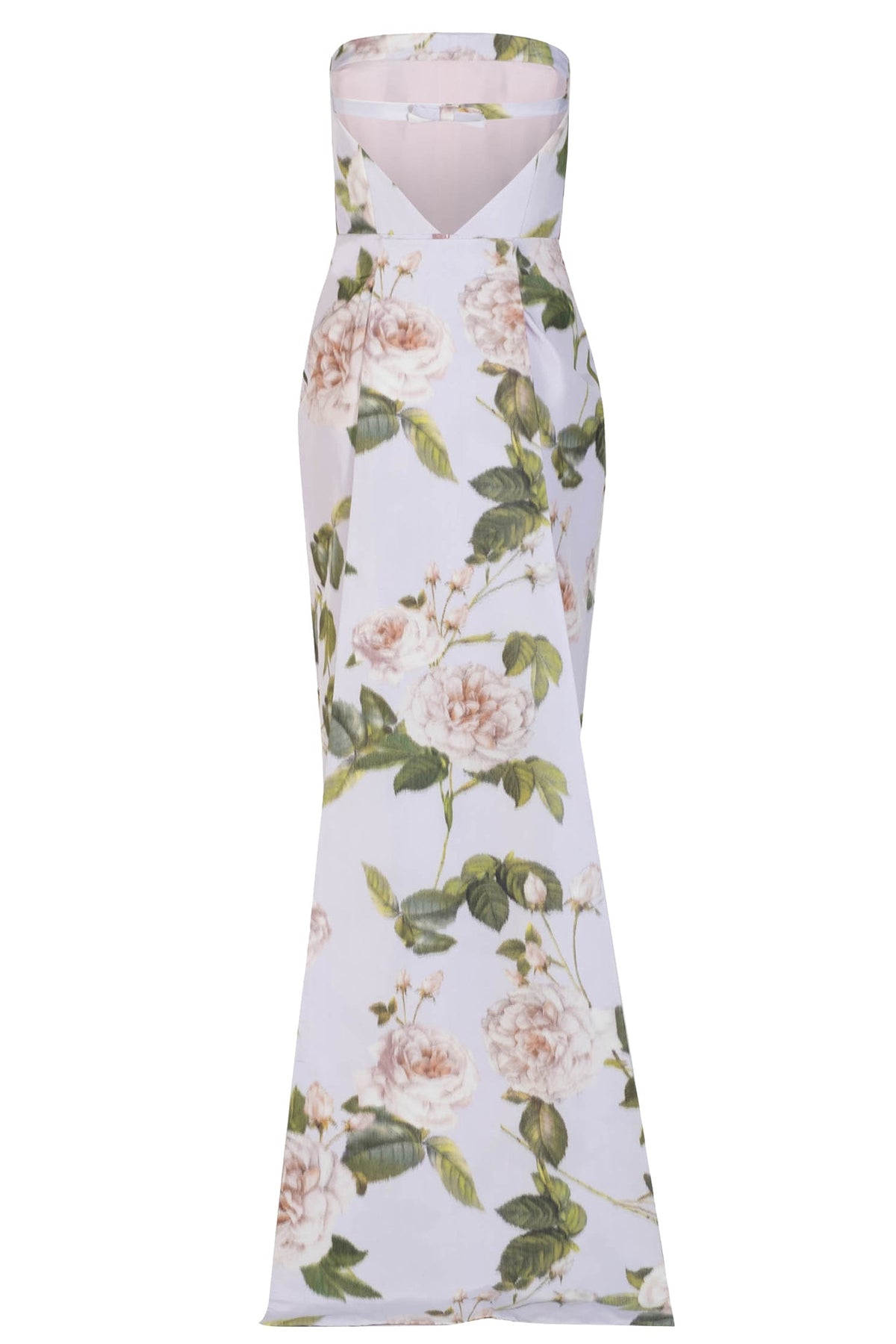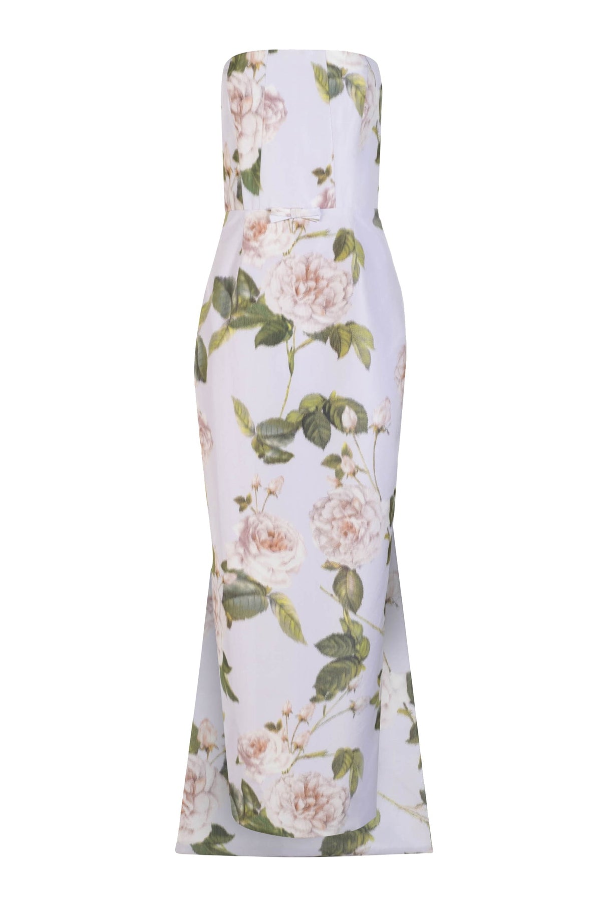 The Elizabeth Dress in Lavender Rose Taffeta offers a slim, column silhouette with a detachable train for versatile styling. The structured, corset bodice features a bow strap closure and a bow at the waistline. Crafted from our chine-printed Lavender Rose taffeta, this dress features ivory and green florals set on a lavender background. This style features an invisible zipper and bow strap closure.