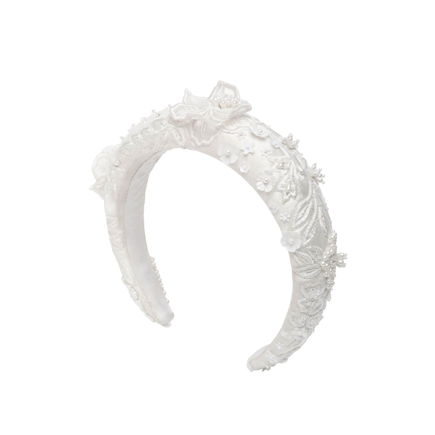 The Emma Headband in Ivory Silk Wool with 3D Lace Embellishment is the perfect accessory for the bride who is looking to incorporate a touch of elegant prep into her look. This padded headband features intricate 3D embroidery that pairs back to our Piper Bucket Bag and Alexandra Gown.