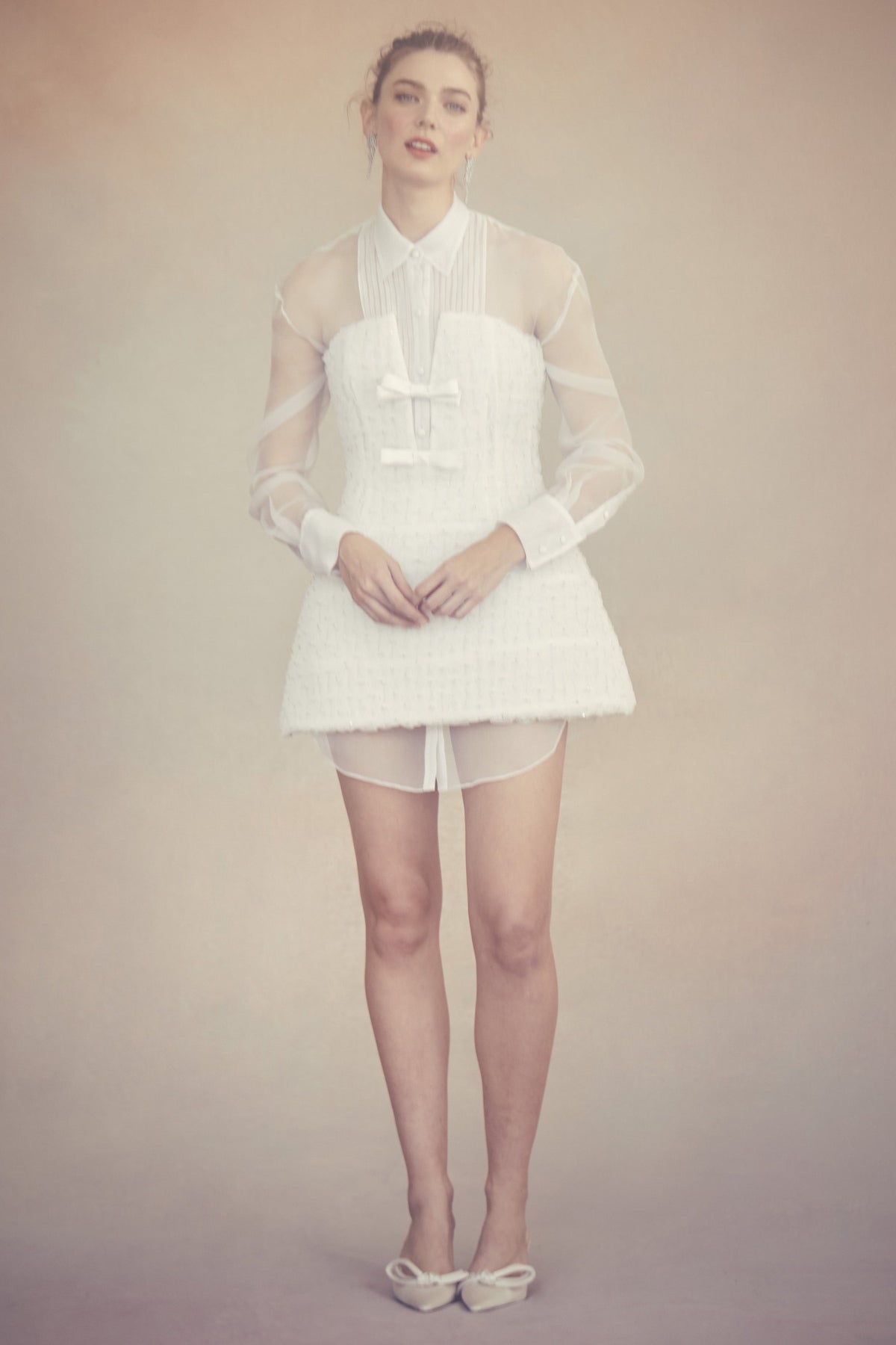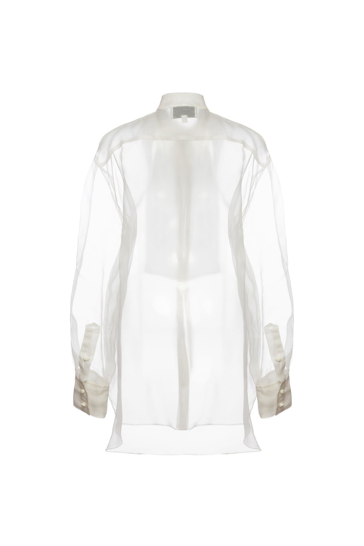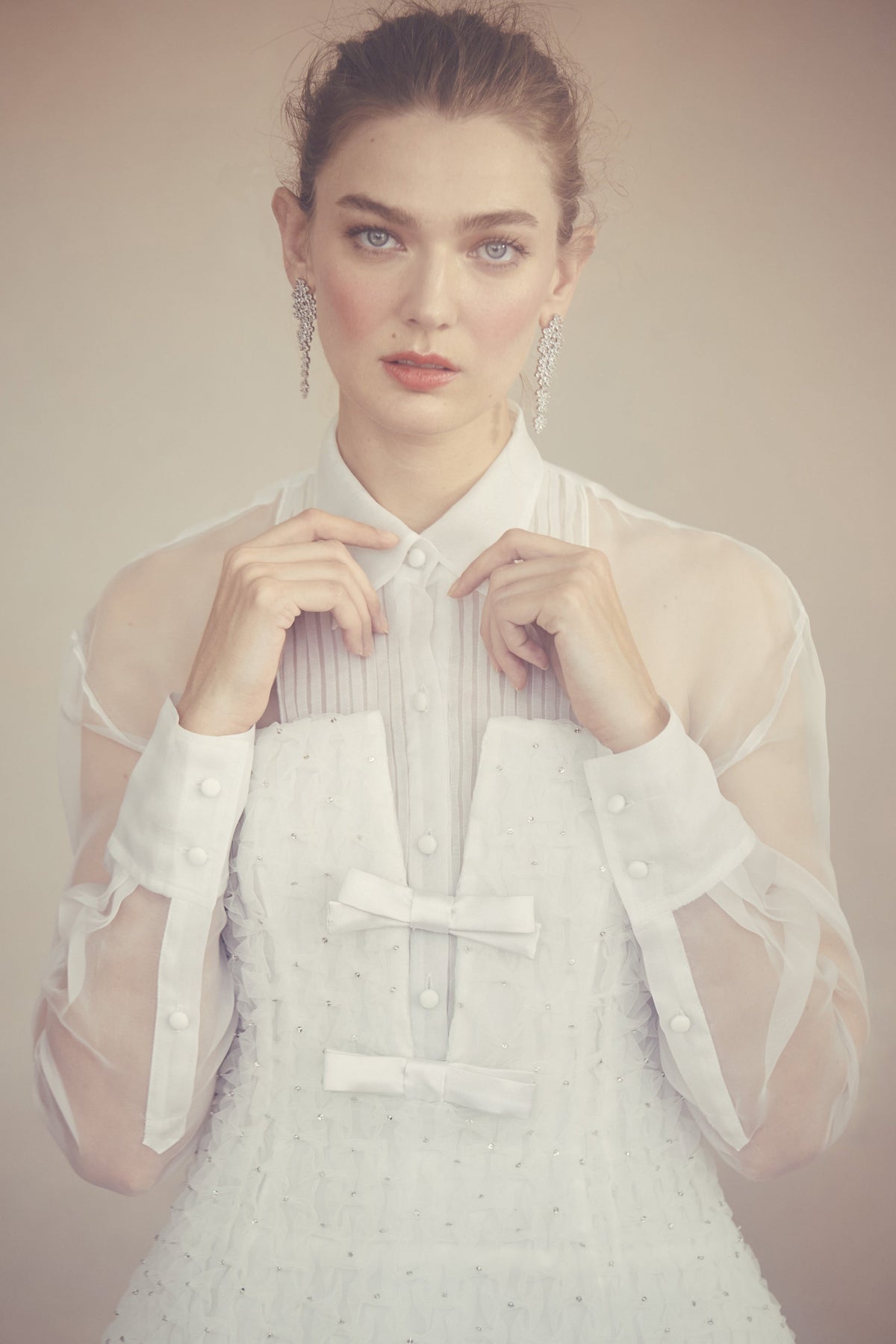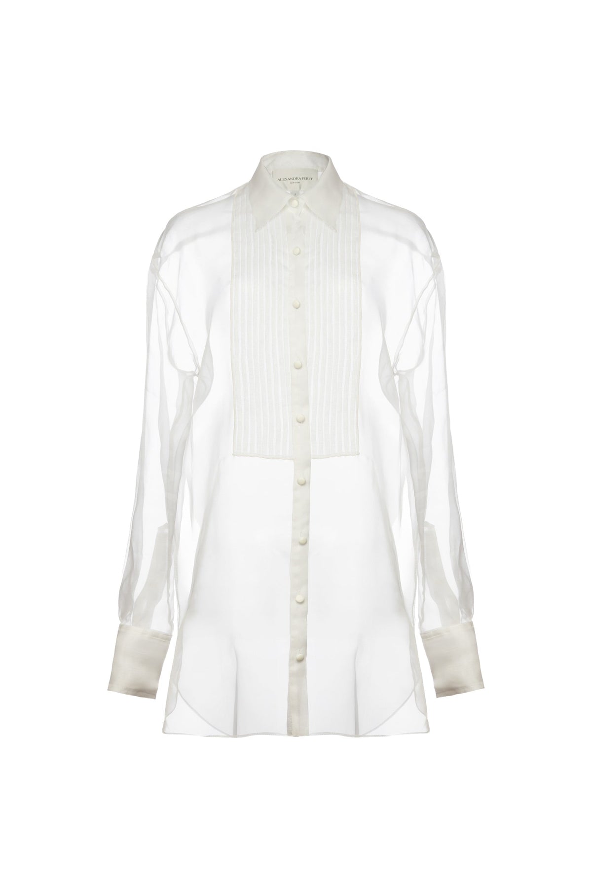 A twist on a classic, the Gigi Tuxedo Shirt is crafted from white silk organza and features delicate, pin tucked panels. This style is long enough to be worn as a shirt or dress. The Gigi Tuxedo Shirt brings elements of masculine tailoring into the bridal world, and pairs perfectly with our Felix Trouser or our Vivienne Dress. Features covered buttons.
