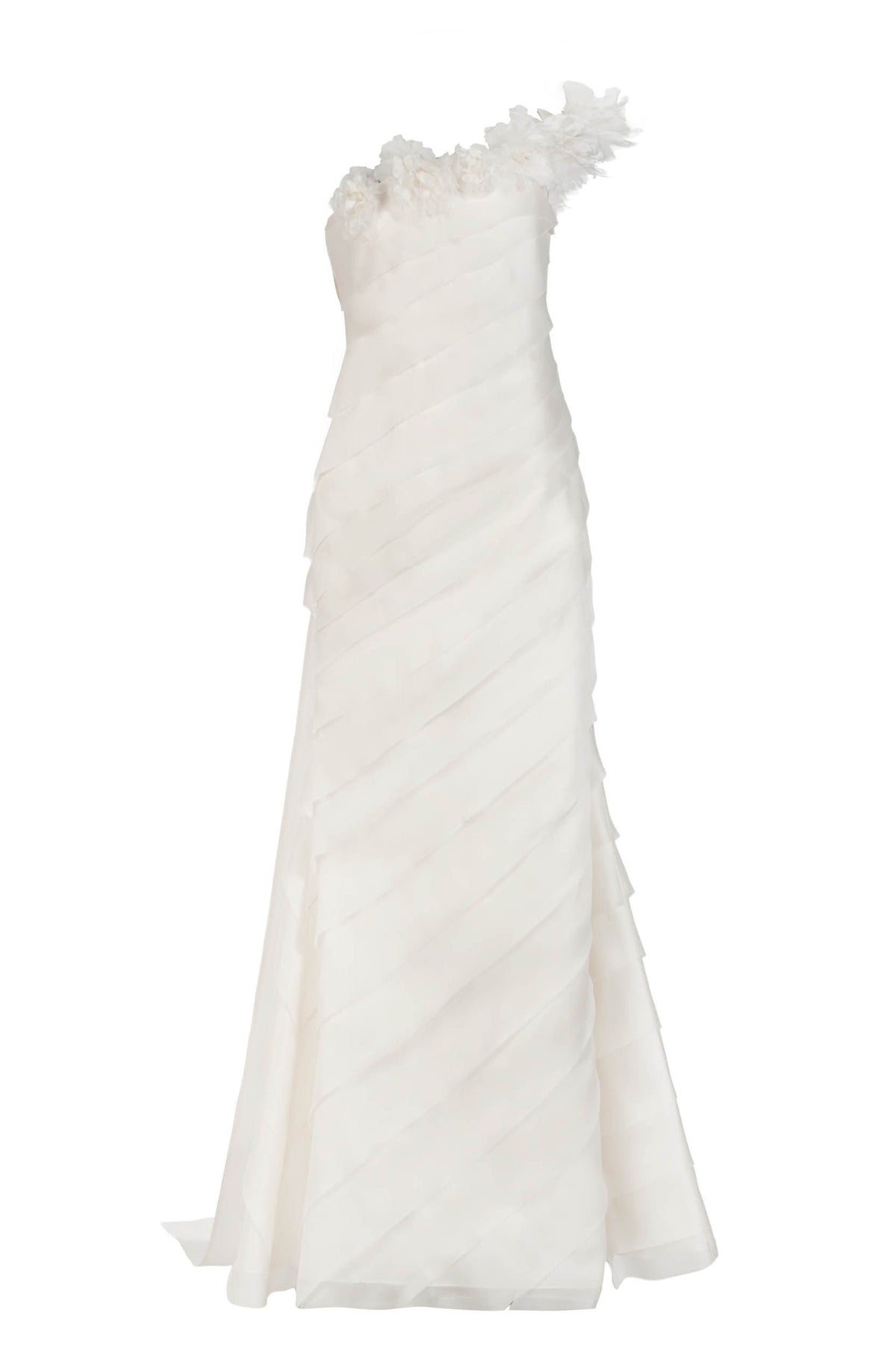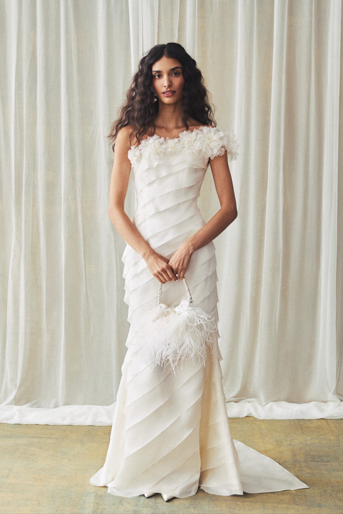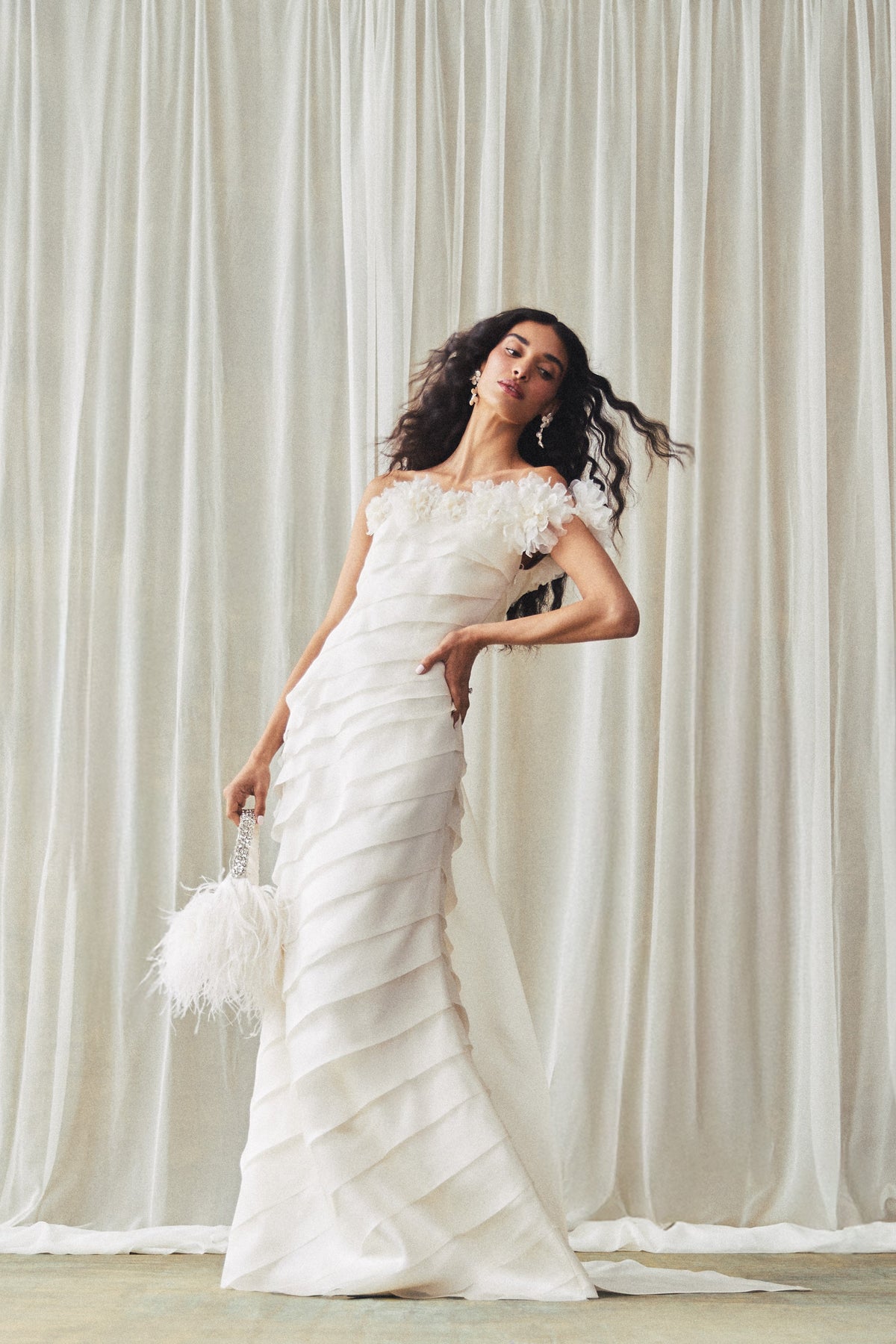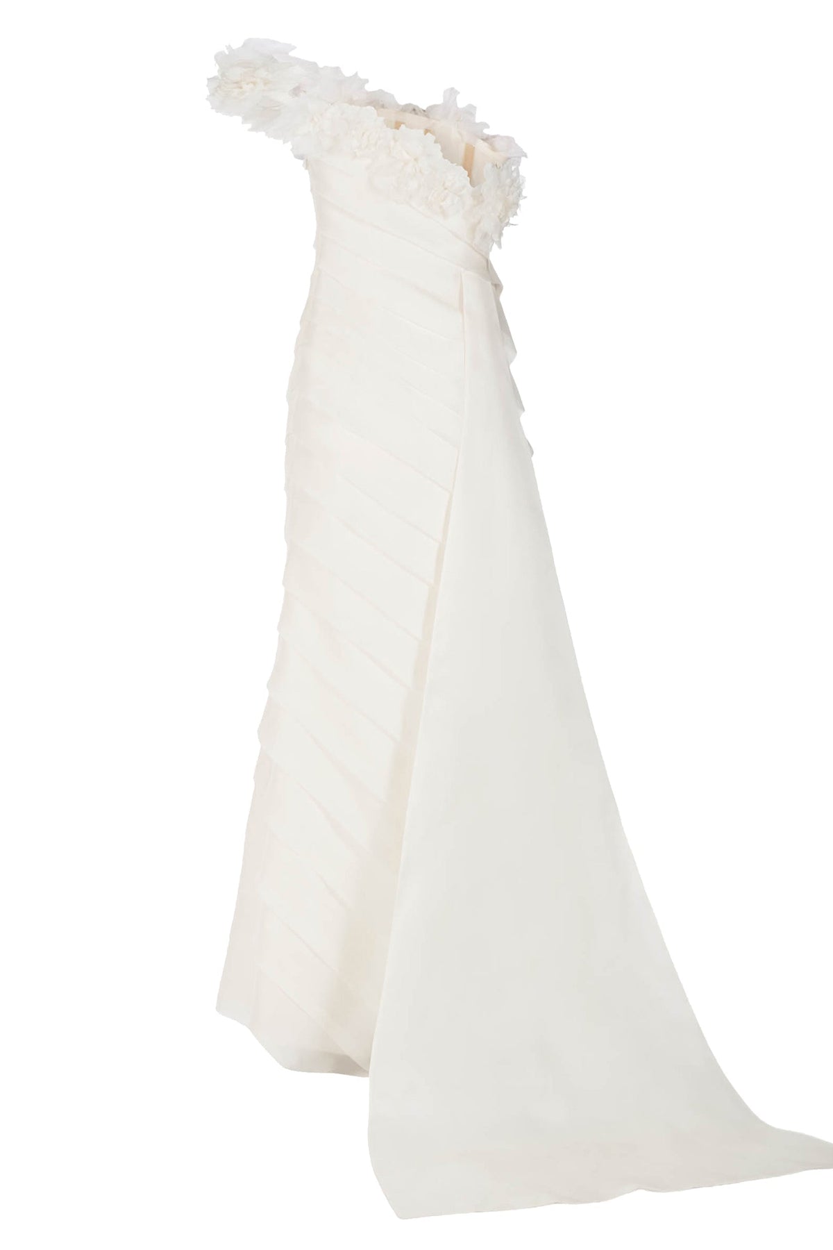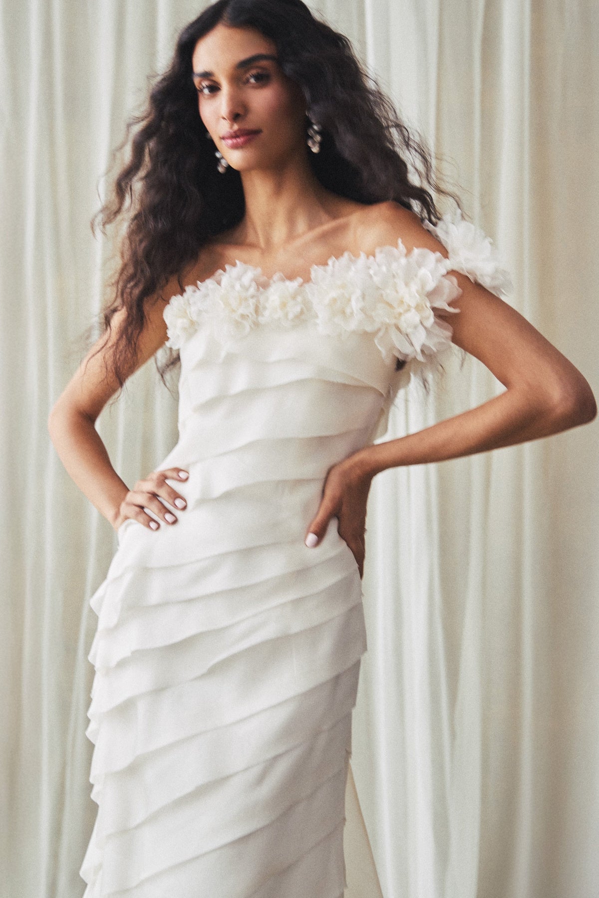 The Patti Gown in Ivory Satin Face Organza features a striking, trumpet silhouette with layers of cascading, satin face organza. Fabric flowers of varying sizes wrap around the asymmetric neckline, leading to a detachable train in the back for versatile styling. An interior corset provides structured support for a flawless fit. The Patti Gown combines refined craftsmanship with thoughtful design to elevate any formal occasion. This gown features an invisible zipper.