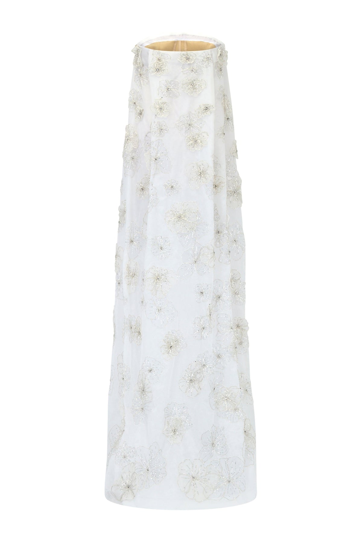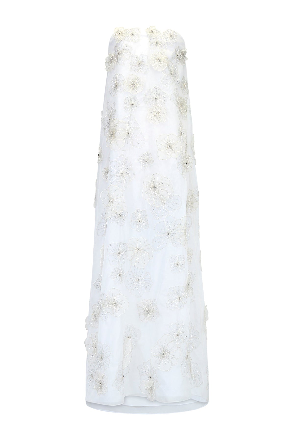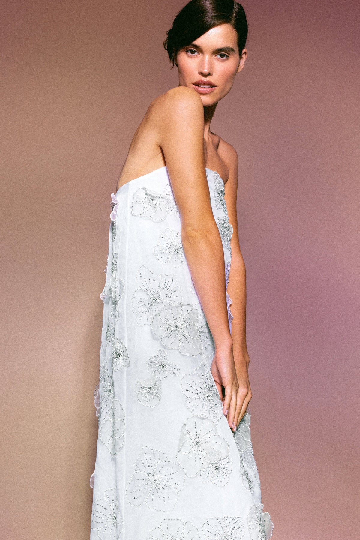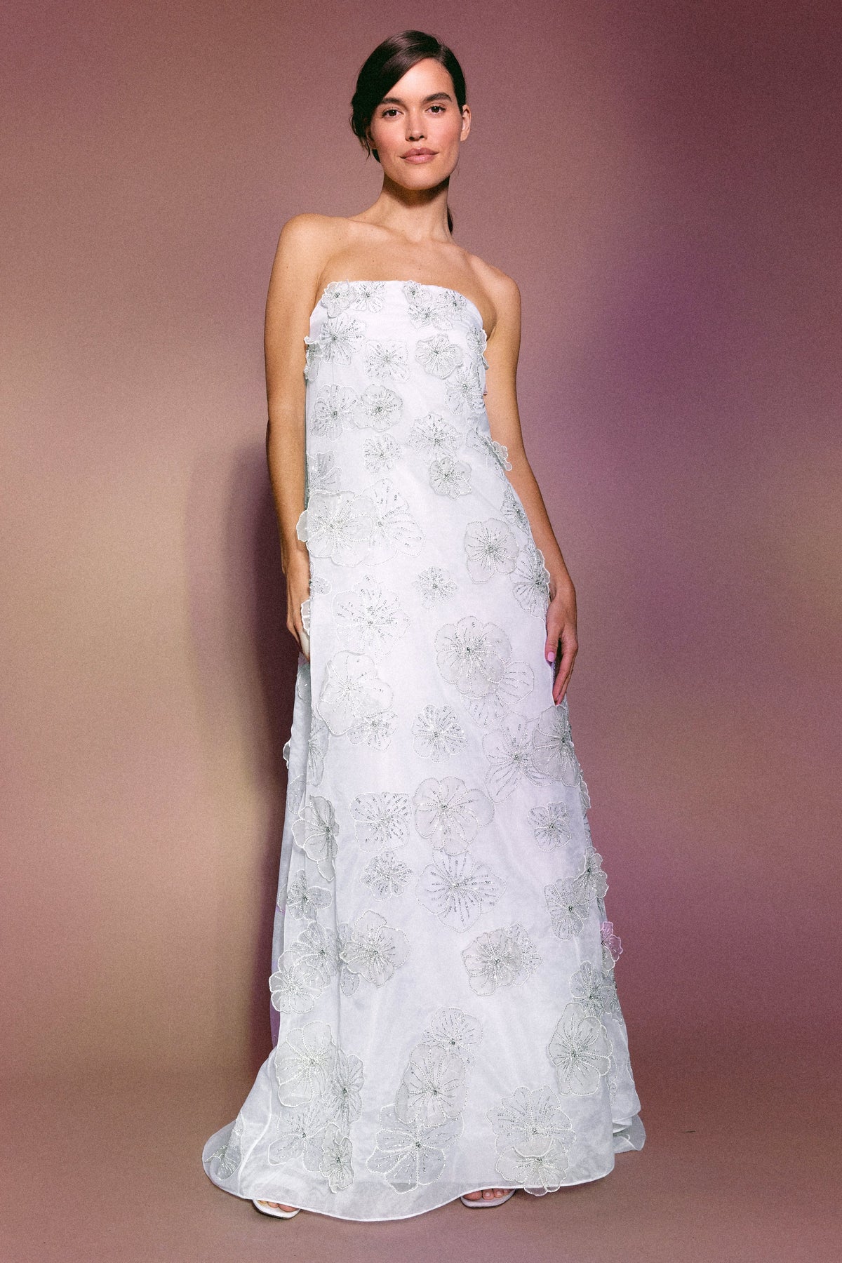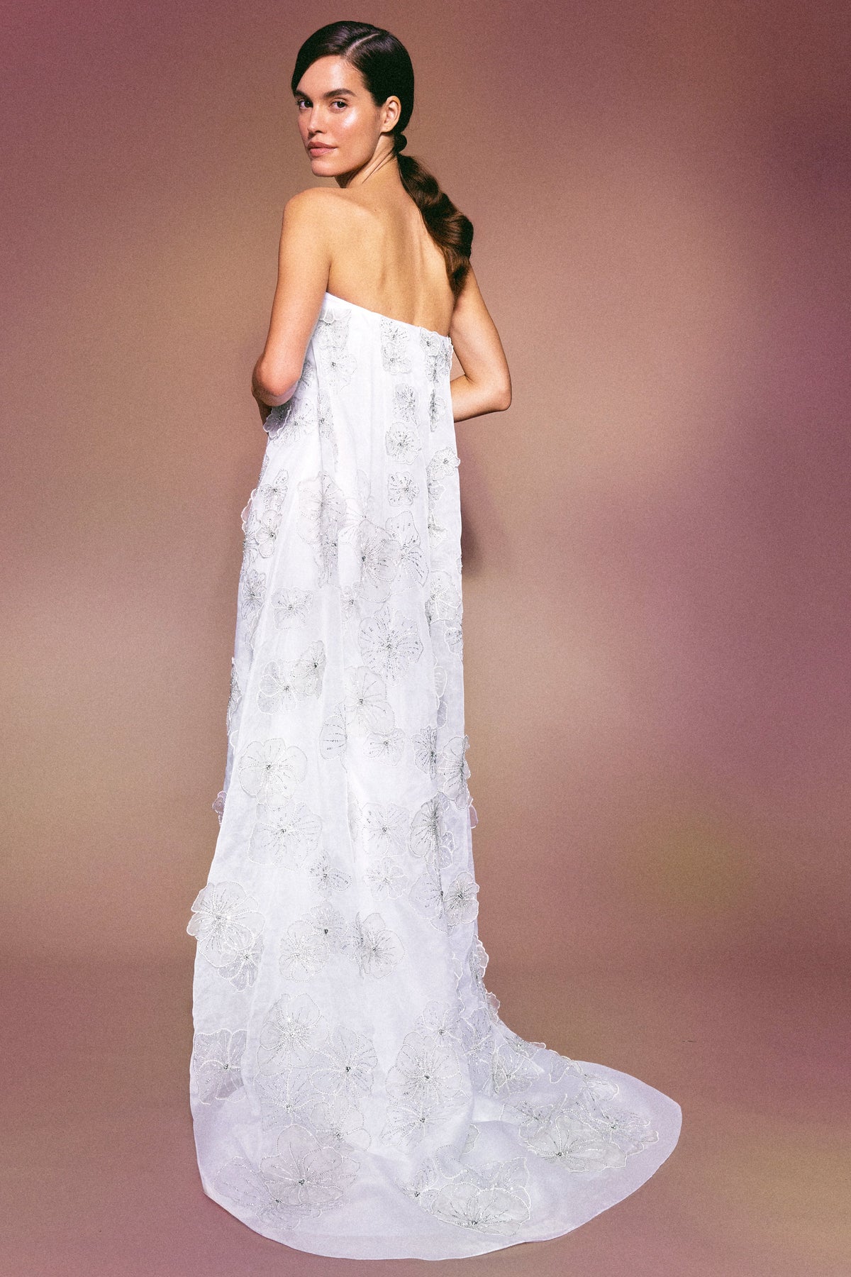 The Skye Gown from SS24 offers a clean silhouette and places focus on the couture detailing. Cut from hand embellished 3D organza flowers, this style has a strapless neckline and a subtle train that extends from pleats in the back neckline. The Skye Gown features an interior corset for added structure.