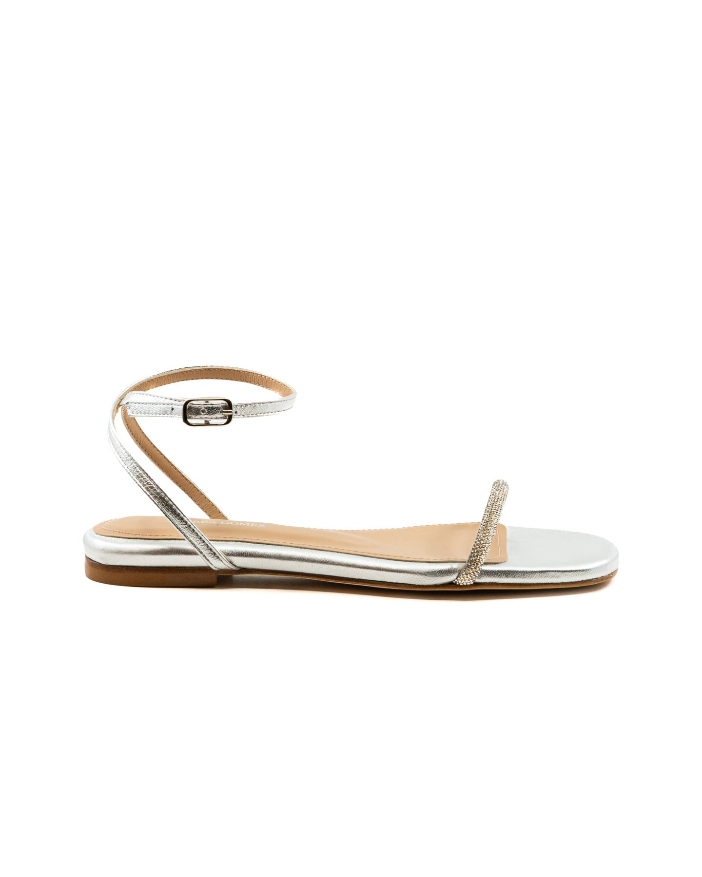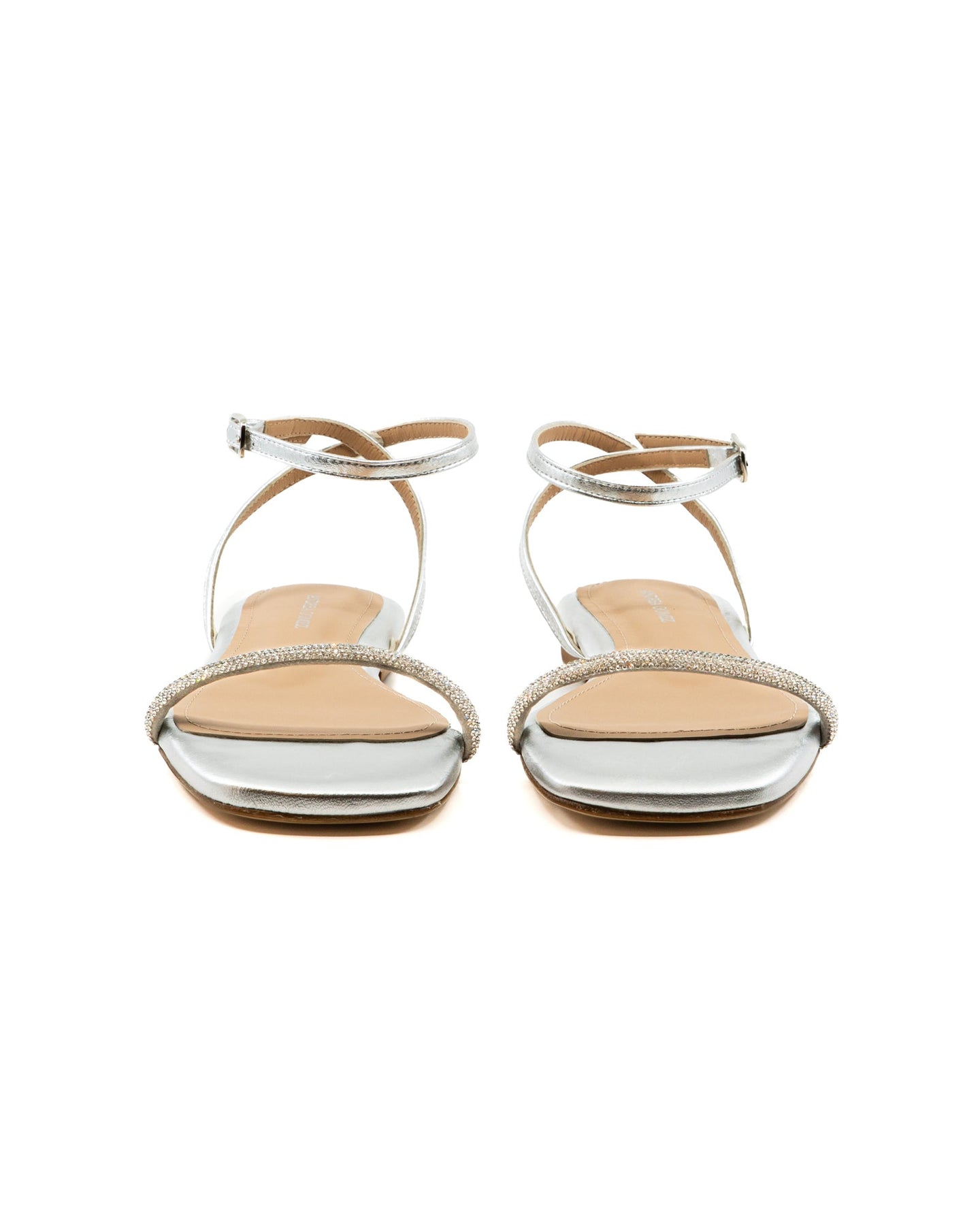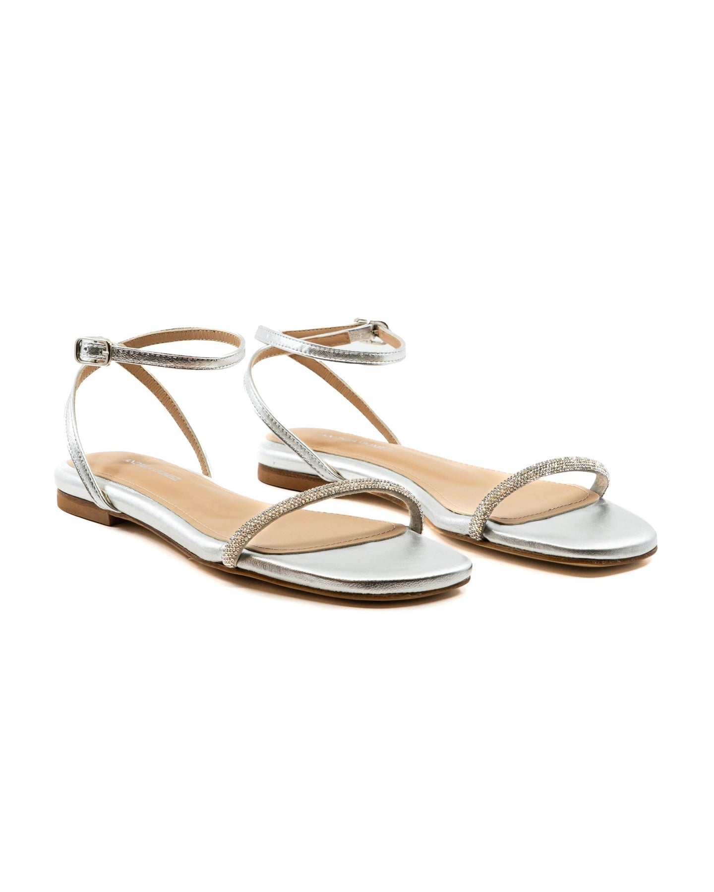 A sleek, minimalist sandal with a comfortable flat sole for all-day wear. A crystal-embellished front strap adds a touch of sparkle, making it perfect for both casual and dressy occasions.