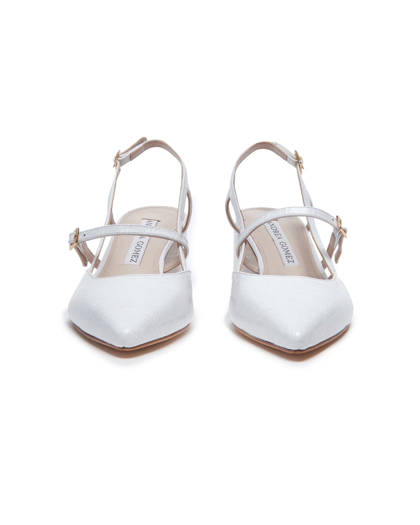 Elegant, hybrid sling-back Mary Jane. Crafted in white faux croc and accented with a slender instep strap, the contrast of a sharp toe and chunky heel is flawlessly tailored.