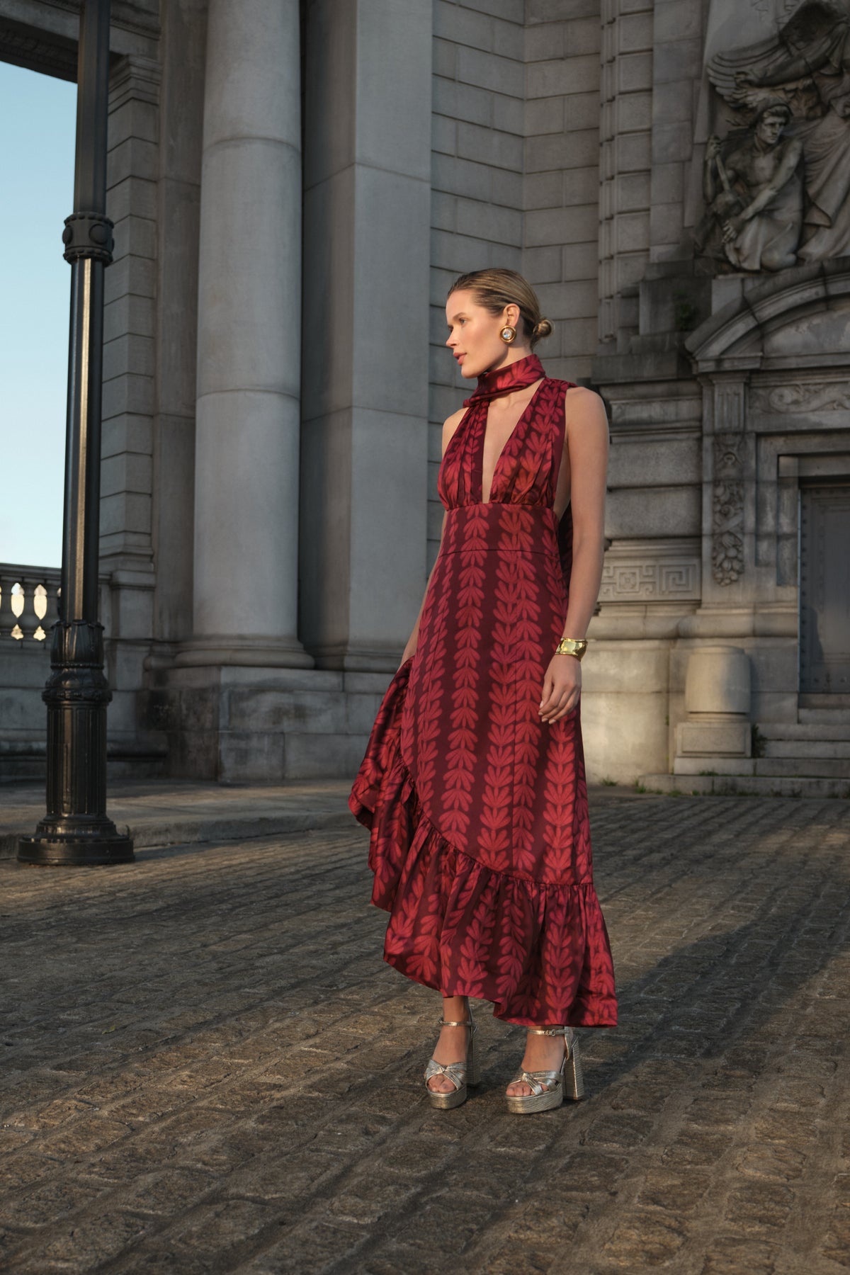 An asymmetrical dream with just the right amount of edge, the Gwendolyn Asymmetrical Ruffle Dress delivers sophisticated versatility for the modern wardrobe. The halter neckline features an adjustable tie at the back of the neck, offering multiple styling options - wear the ties loose for an effortless look, tie them into a polished bow, or knot them like a scarf for unexpected dimension. The sculptural ruffle detail creates dynamic movement and visual interest, ensuring this piece commands attention whether you're attending a holiday celebration or elevating your everyday aesthetic. The rich maroon hue provides a timeless alternative to traditional neutrals, offering depth and elegance that photographs beautifully and complements a range of skin tones. This is a statement piece designer.