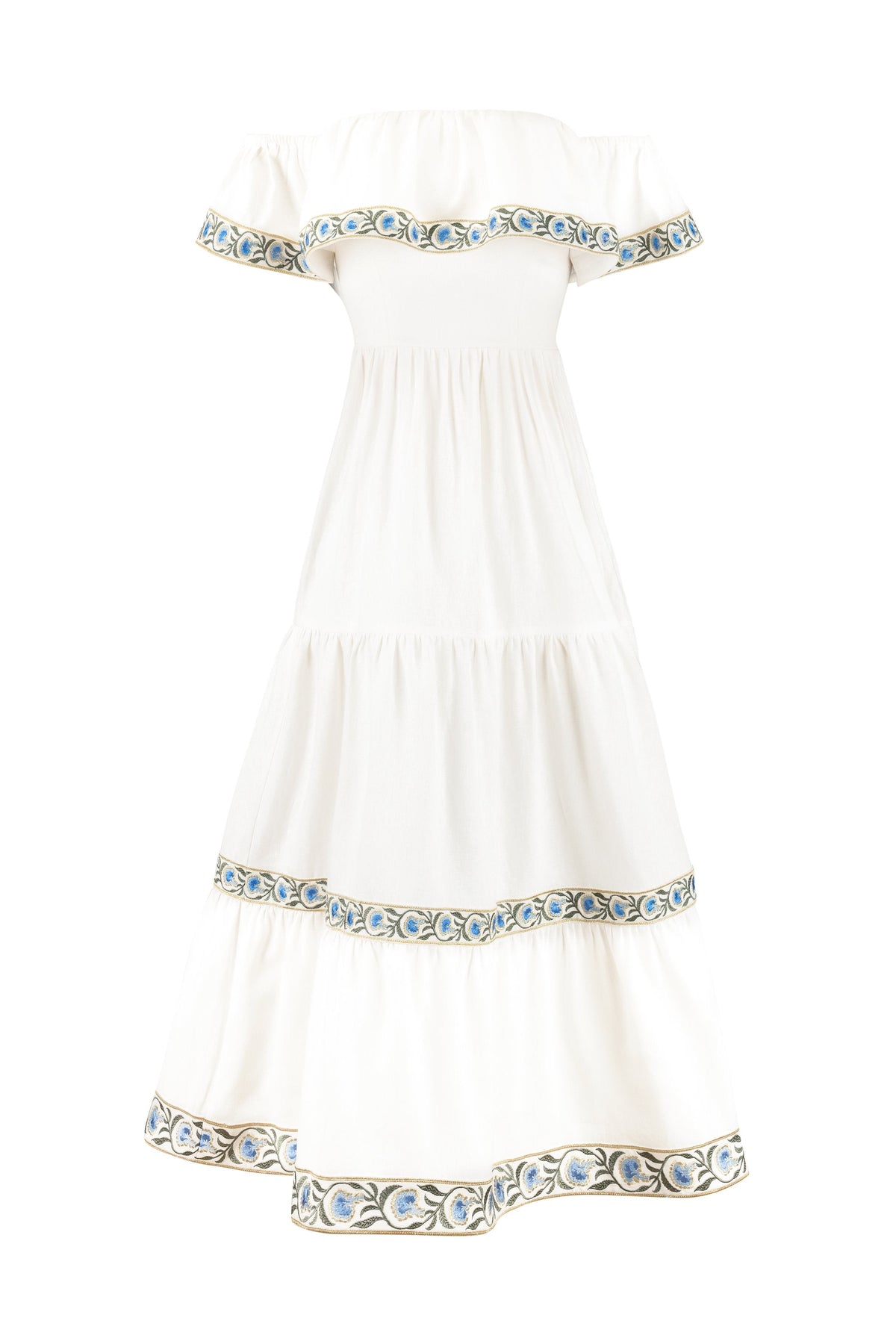 Discover our latest silhouette - a maxi tiered ruffle Dress, featuring our iconic carnation embroidery. Featuring an off the shoulder ruffle top, with an optional embroidered belt, this is the ultimate spring and summer cocktail look.