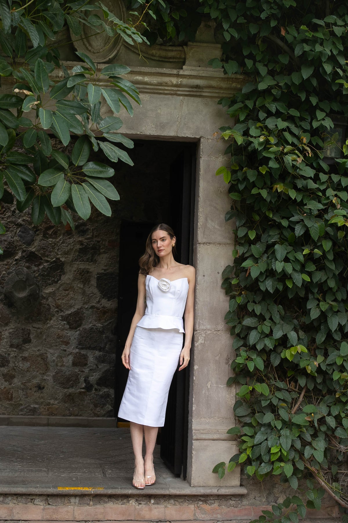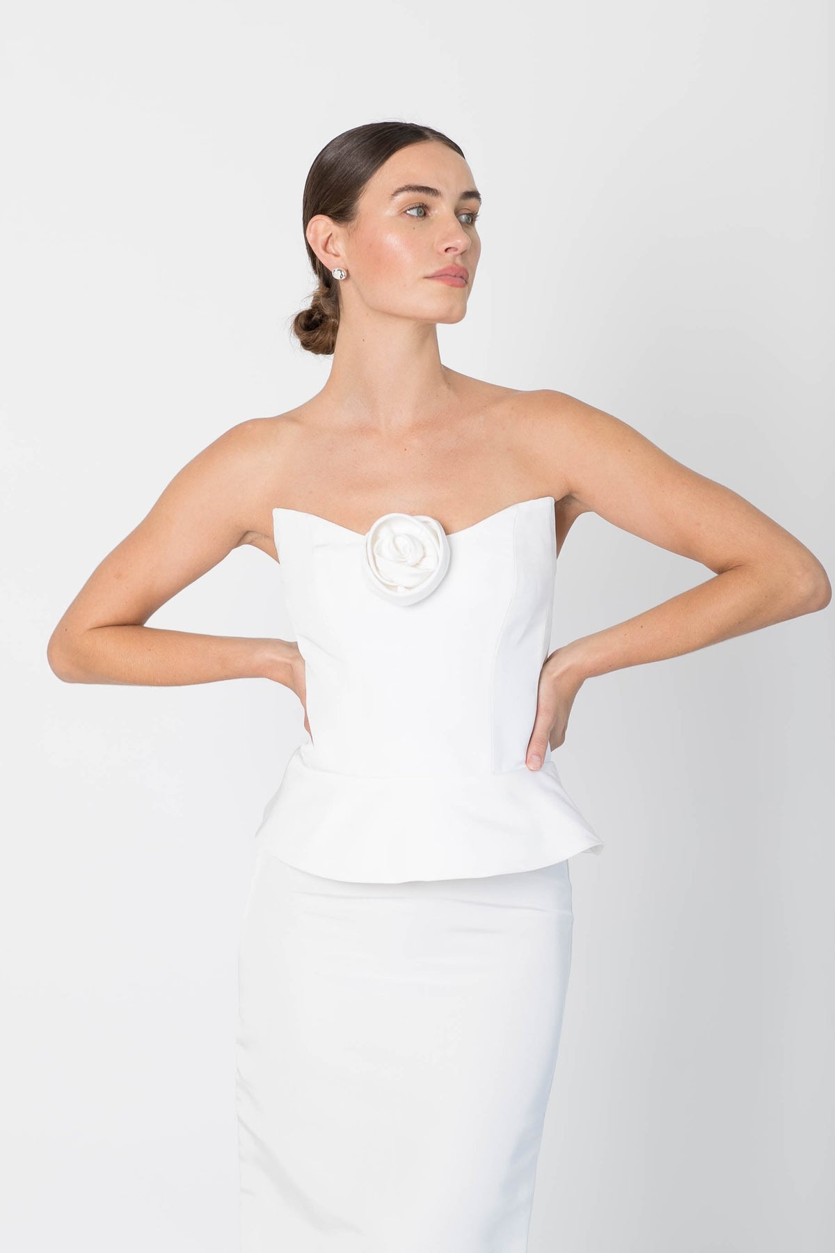 The Delicias Corset Top is a modern take on romantic sophistication. Crafted in a structured silhouette, this strapless corset features a sweetheart neckline adorned with a delicate fabric rosette. A subtle peplum detail at the waist enhances the silhouette, sculpting a flattering shape.