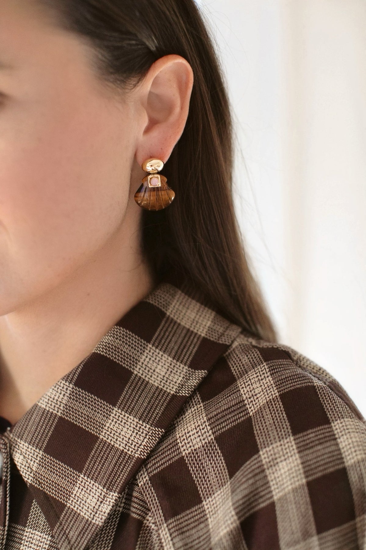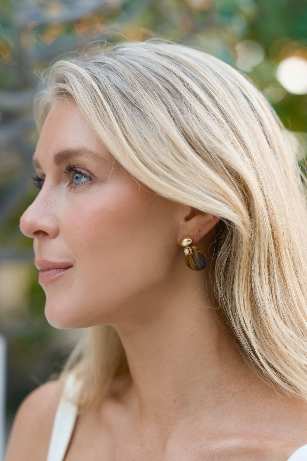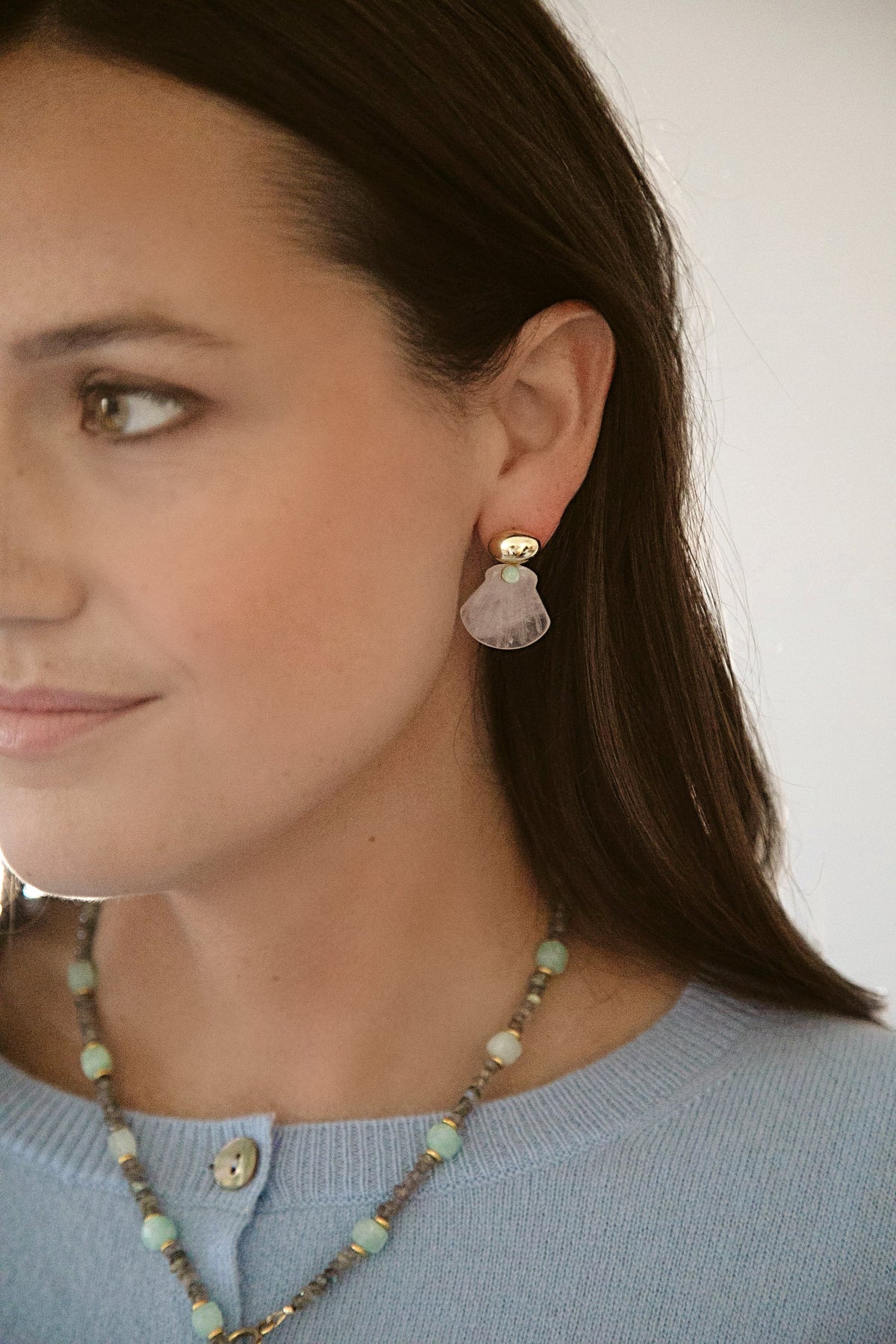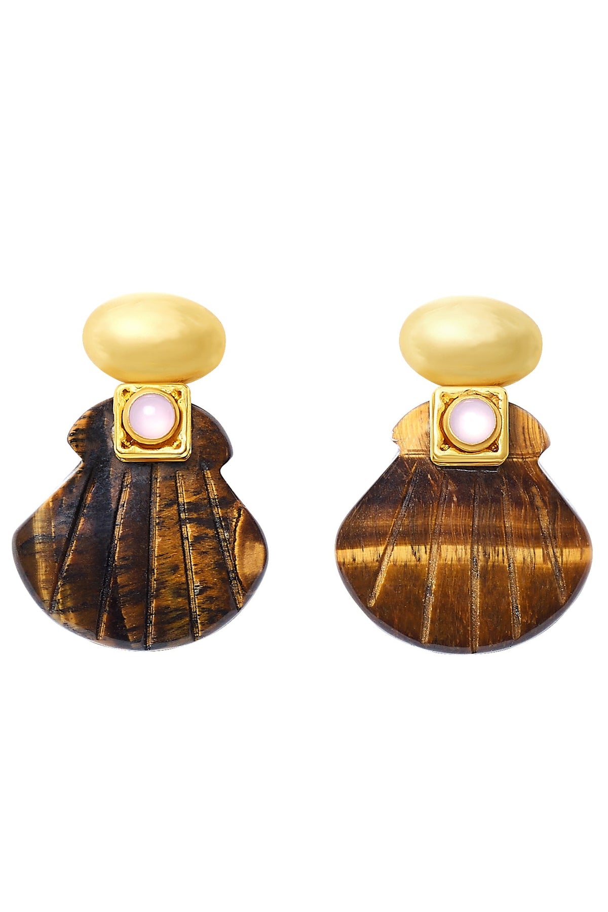 - Hand-carved gemstone shells with Swarovski crystal and glass detailing are on 24k antique gold plated ovoid toppers