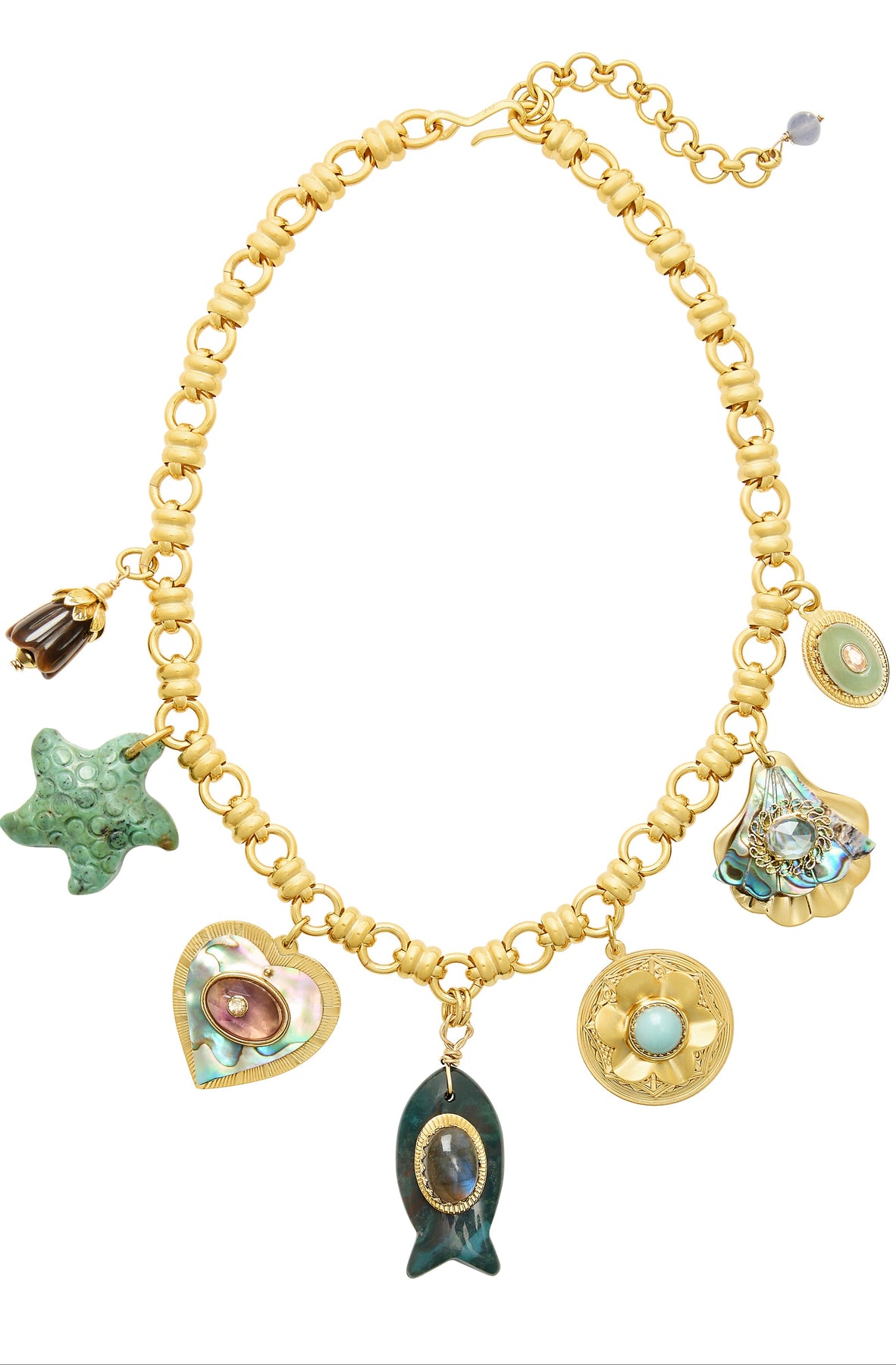 • A 24k antique gold plated chunky round link chain with an eclectic assortment of semi-precious and 24k gold plated charms.