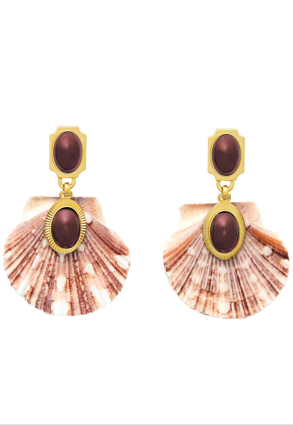 - Baby flat scallop shells hang from 24k antique gold plated toppers set with garnet cabochons on stainless steel hypoallergenic posts