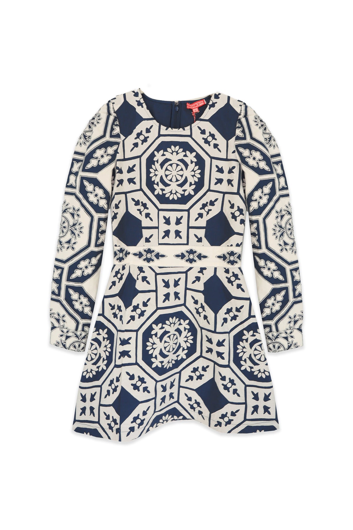 Meet our Catherine Mini Dress, a piece that celebrates the artistry and history of Portuguese tile work. Born from Lawson's MFA thesis collection, this standout mini is entirely appliquéd with a tile-inspired motif. The leg-of-mutton sleeve and tailored fit strike the perfect balance of structure and softness. From cocktail hour to date night, this one’s made to turn heads.