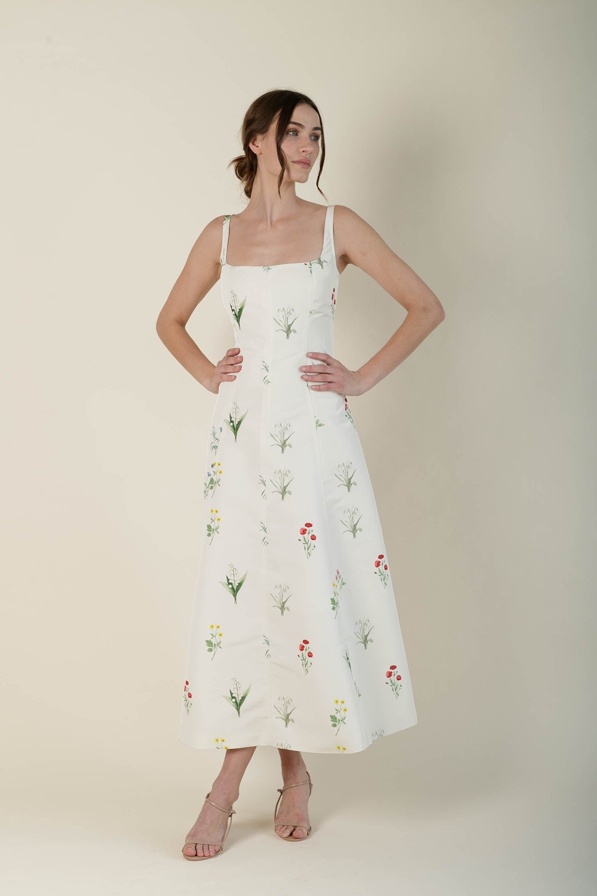 Set against an ivory ground, the botanical print features delicate stems and tiny blossoms.