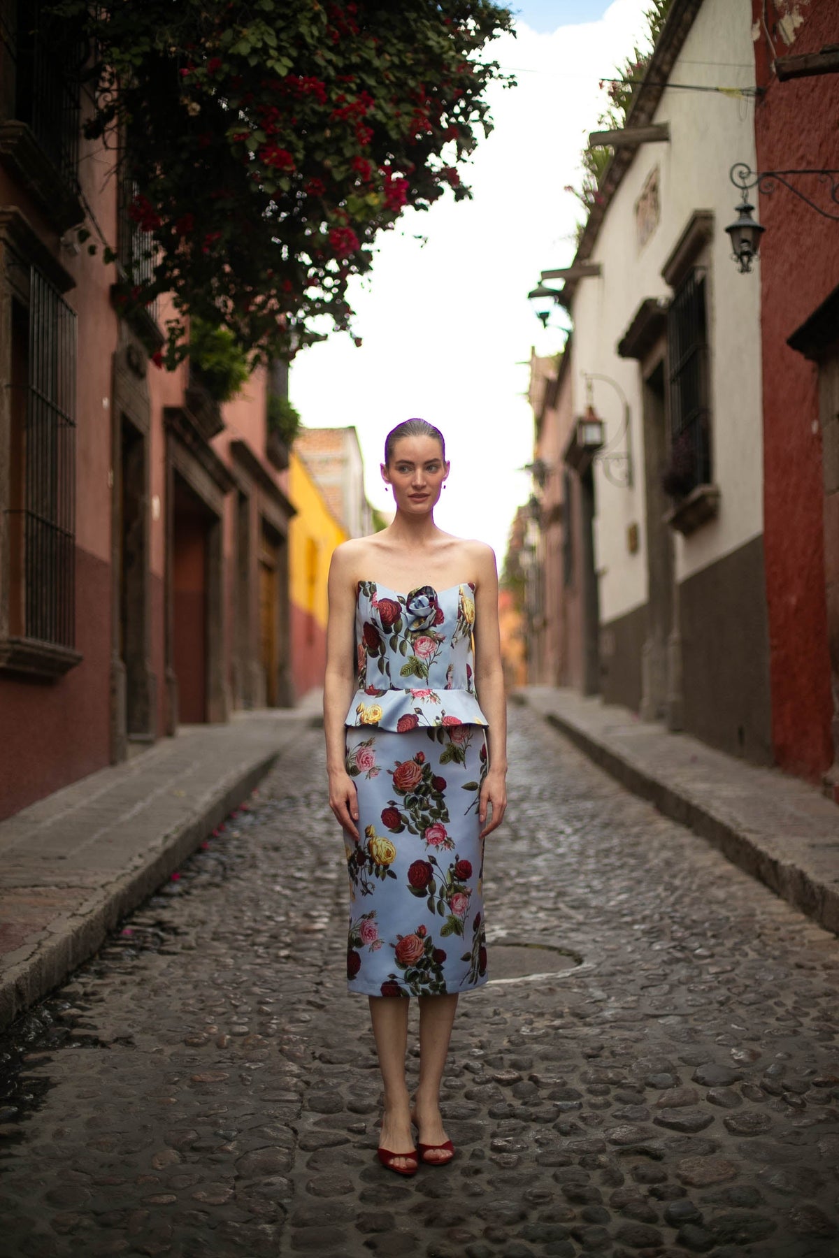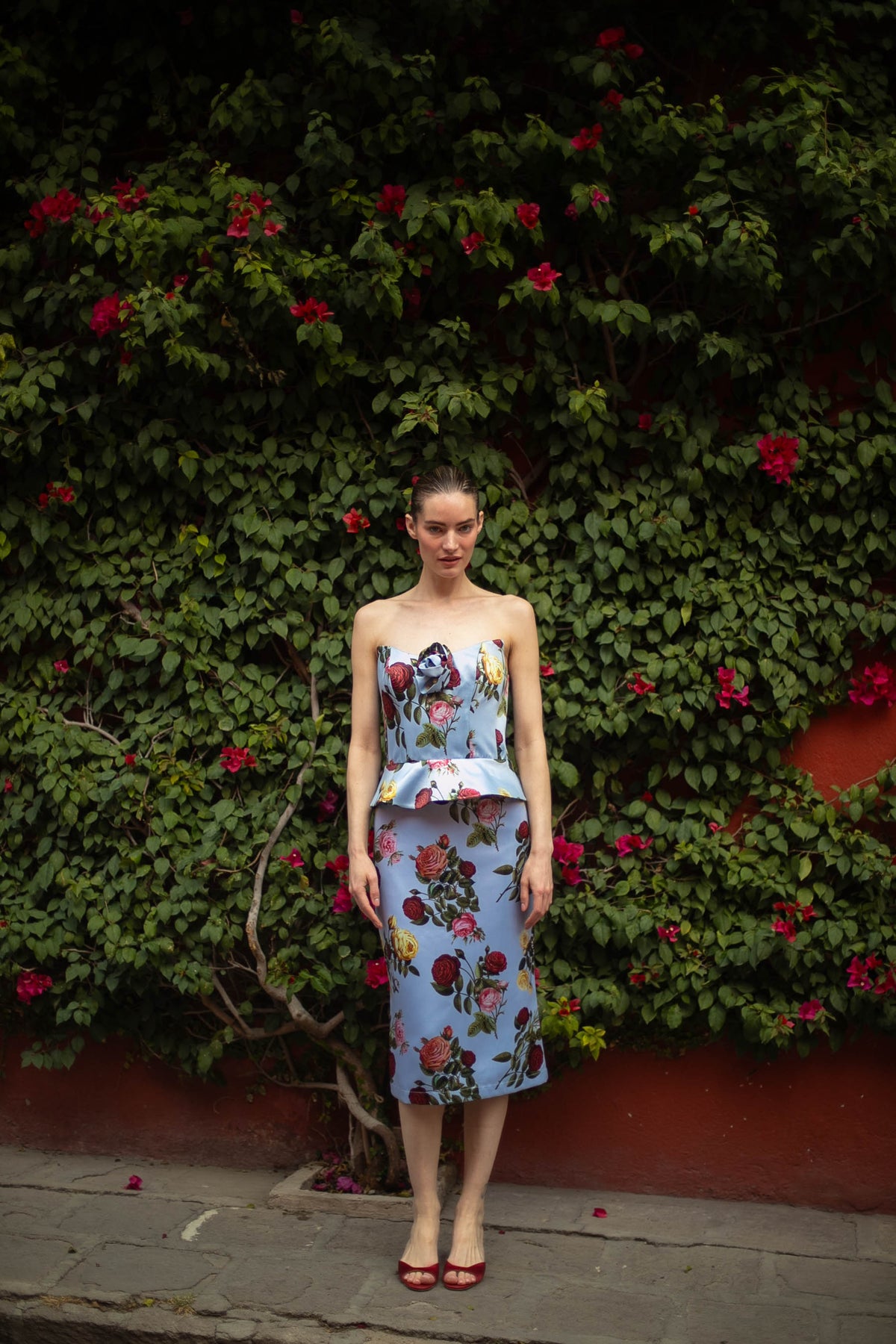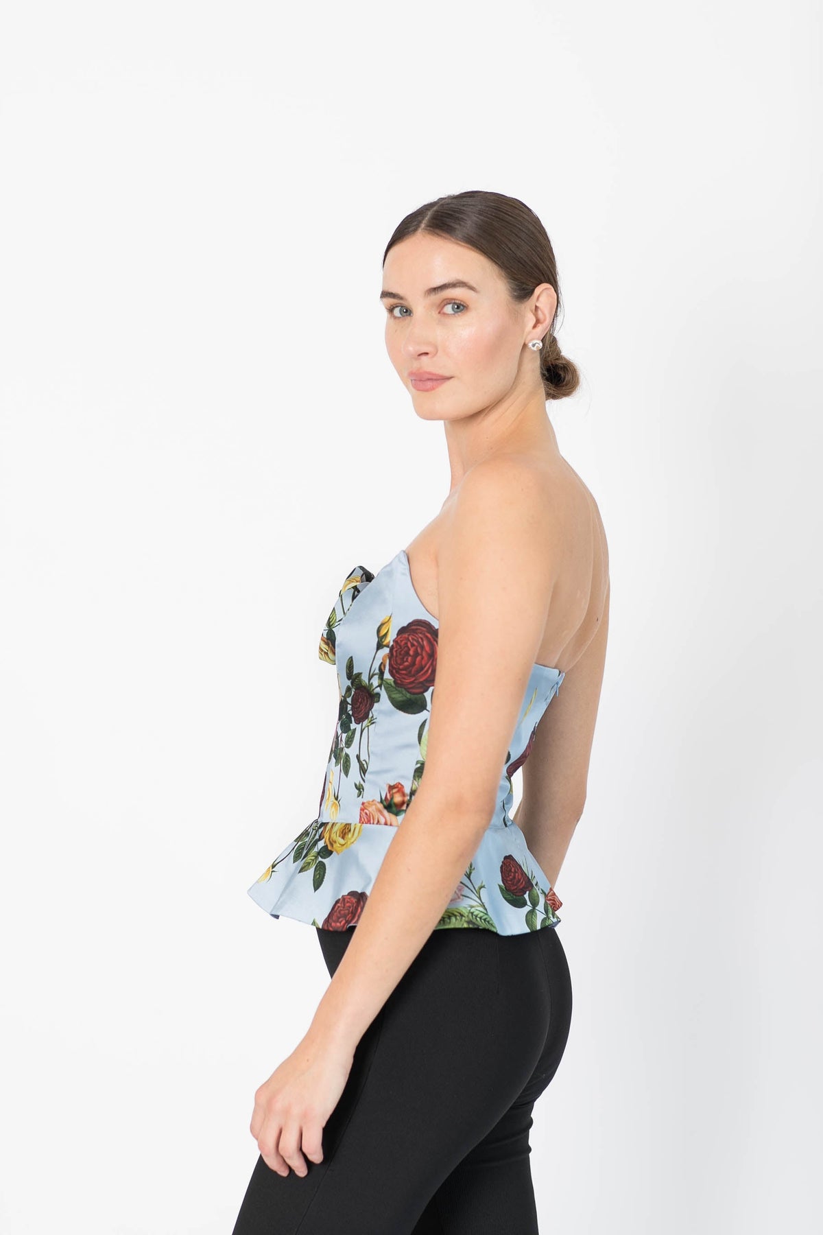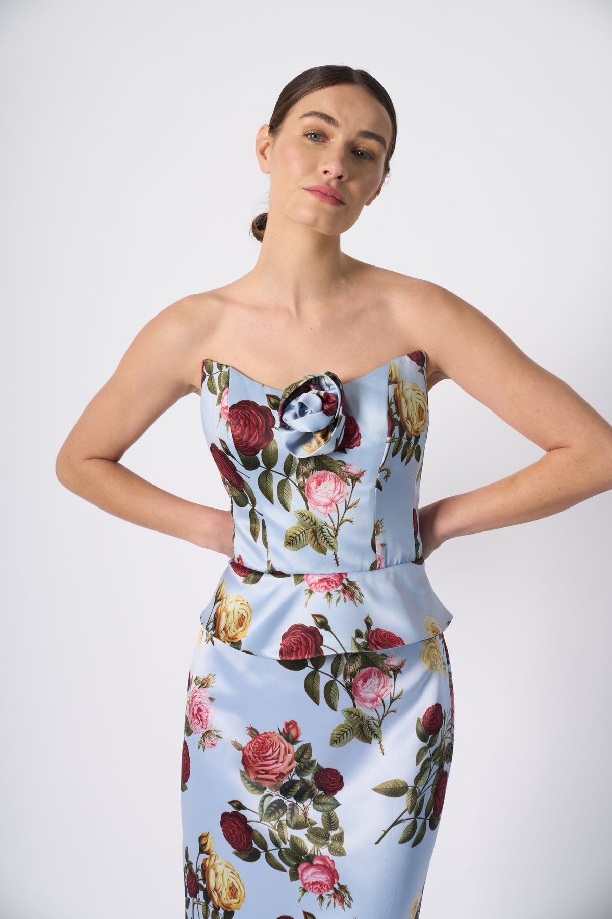The Delicias Corset Top is a modern take on romantic sophistication. Crafted in a structured silhouette, this strapless corset features a sweetheart neckline adorned with a delicate fabric rosette. The soft sky-blue fabric is decorated with blooming roses, creating a striking contrast between classic romance and contemporary tailoring. A subtle peplum detail at the waist enhances the silhouette, sculpting a flattering shape.