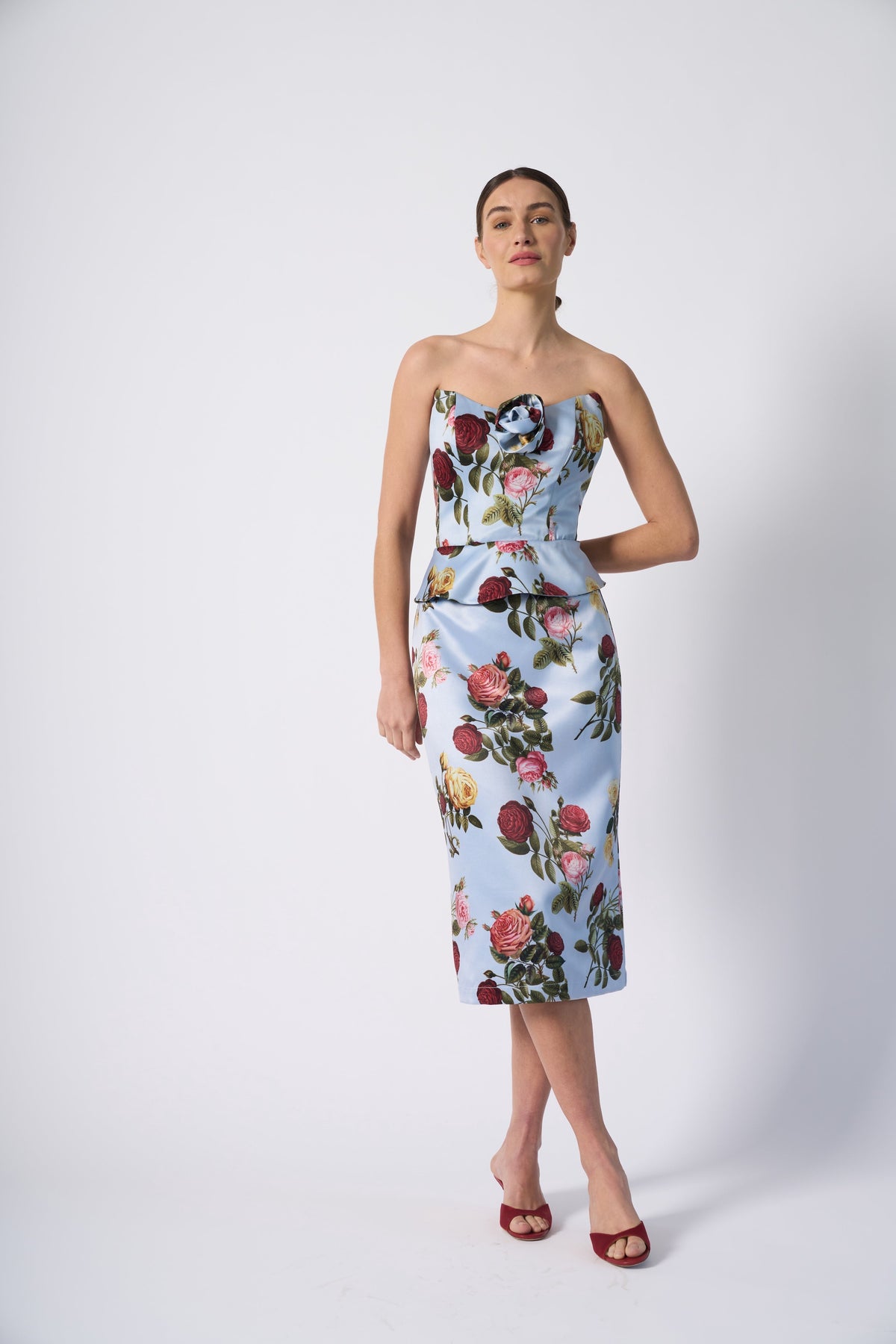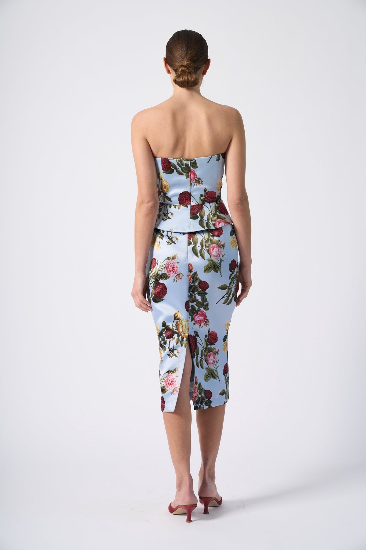 The Delicias Skirt is designed to captivate. Crafted from a lustrous sky-blue fabric adorned with a blooming roses, this pencil skirt offers a refined silhouette.