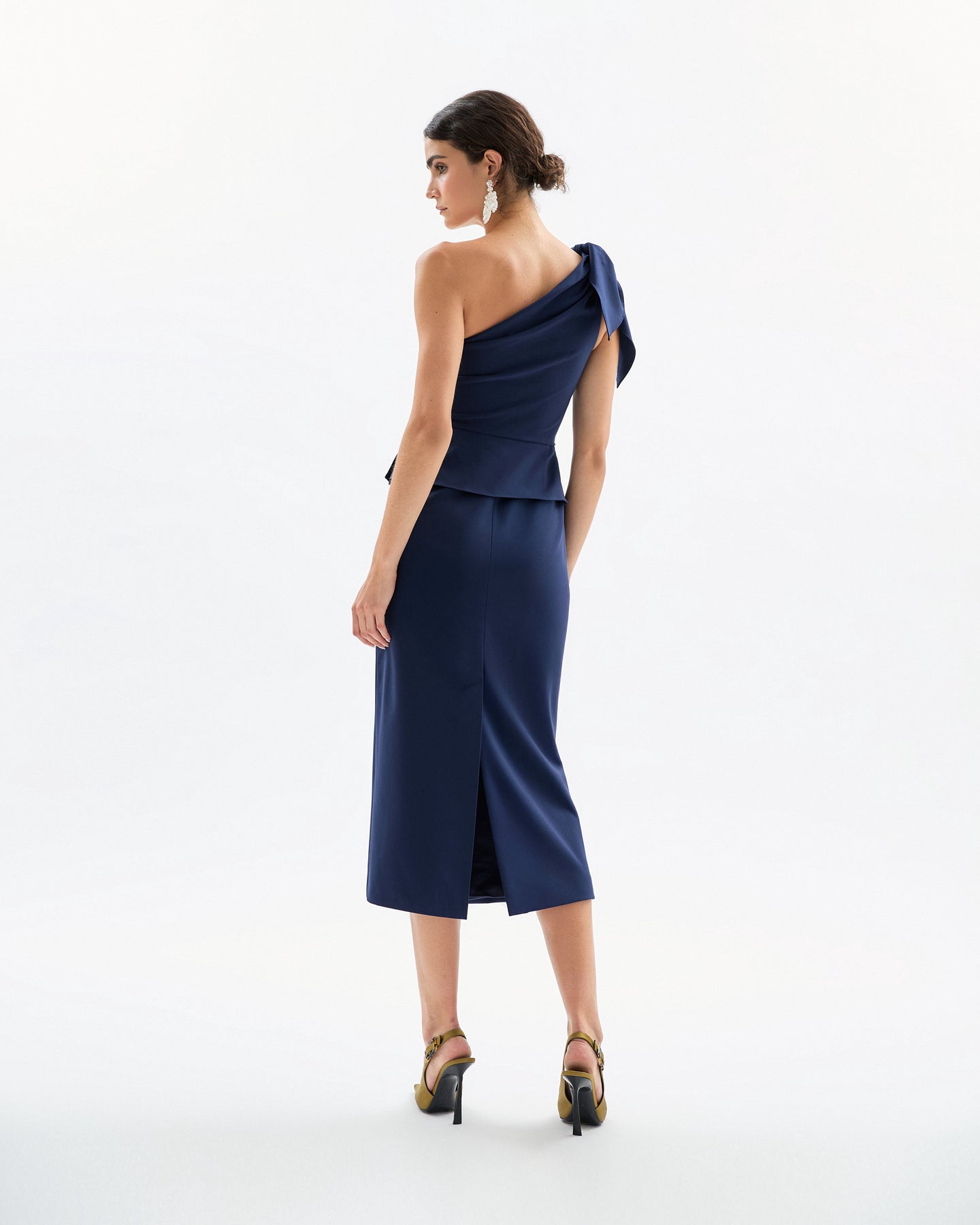 The Cyn Dress is a professional, form-fitting garment designed to accentuate the wearer's curves. Made from stretch crepe material, this one-shoulder, sleeveless midi dress is both flirtatious and commanding, providing a flattering silhouette.