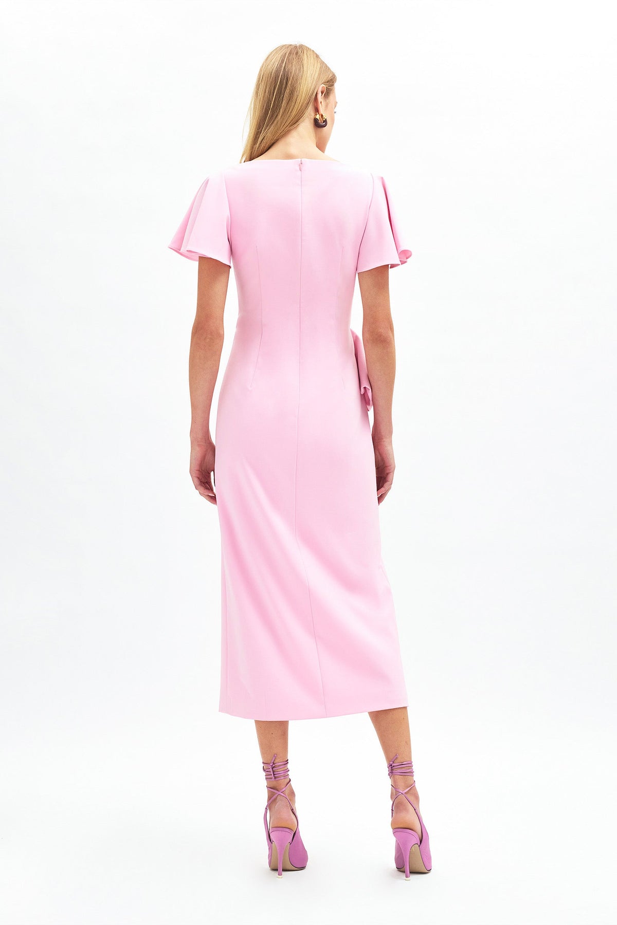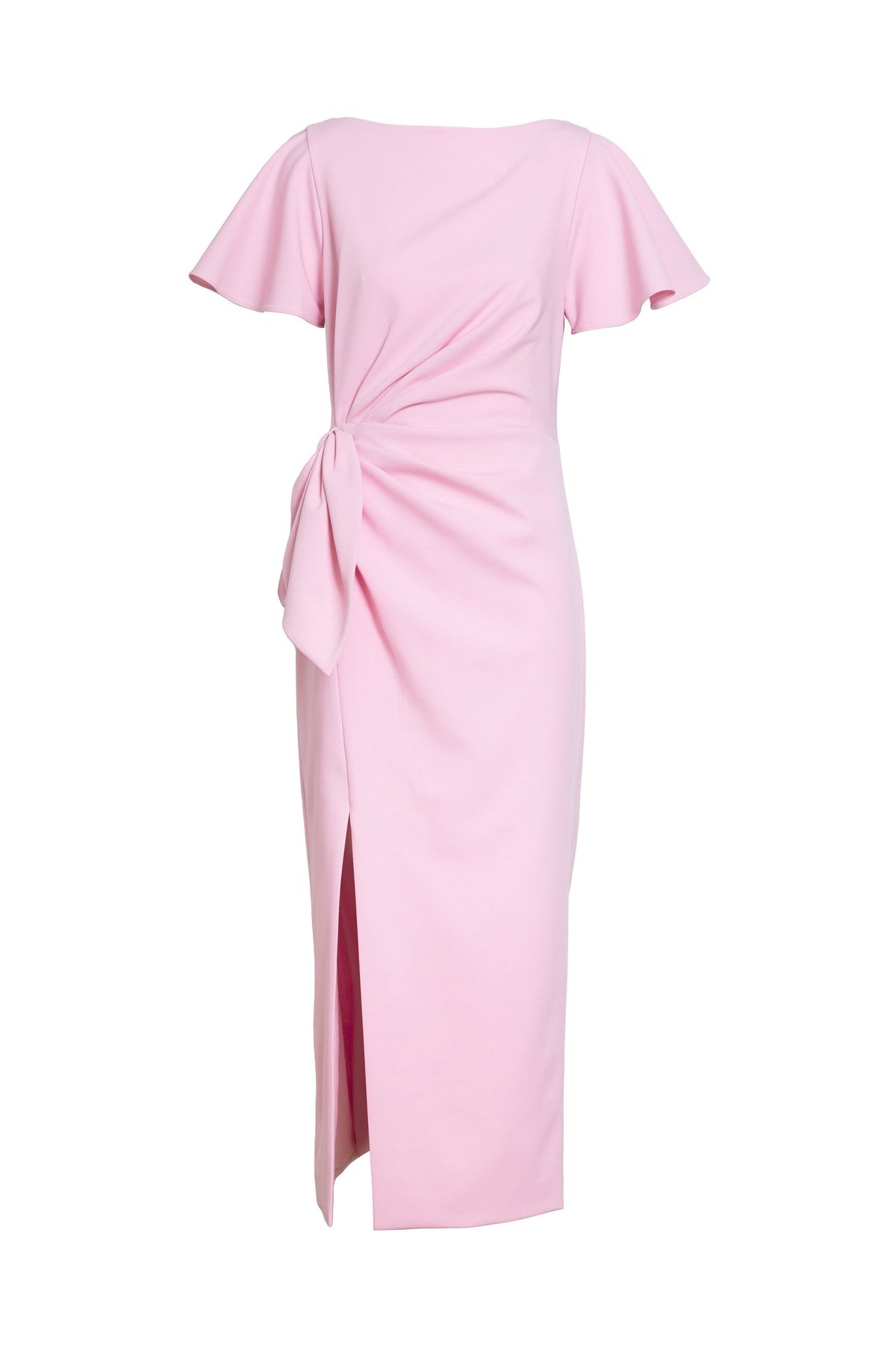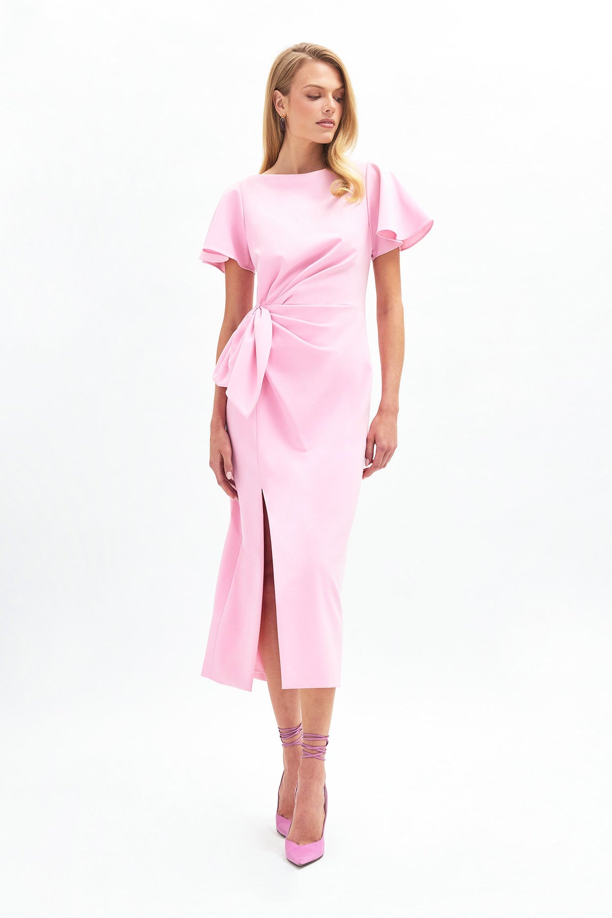 A fitted midi-length dress with a fluttered sleeve that whispers grace and a bow cinched at the waist like a secret—she’s perfectly timed for a standing ovation. She has a hint of stretch and the slit? Just a little drama after the second cocktail.