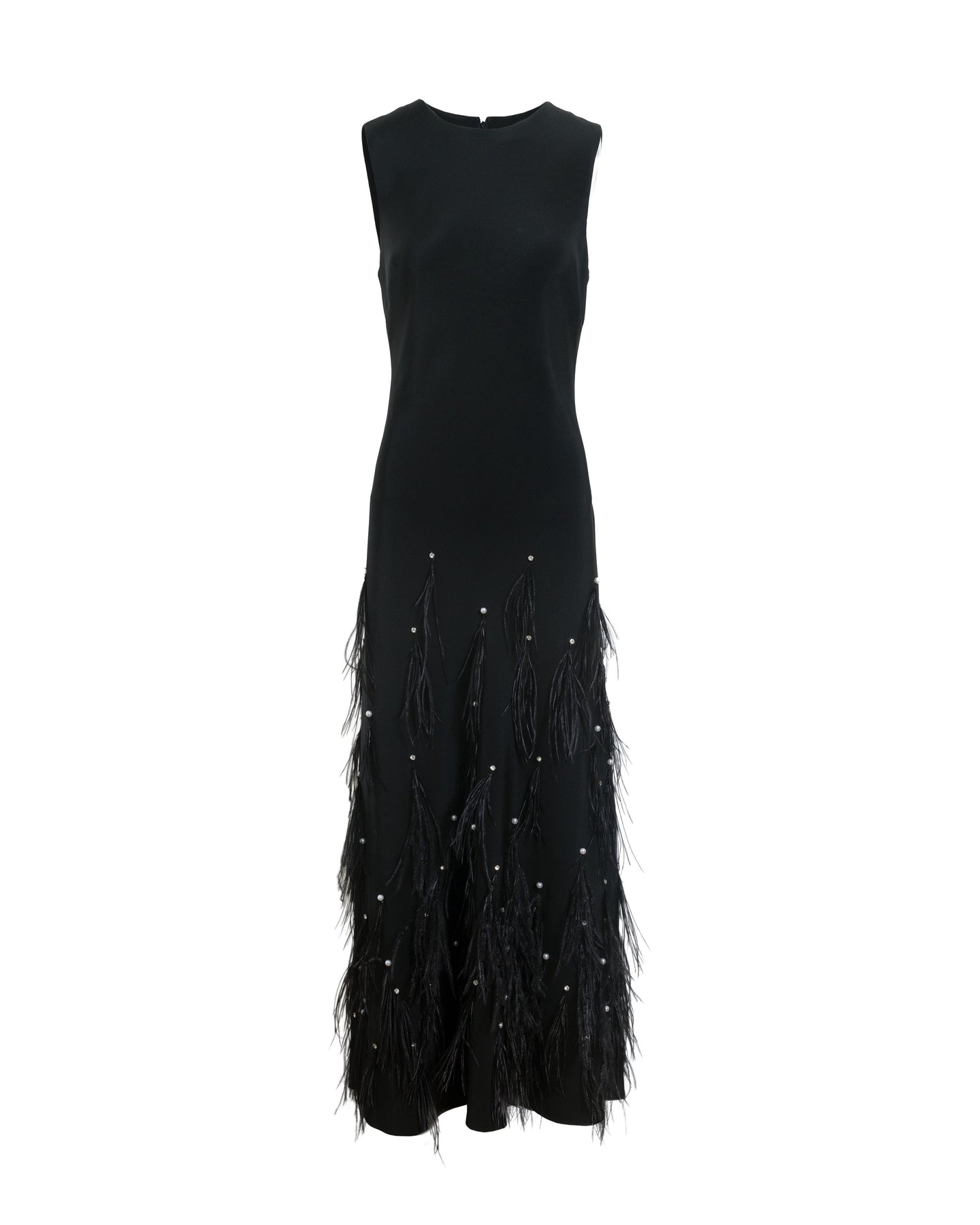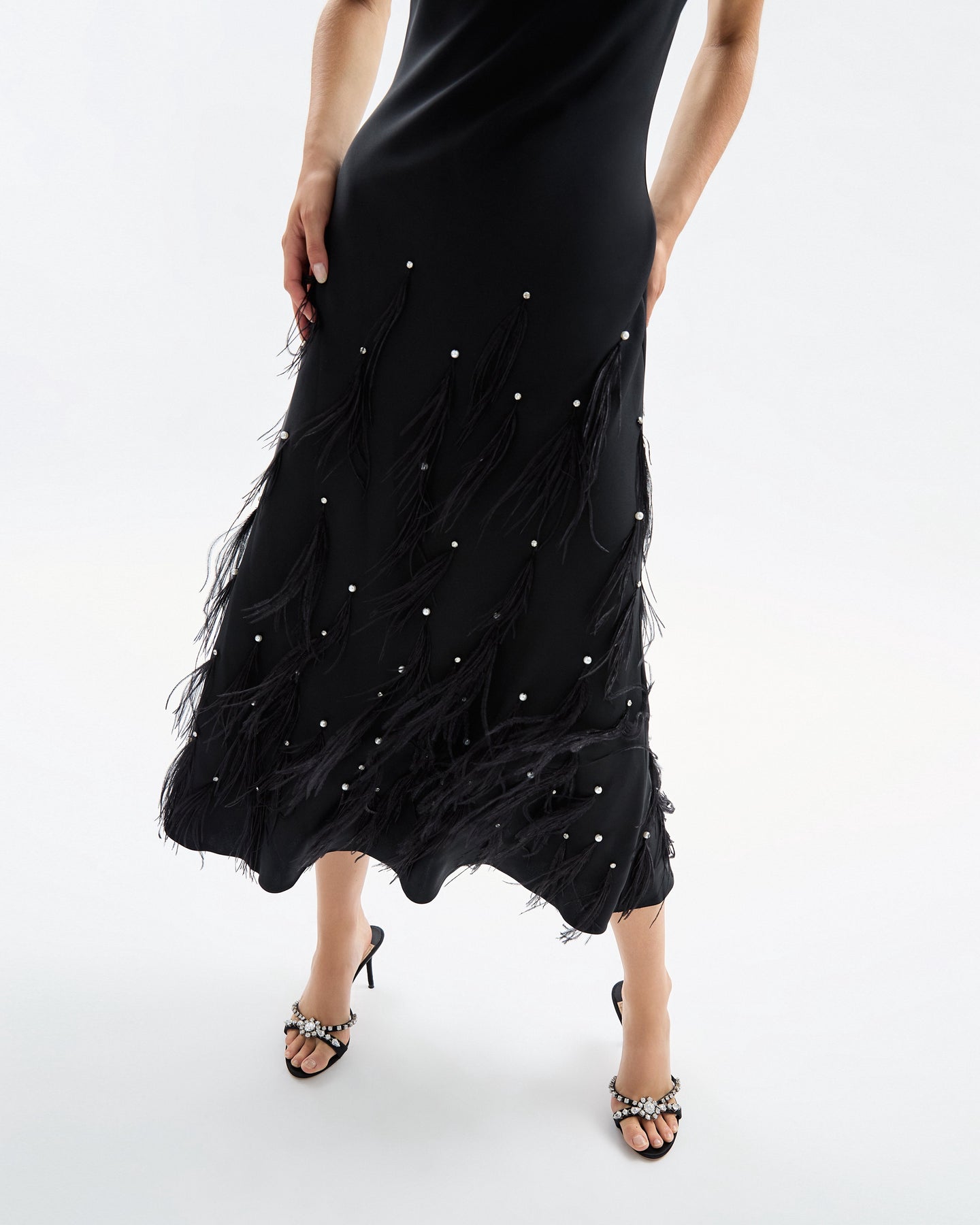 She is a crew neck fully lined midi dress with a bias cut in a 100% smooth silk fabric. Feathers and pearls sway with every step. Just don’t let her catch you looking.