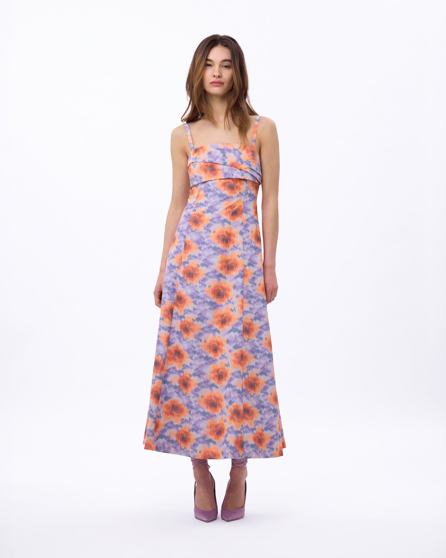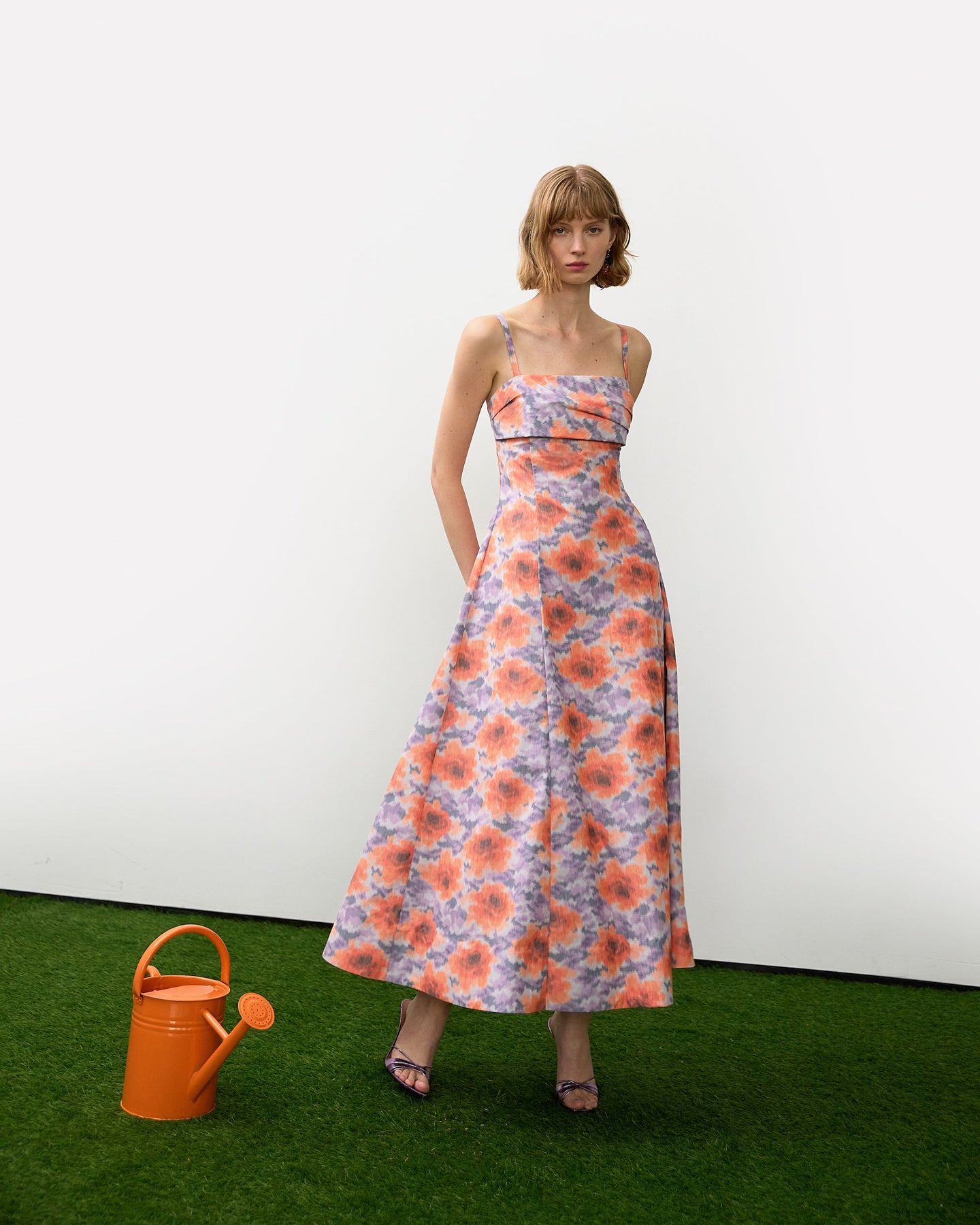 Meredith stands out in the crowd. Punchy apricot and lavender combine to give an energized print update on jacquard fabric. She has structure and will hold a flattering elongated shape. Did we mention she’s super flattering at the hips with a feminine, flirty charm in its hemline?