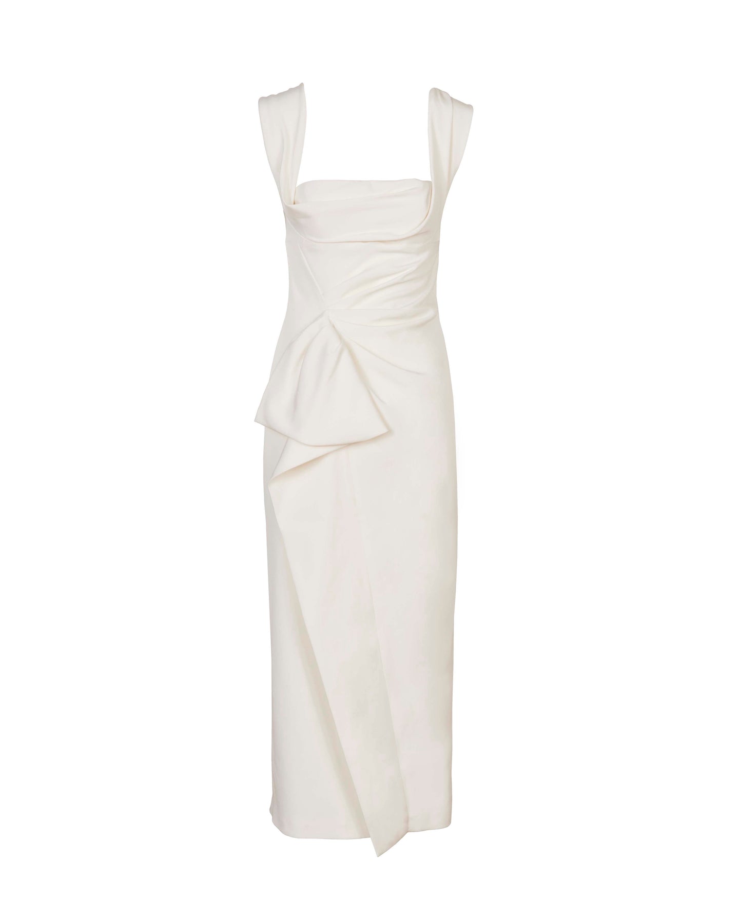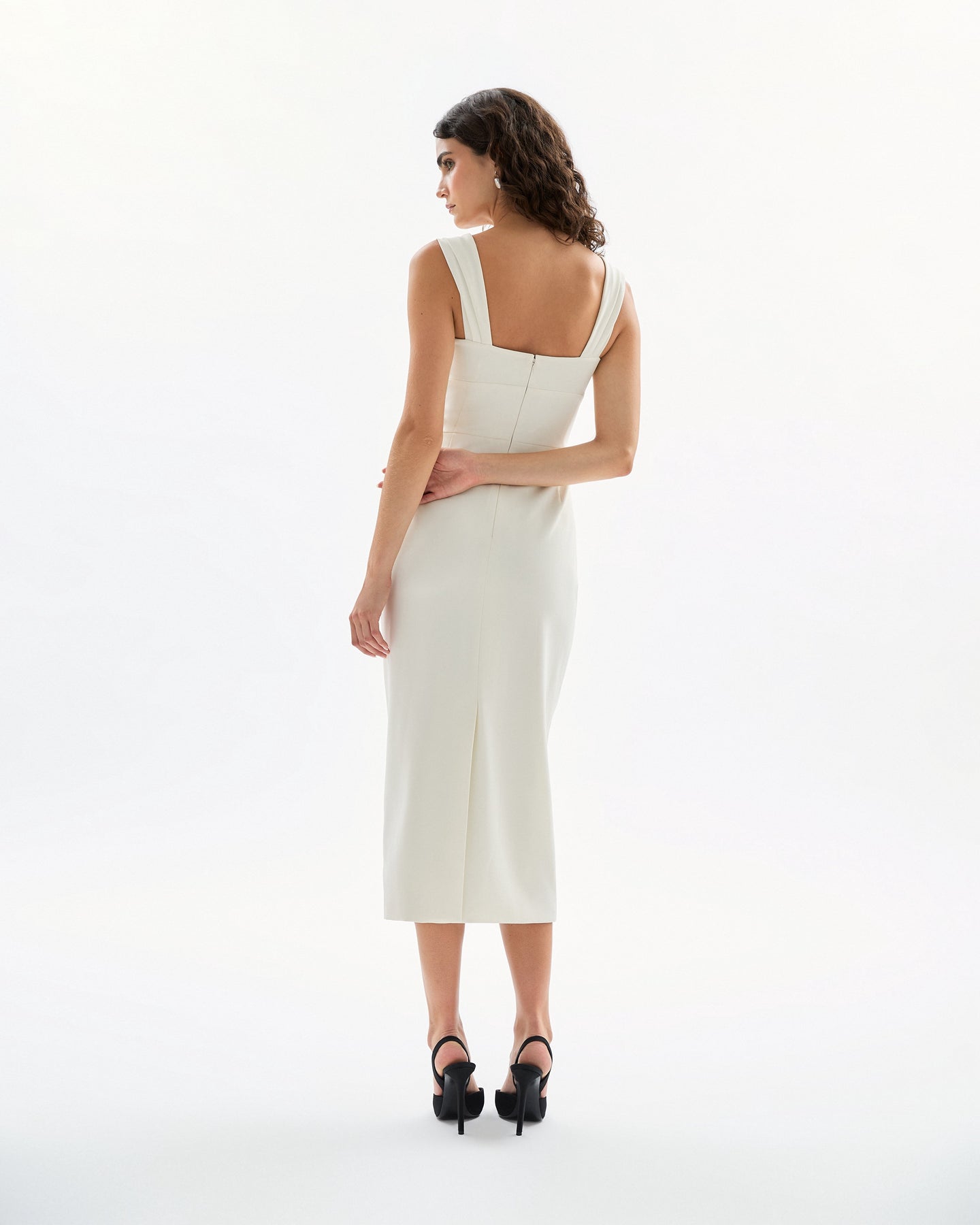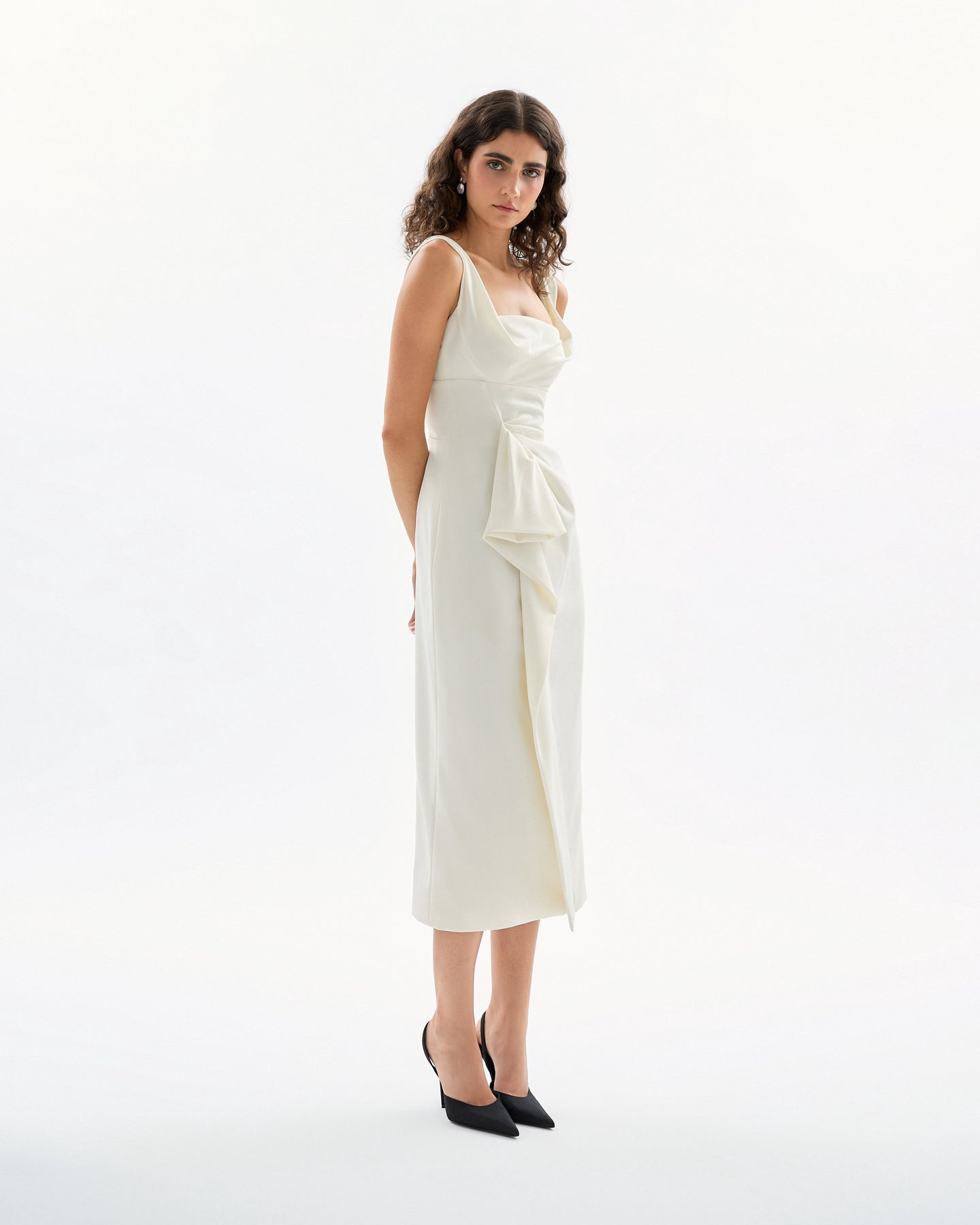 She is a classic midi dress with a square ballet neckline and a draped bodice with a ruched flounce.