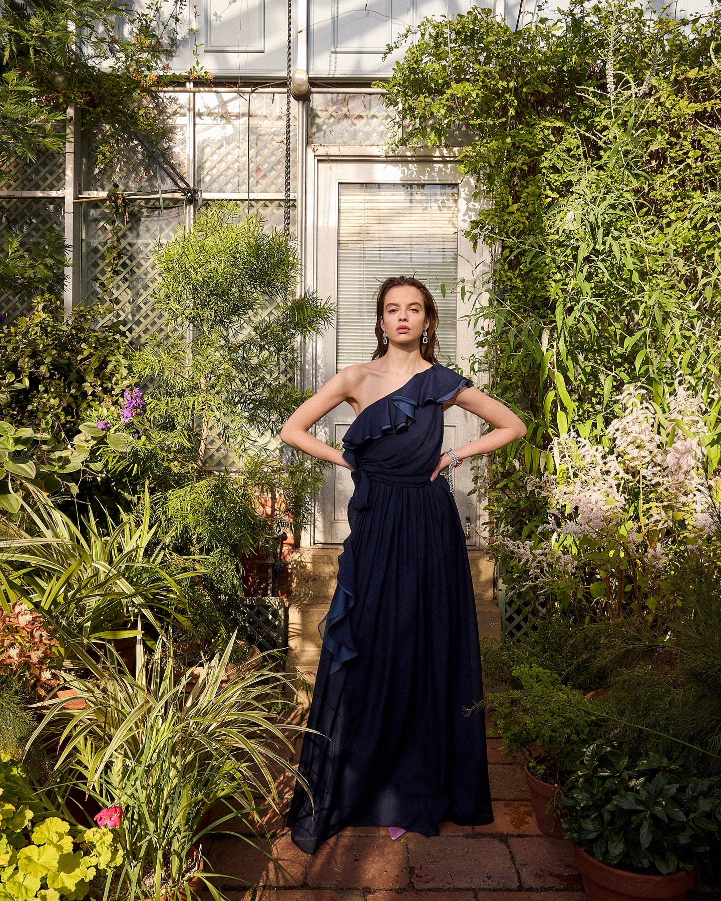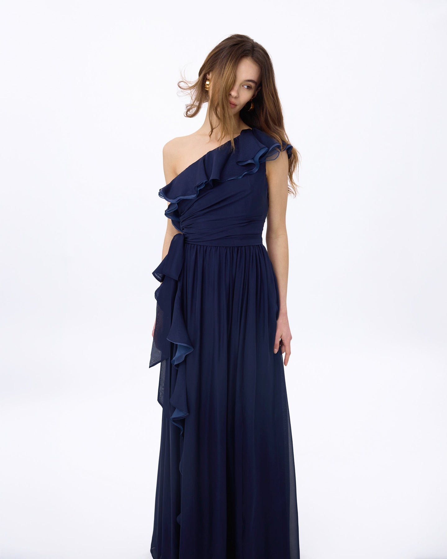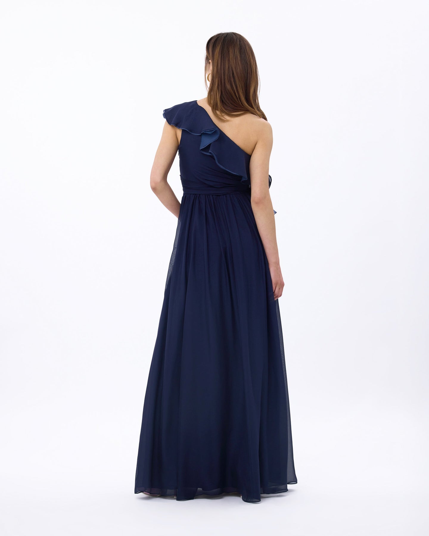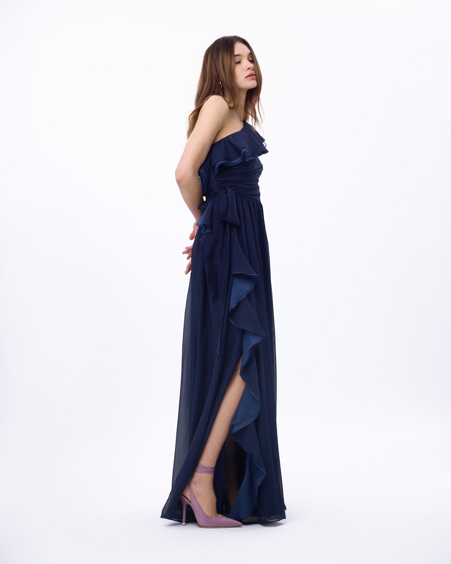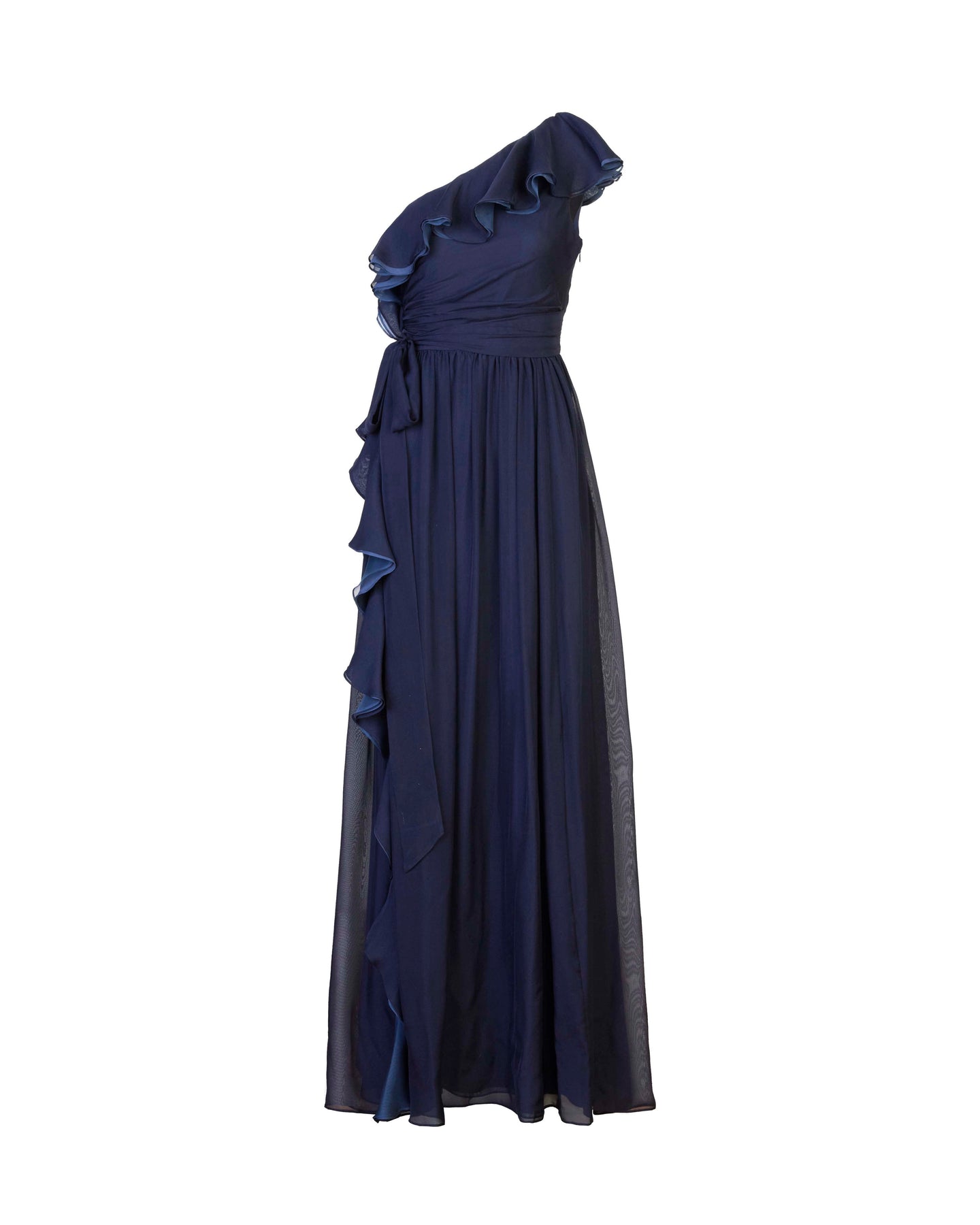 This one-shoulder floor length beauty is made of light silk organdy and can be seen floating across the room. She features cascading soft ruffles, a self-tie to cinch the waist. Illuminating yellow is the perfect refreshed spring color whereas midnight navy is the perfect wingwoman for any black-tie event.