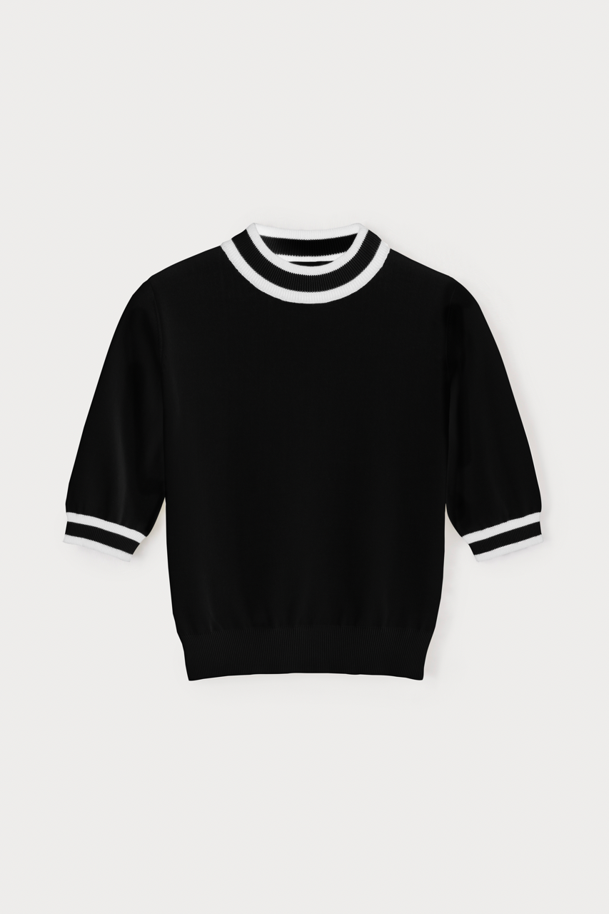 Fitted short-sleeve knit top with a round neckline and contrast ribbed trims. Crafted from a fine, stretchy viscose knit for a structured yet comfortable fit. Pair it with an ecru skirt for an elegant look or with denim for a casual chic twist.