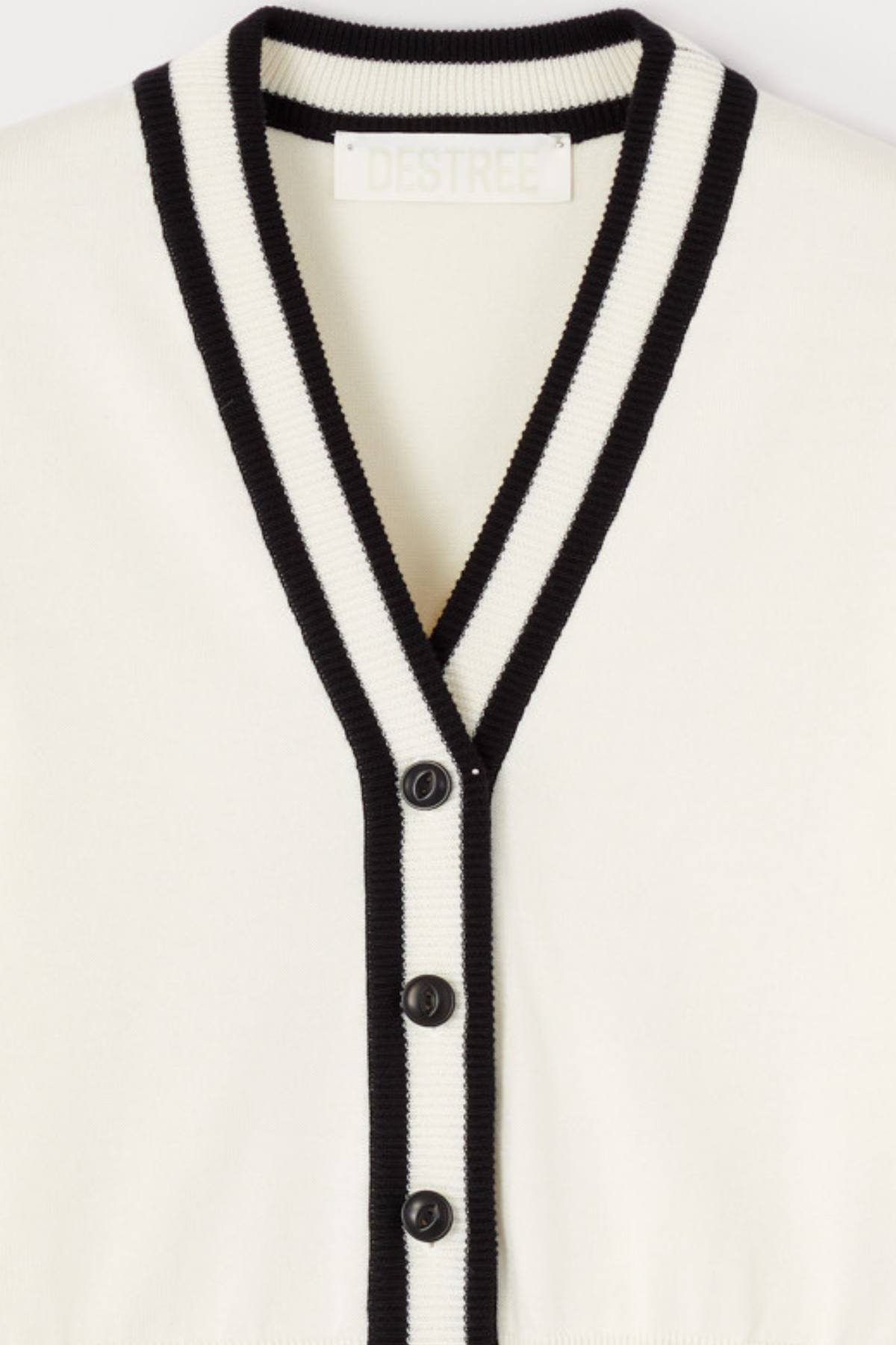 A refined interpretation of the classic varsity knit, this short-sleeve sweater combines timeless collegiate elements with modern sophistication. Crafted in soft ivory knit, it features striking black contrast trim at the crew neckline and cuffs. The slightly cropped silhouette and structured fit create a contemporary proportion that pairs effortlessly with high-waisted pieces.