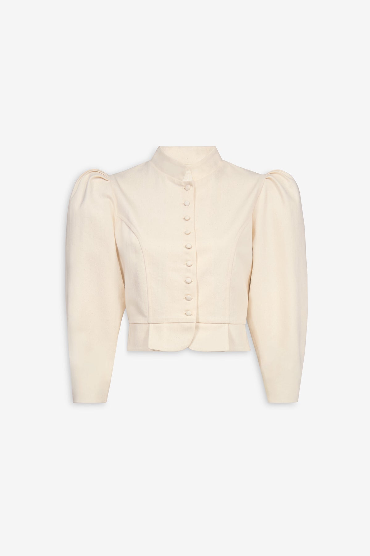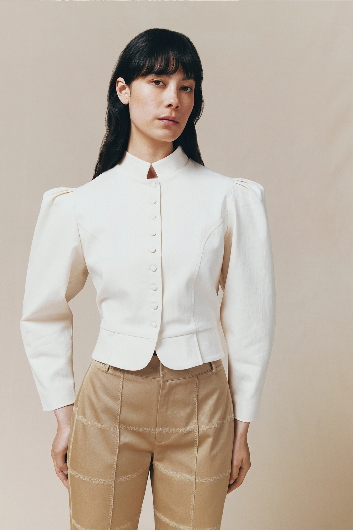 The Amoako jacket is a contemporary reinterpretation of 1950s fashion, showcasing our commitment to modern elegance and artistic inspiration. This cropped jacket features a mandarin collar, voluminous puff sleeves, and a fitted waist, creating a sculptural silhouette that reflects our distinctive aesthetic.