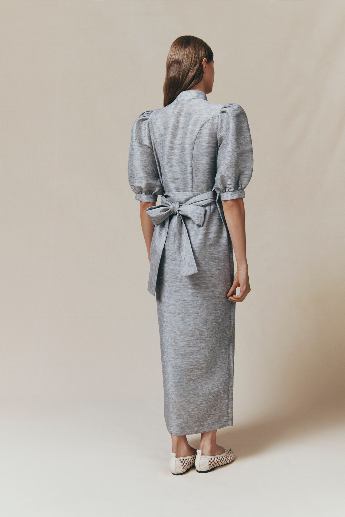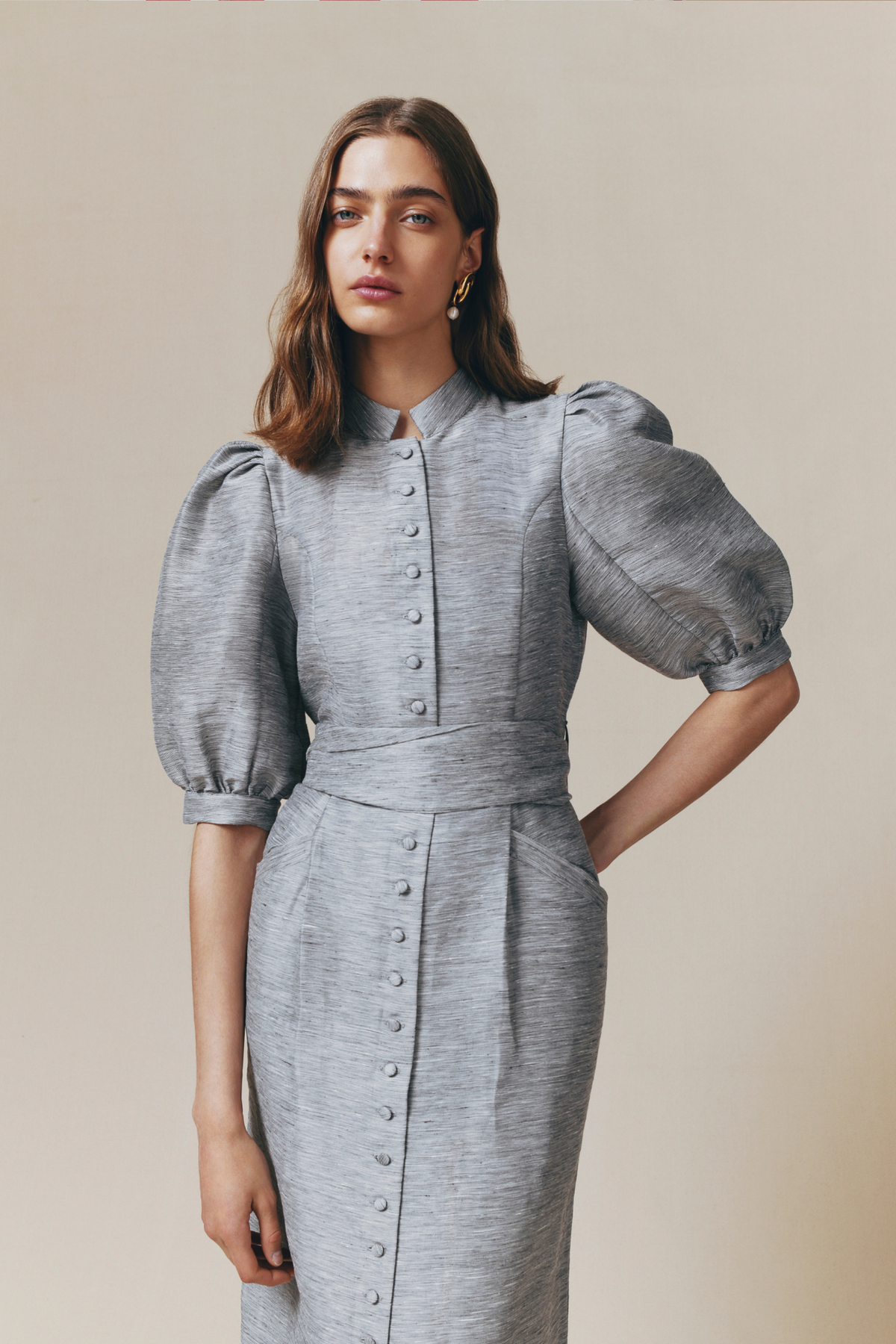 Structured maxi dress in textured grey linen fabric, featuring puffed sleeves and a stand-up collar. Full-length button closure, accentuated by a tonal belt that cinches the waist. A sophisticated silhouette blending vintage charm with modern elegance.