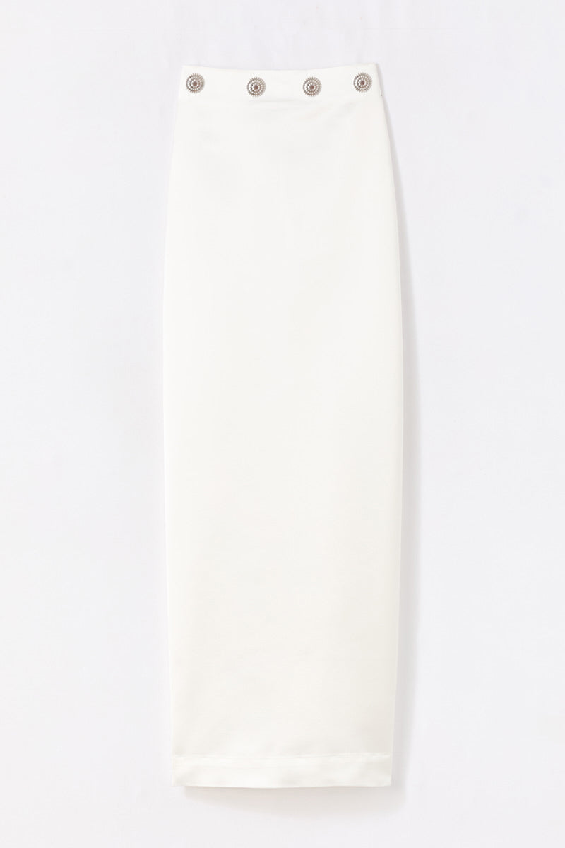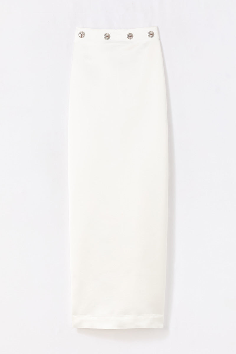 The skirt is inspired by minimalist and architectural design, with a clean and elongated silhouette.