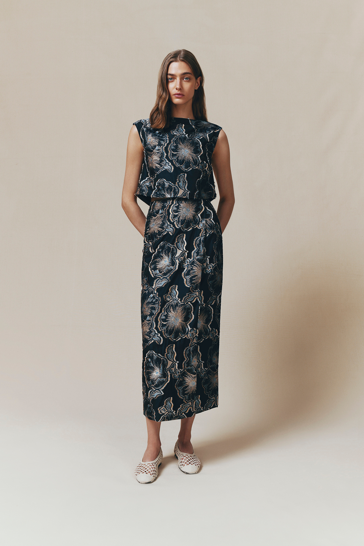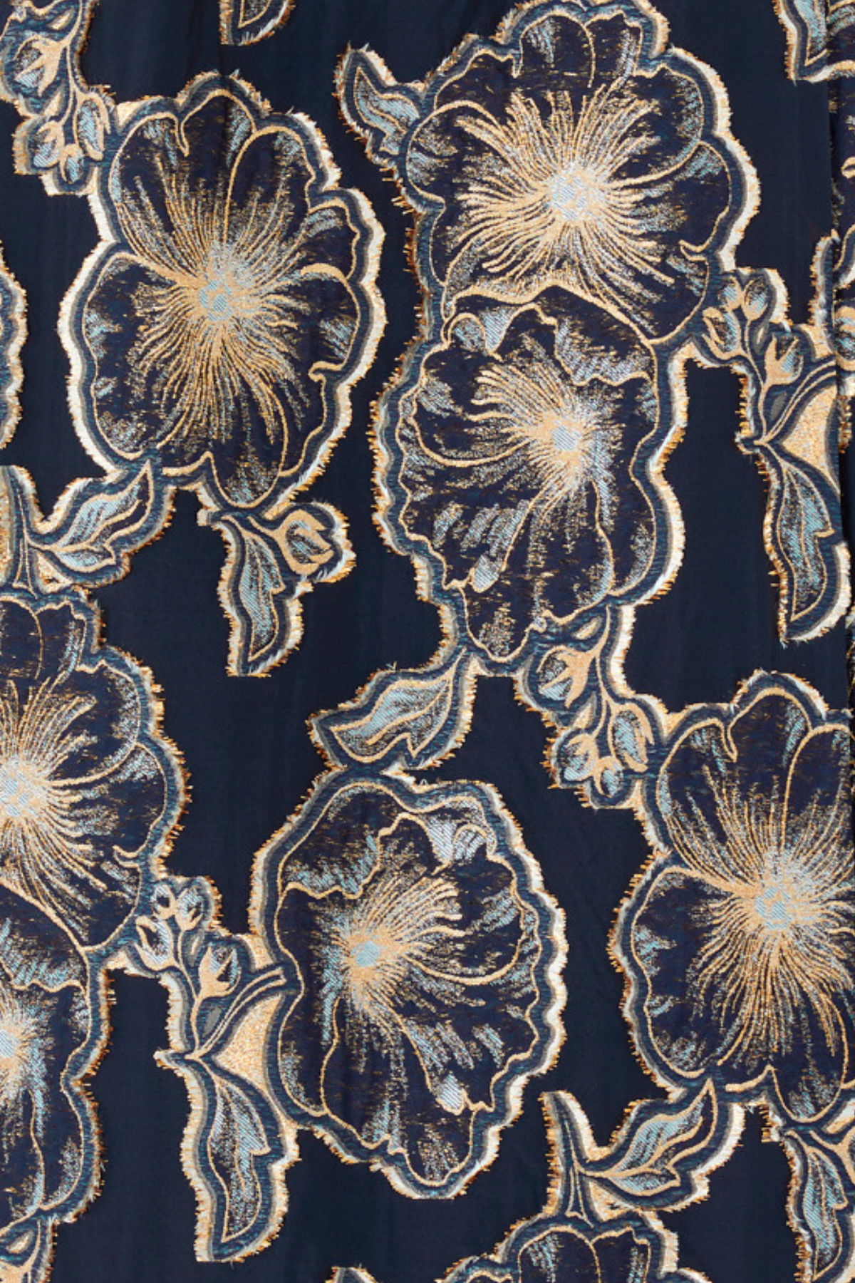 Wrap midi skirt in navy jacquard with metallic floral embroidery. The high-waisted wrap design offers a flattering, adjustable fit with effortless movement. Pair it with the matching top or a simple blouse for a versatile look.