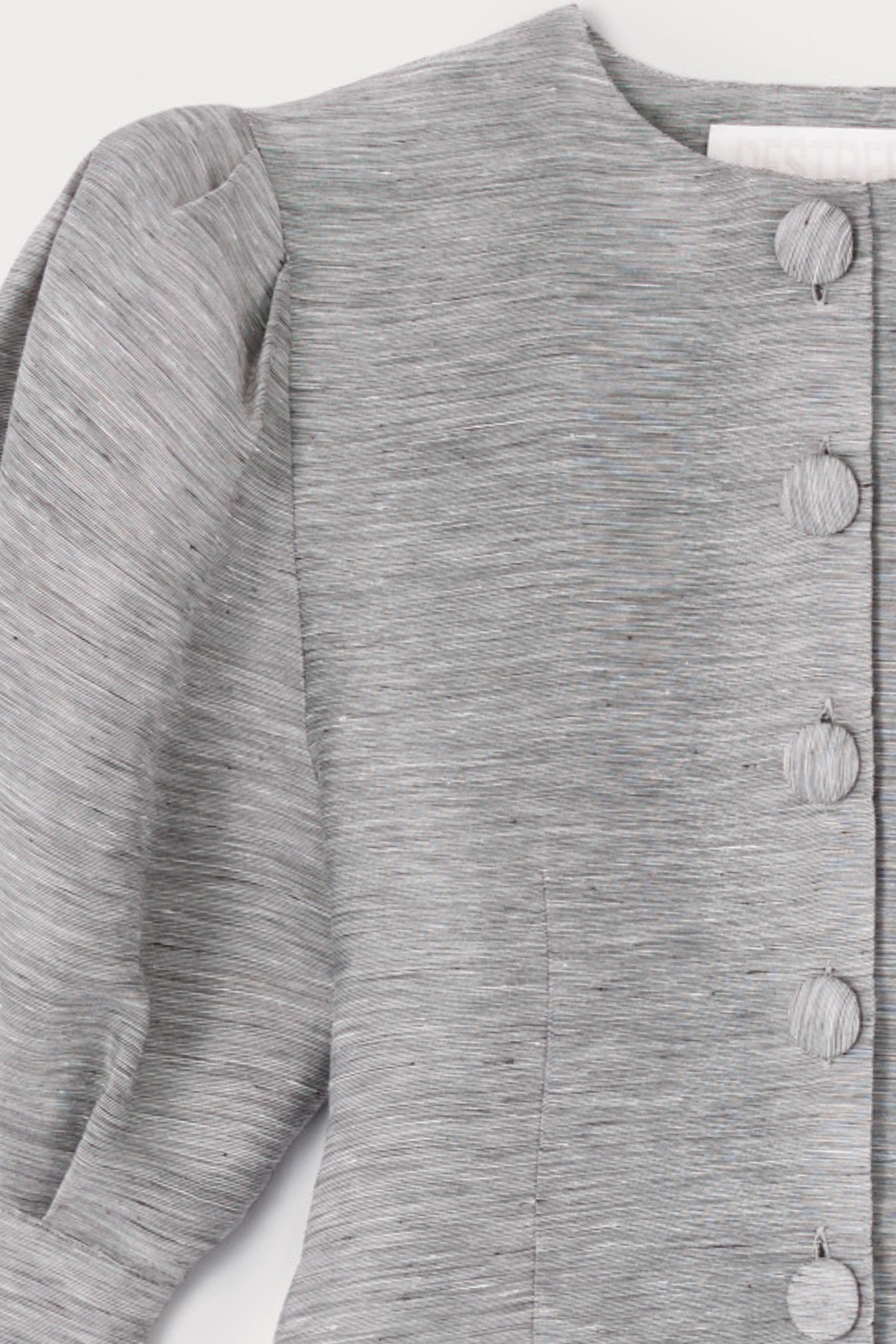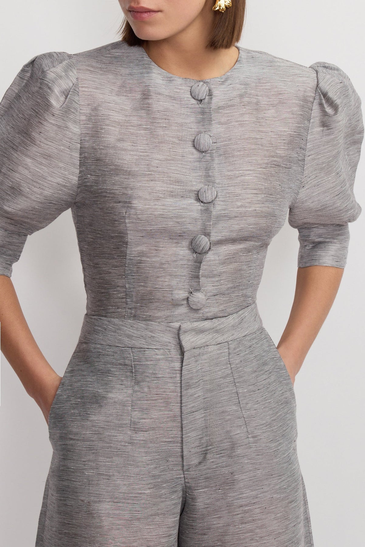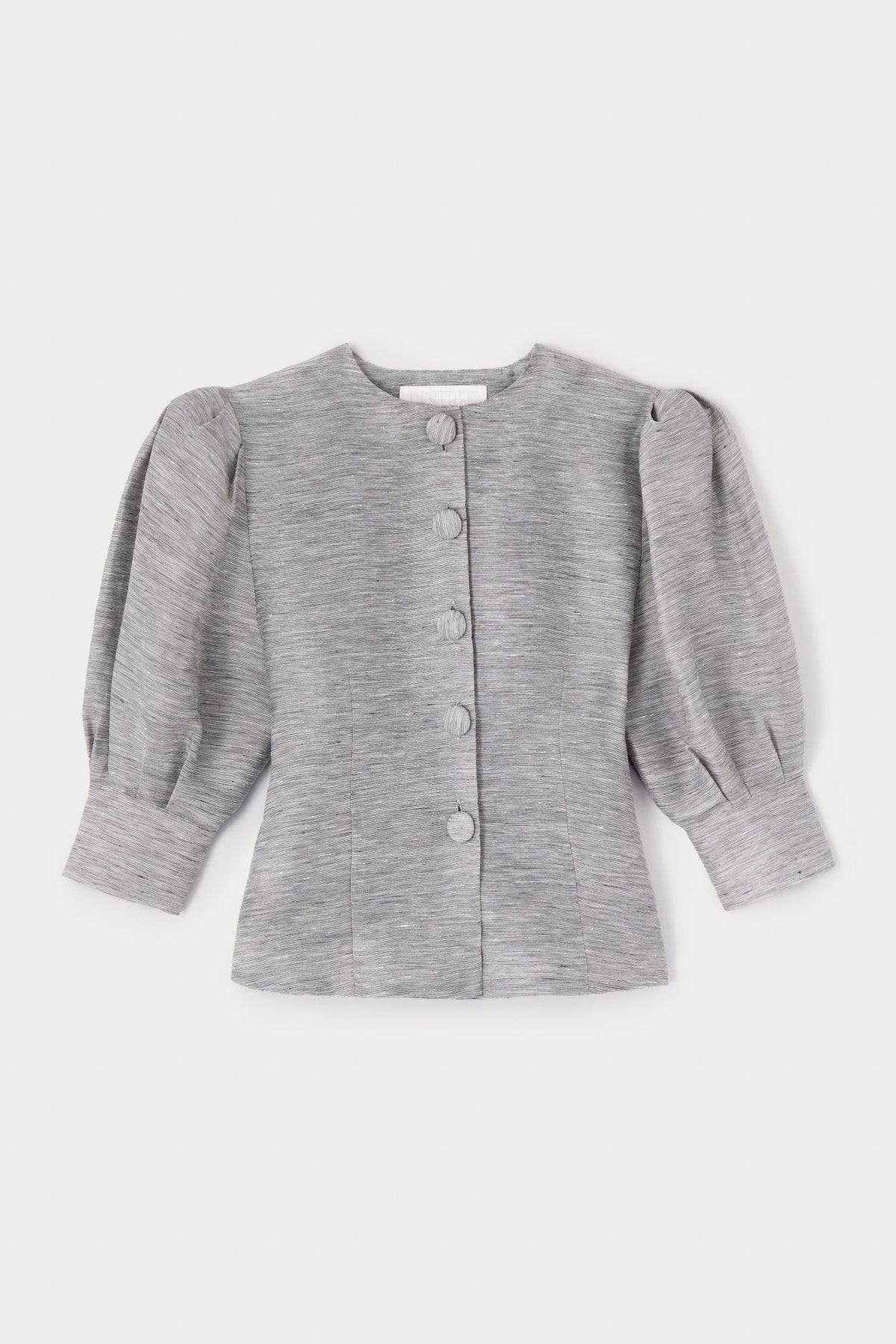 This fashionable striped blouse features a vintage cut with a regular length and a round neckline. Designed with elegant puff sleeves, it is finished with a buttoned front adorned with decorative buttons for a refined touch.