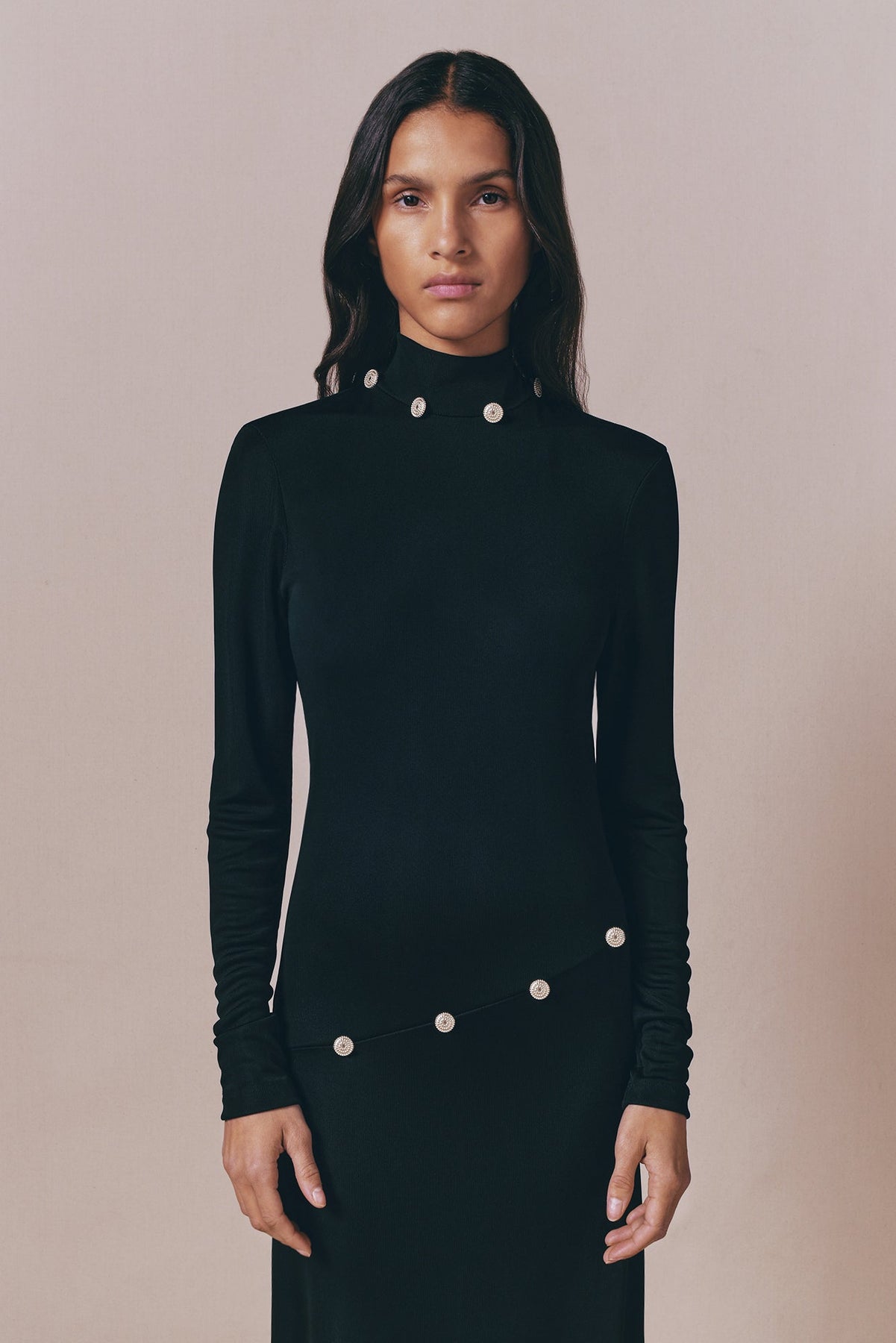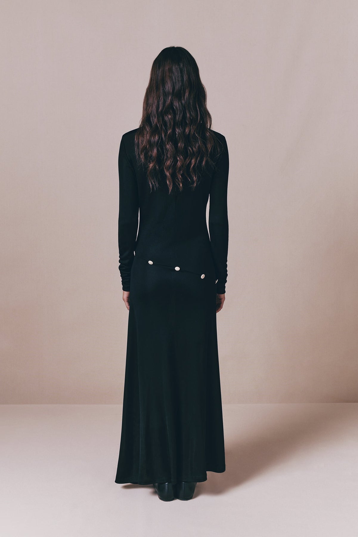 This refined black long-sleeve dress combines modern elegance with timeless details, featuring a high neckline and decorative buttons for a sophisticated finish.