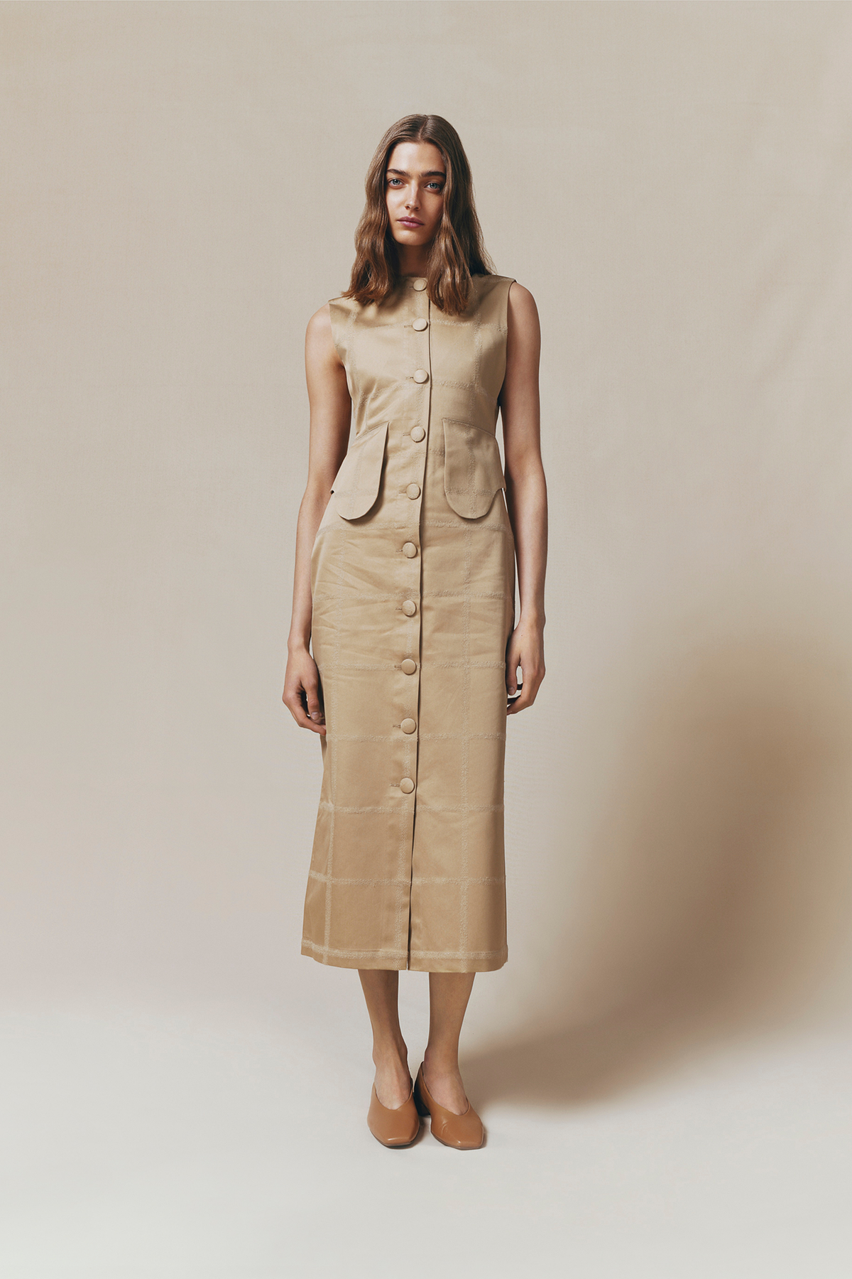 A sophisticated interpretation of utility wear, this sleeveless midi dress embodies modern minimalism. Crafted in smooth sand-colored fabric, it features a clean round neckline and a distinctive button-front closure that runs the full length. The curved cargo pockets at the waist add architectural interest while maintaining the dress's refined aesthetic. Each detail is considered, from the covered buttons to the subtle waist definition.