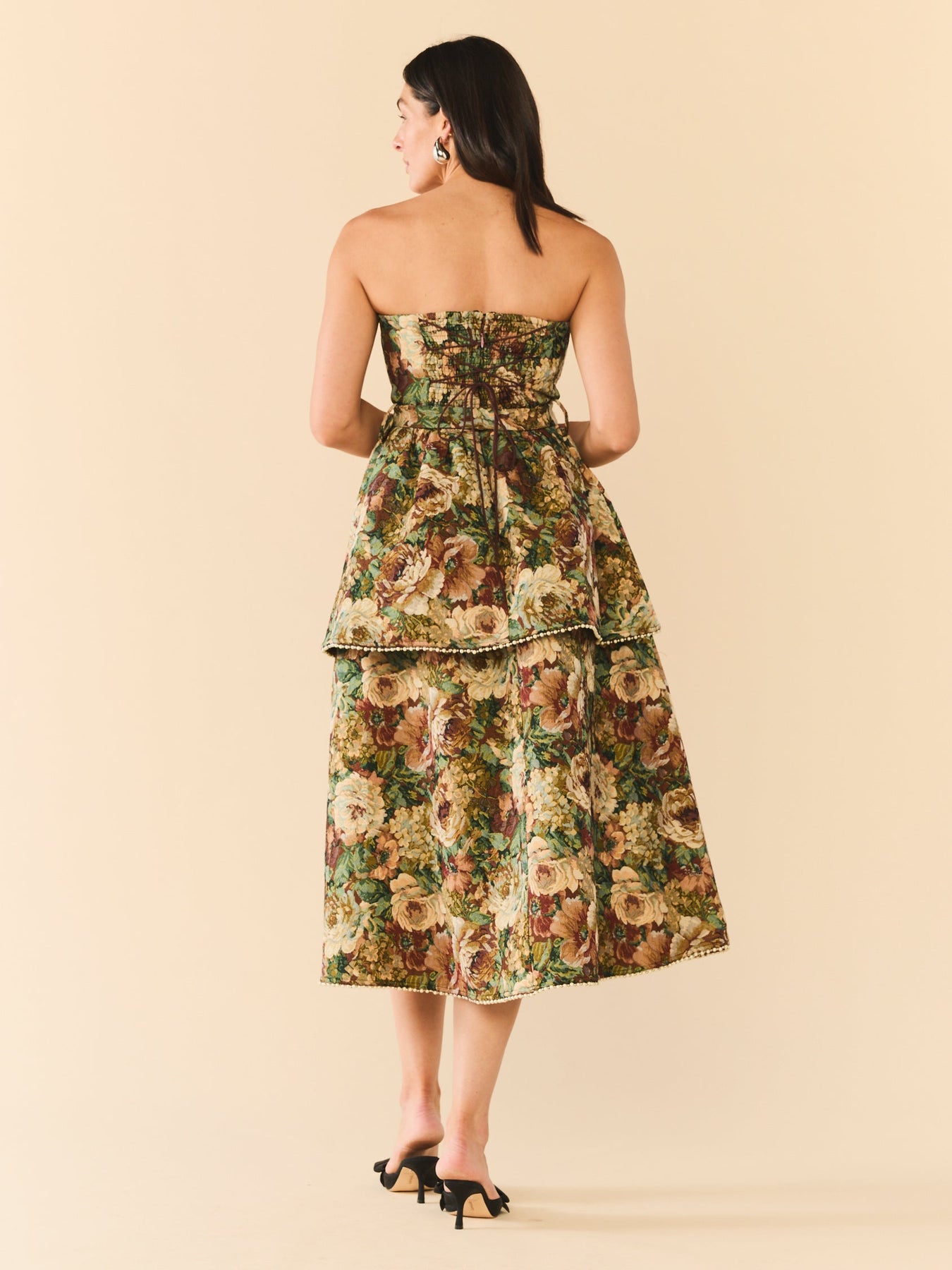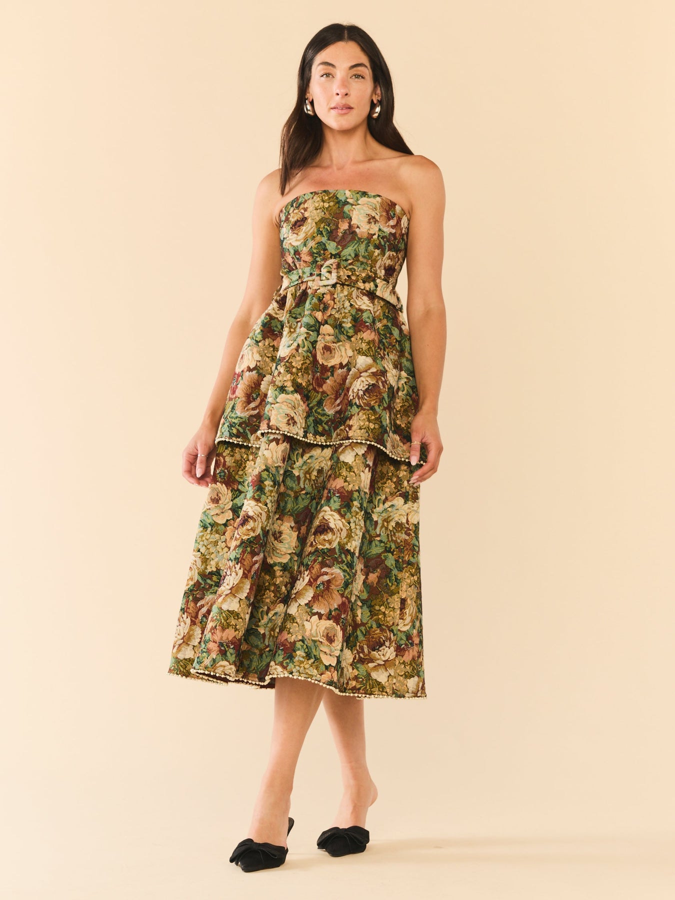 Its' strapless silhouette, enhanced by a smocked back, zipper closure, and belted waist ensures a flattering fit that moves with you. As you make your entrance, the vintage inspired jacquard florals throughout adds a touch of whimsy.