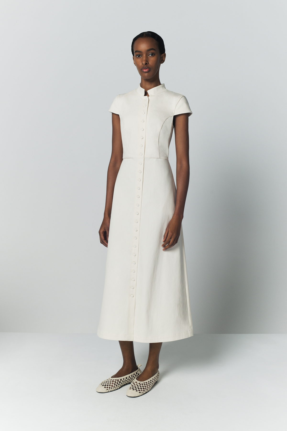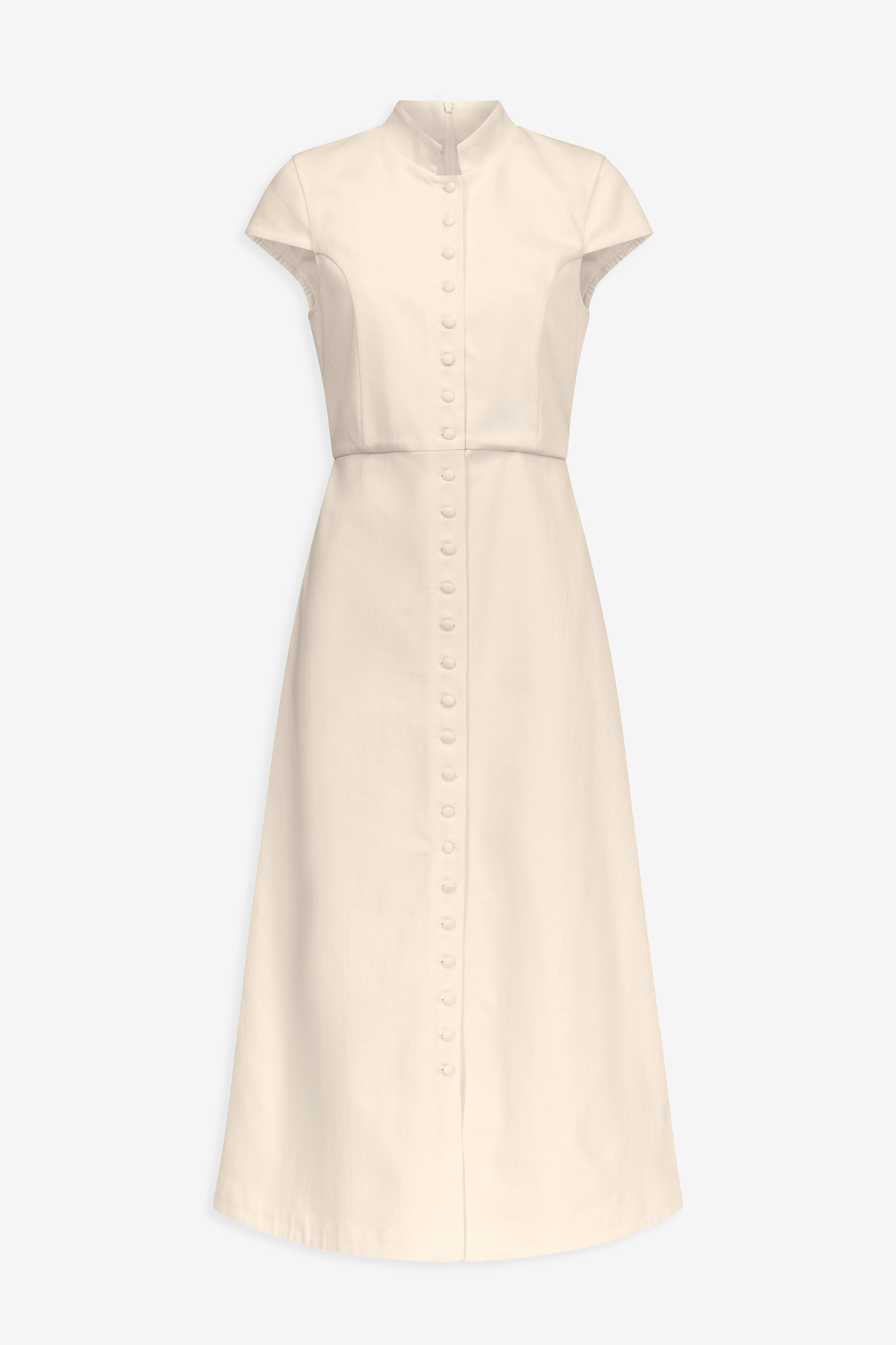A refined summer take on the Amoako silhouette, this short-sleeved dress blends structure and lightness. Crafted from 100% cotton, it features a fitted bodice with a mandarin collar, covered buttons running down the front, and a flared midi skirt that enhances movement, offering an elegant warm-weather alternative.