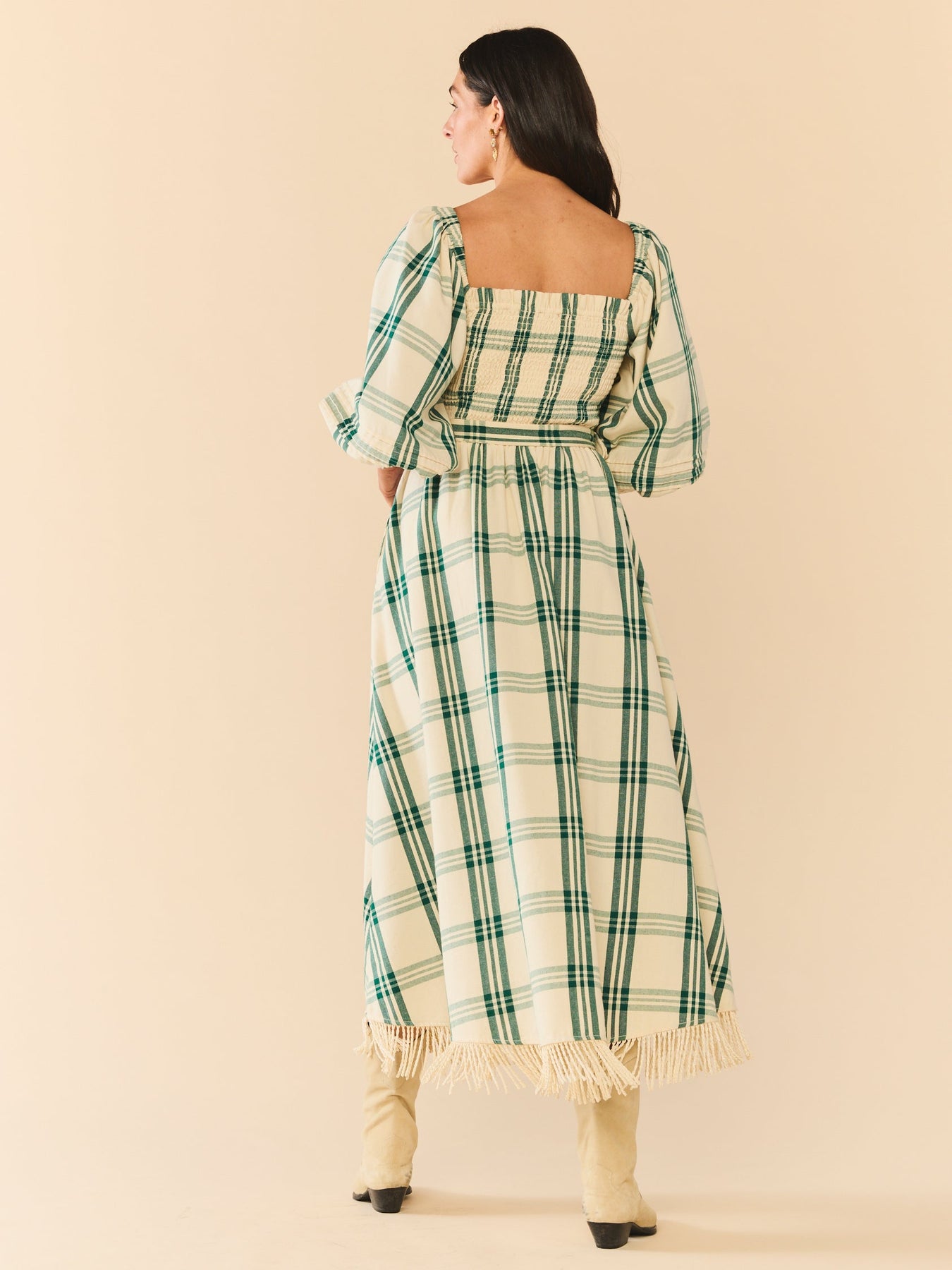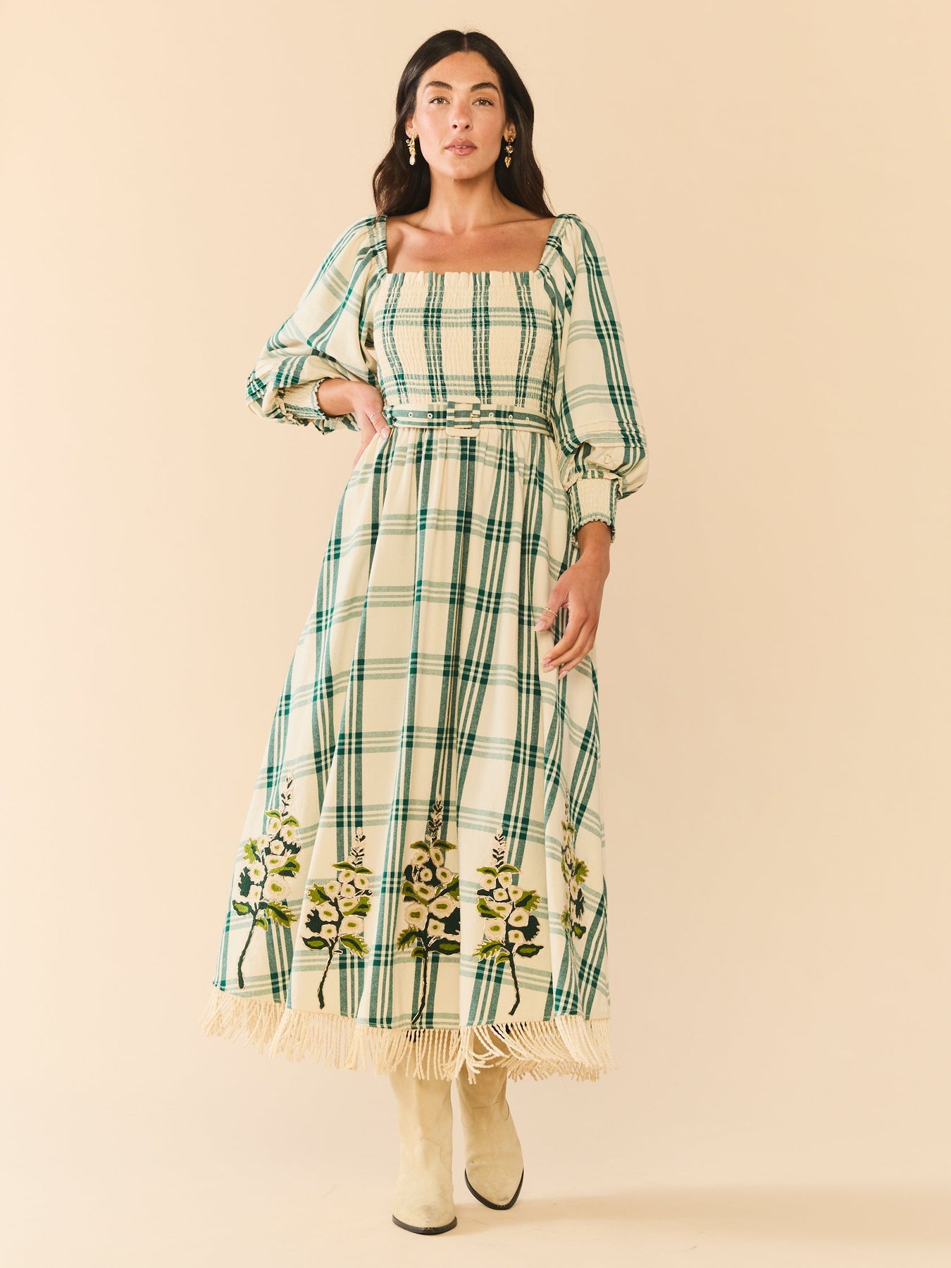 A square-neck plaid midi with a smocked bodice and full sleeves, it’s finished with embroidered florals dancing along the hem and a fringe trim that feels equal parts romantic and playful. The Eloise is that dress you’ll want to wear for every occasion, family photos for the holidays or chasing littles at the pumpkin patches.