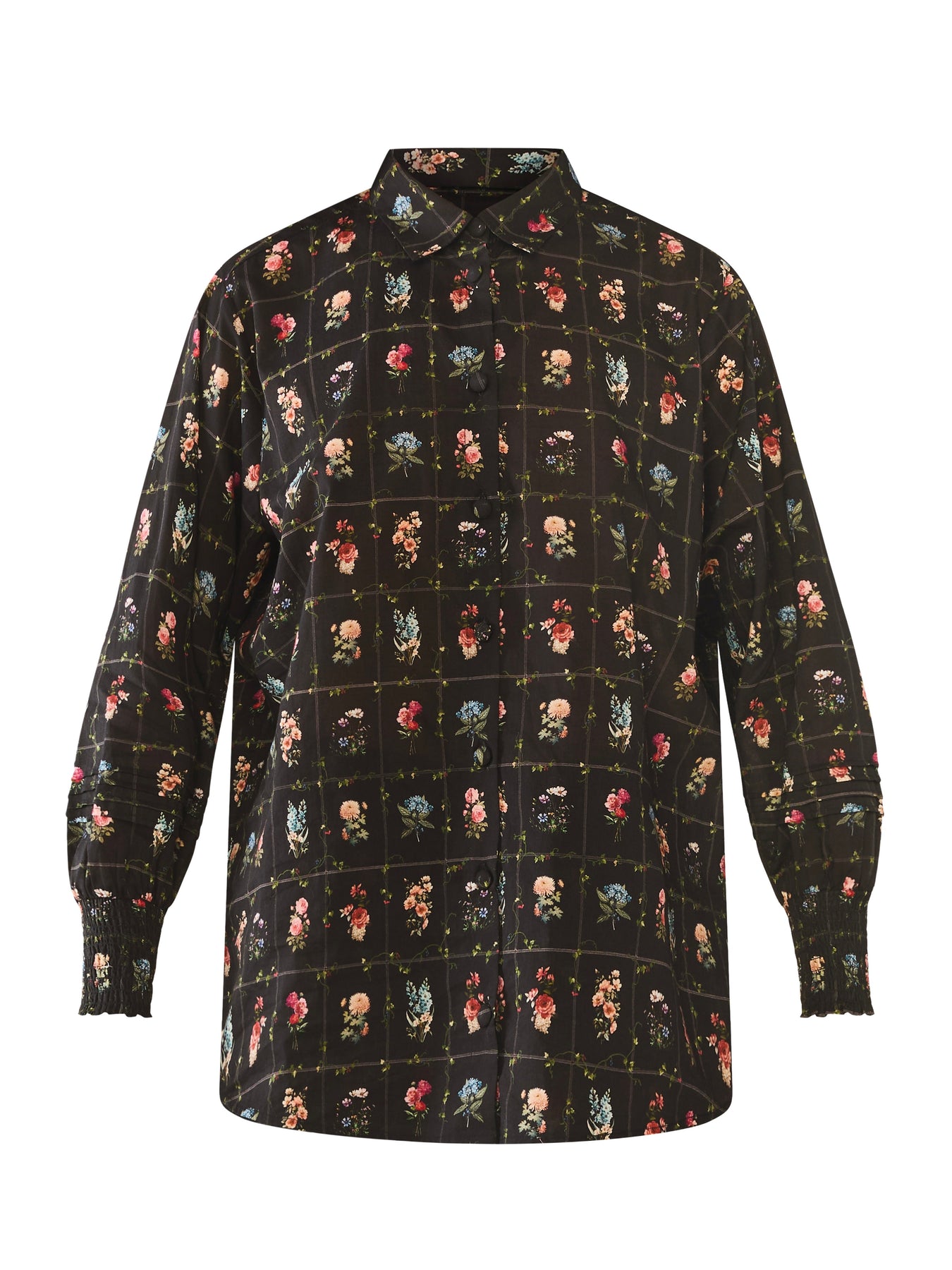 Tailored in the softest, most sustainable cotton available, the Katie Button down is an oversized button-down that takes a classic style to a new, floral level. It features a classic collar, fabric covered buttons, and full-length sleeves finished with a smocked cuff.