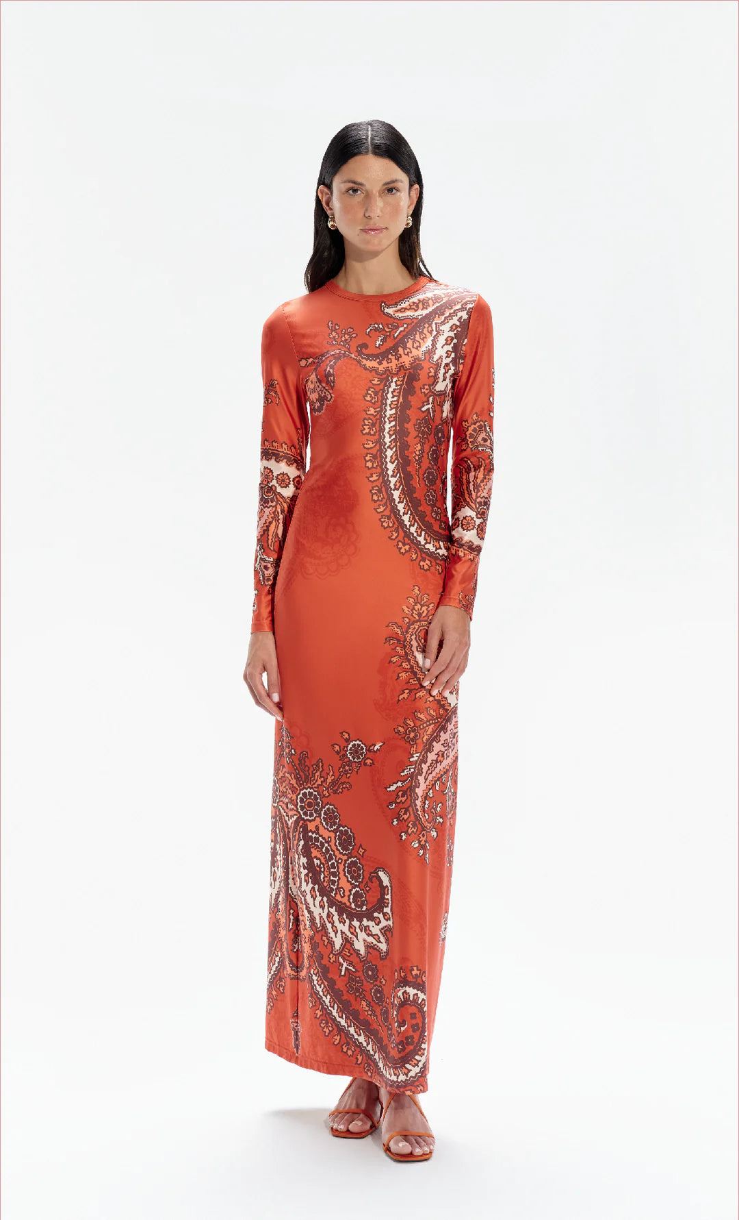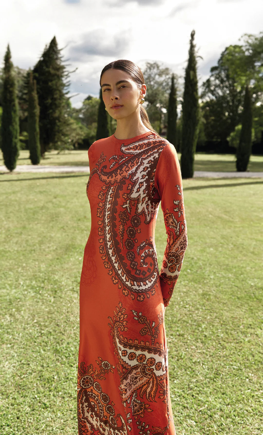 The Budana Paisley maxi Dress combines elegance and femininity in a fitted silhouette that subtly enhances the figure. Its long sleeves and round neckline provide a classic and timeless finish, while the exclusive Especia print adds a unique and distinctive touch, highlighting every detail of the dress.