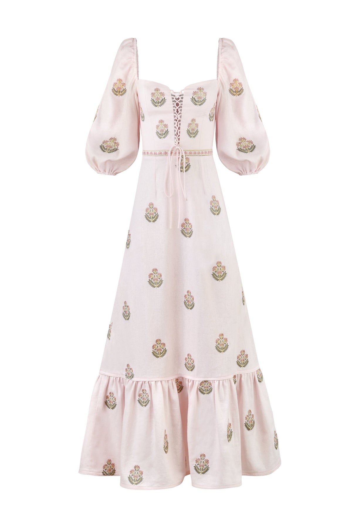 The romantic puff sleeves, lace-up décolleté, and softly tiered ruffled hemline offer a perfect blend of structure and softness—effortlessly flattering and unforgettable in motion. Whether you're attending a sunset wedding, evening garden party, or formal celebration, the Mitra Maxi is your moment to shine.