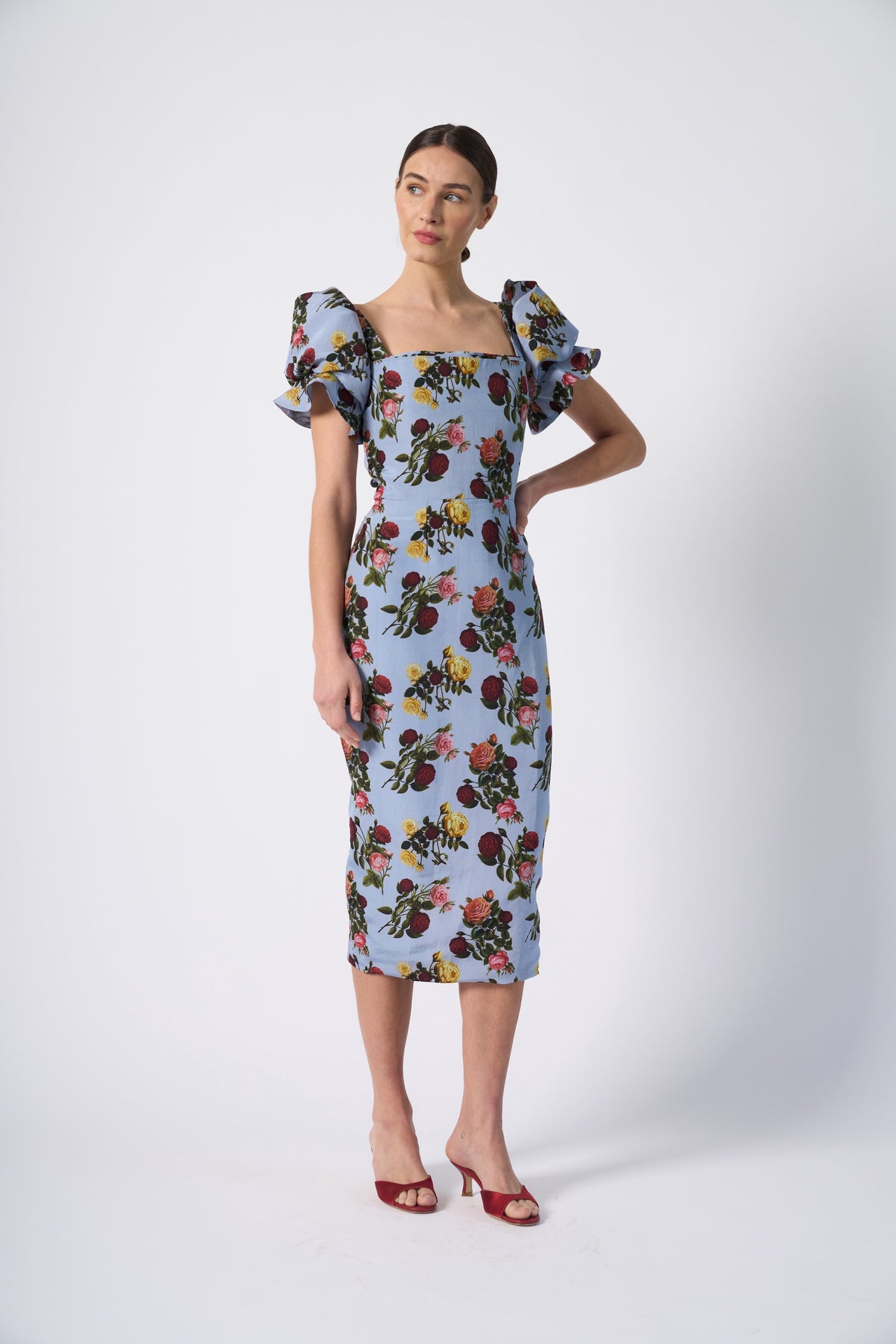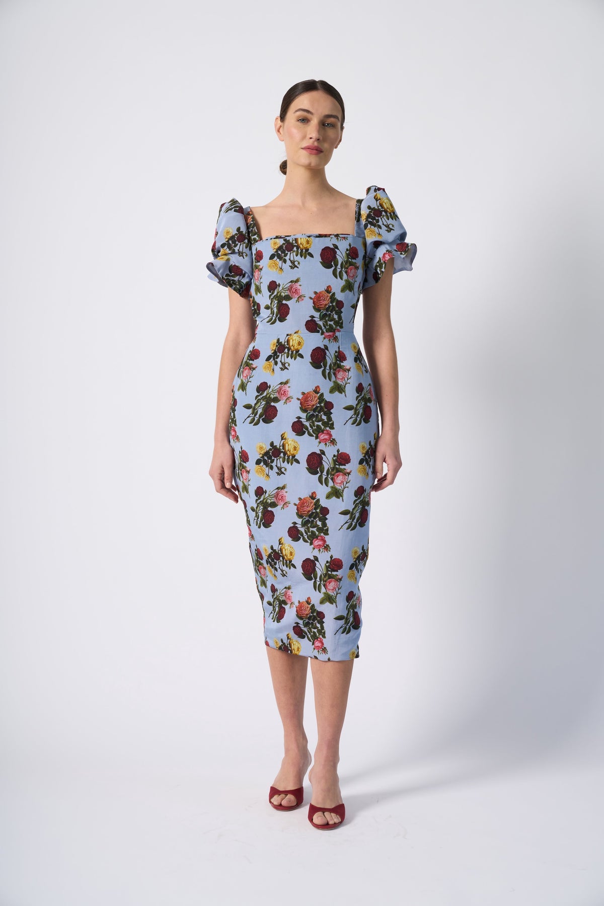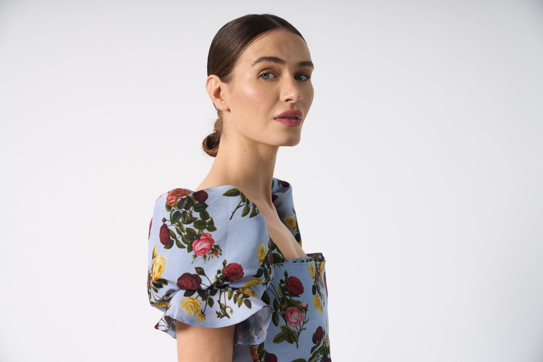 The Rose Dress returns in a 100% silk faille, sky-blue fabric adorned with rich, blooming roses. A soft and attractive midi, inspired by vintage romantic looks, the Rose Dress highlights a gorgeous silhouette with puff sleeves and a straight fit. With a look to the past, while still retaining the brand's modern, feminine look, the Rose is chic and a little bold.