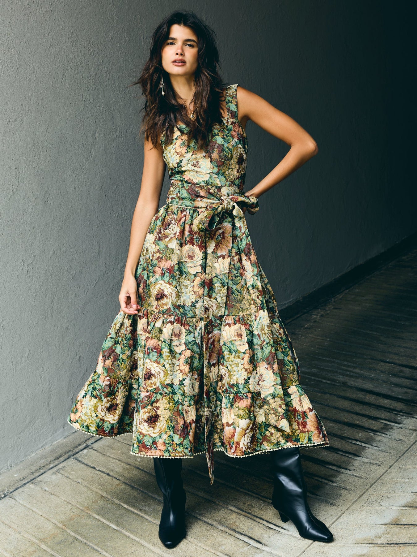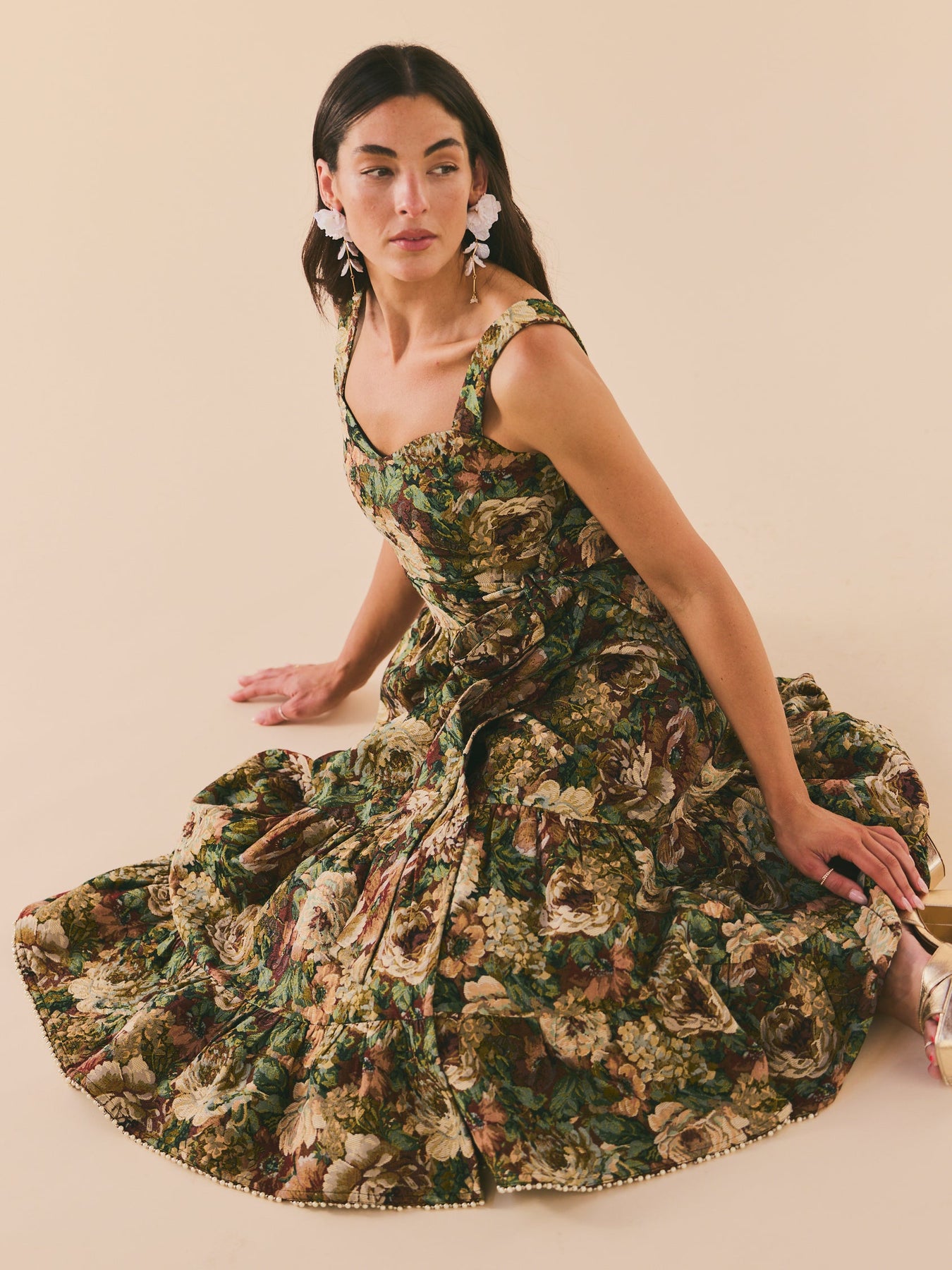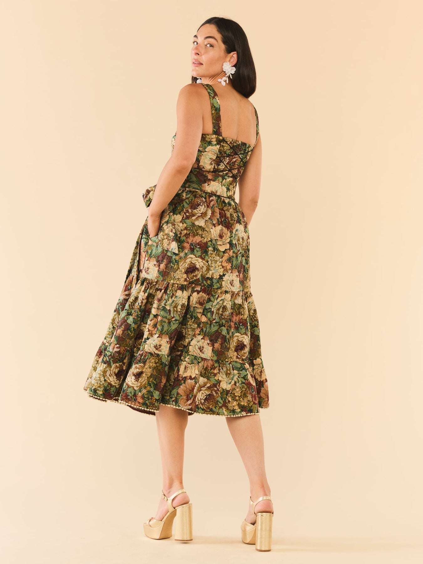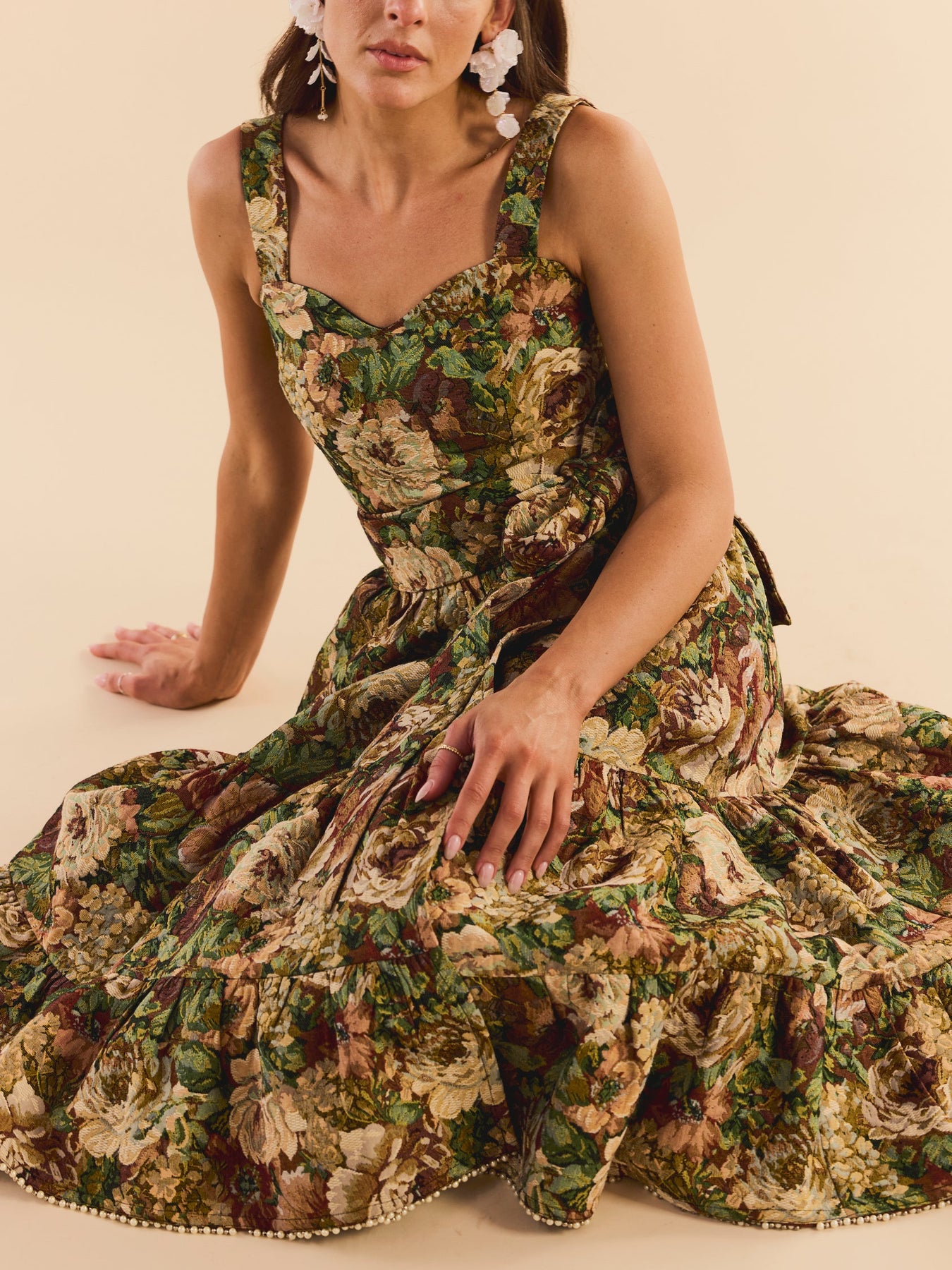 Two pieces, endless possibilities. This floral jacquard dream is made to be worn as a full look or split up for twice the styling fun. The top features corset-style back ties, a hidden side zip, and just the right amount of stretch for comfort. The matching wrap skirt ties at the waist and falls to a flattering midi length, finished with tiny pearl and silver bead embellishments along the hem, because details matter. Romantic, a little dramatic, and effortlessly cool.
