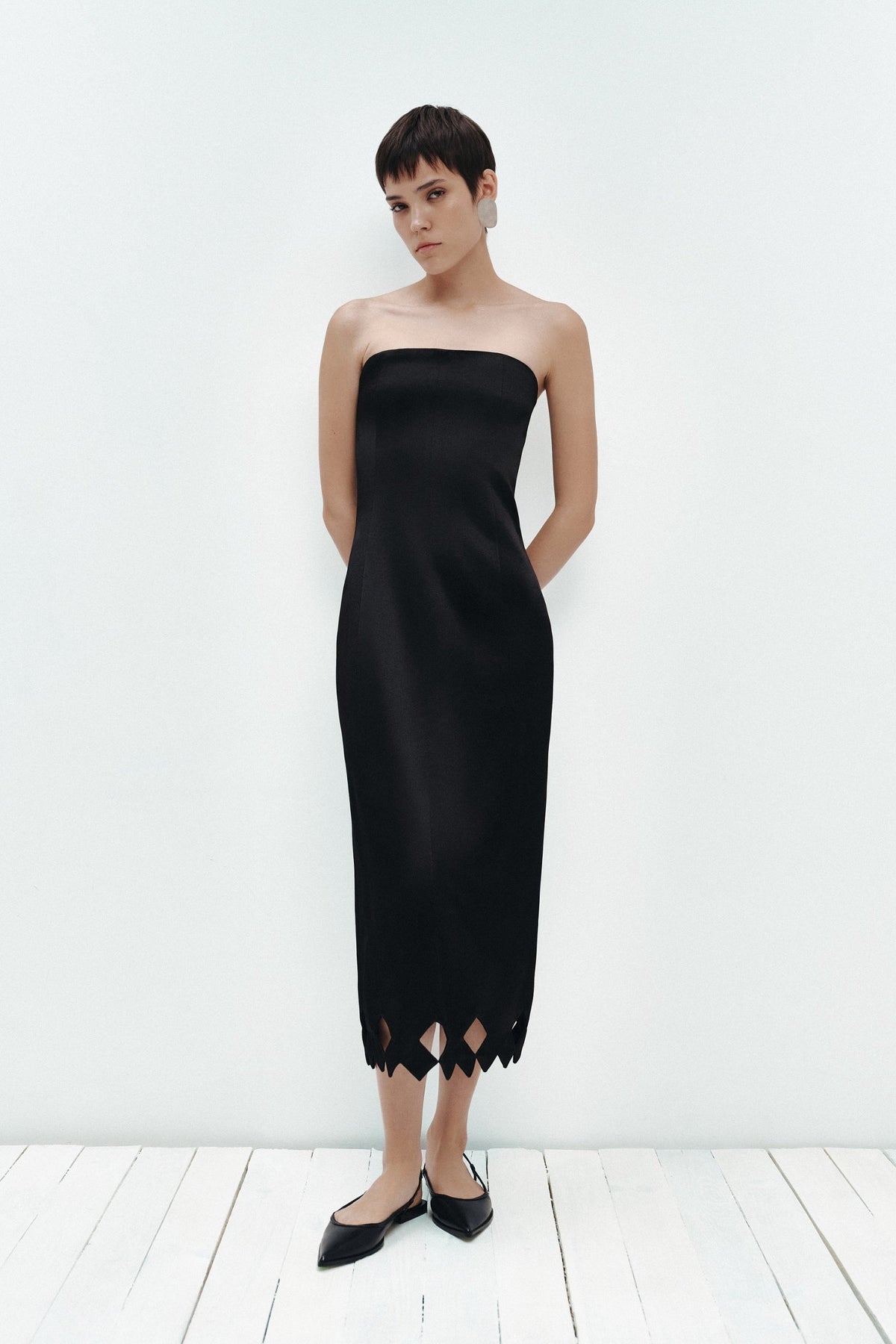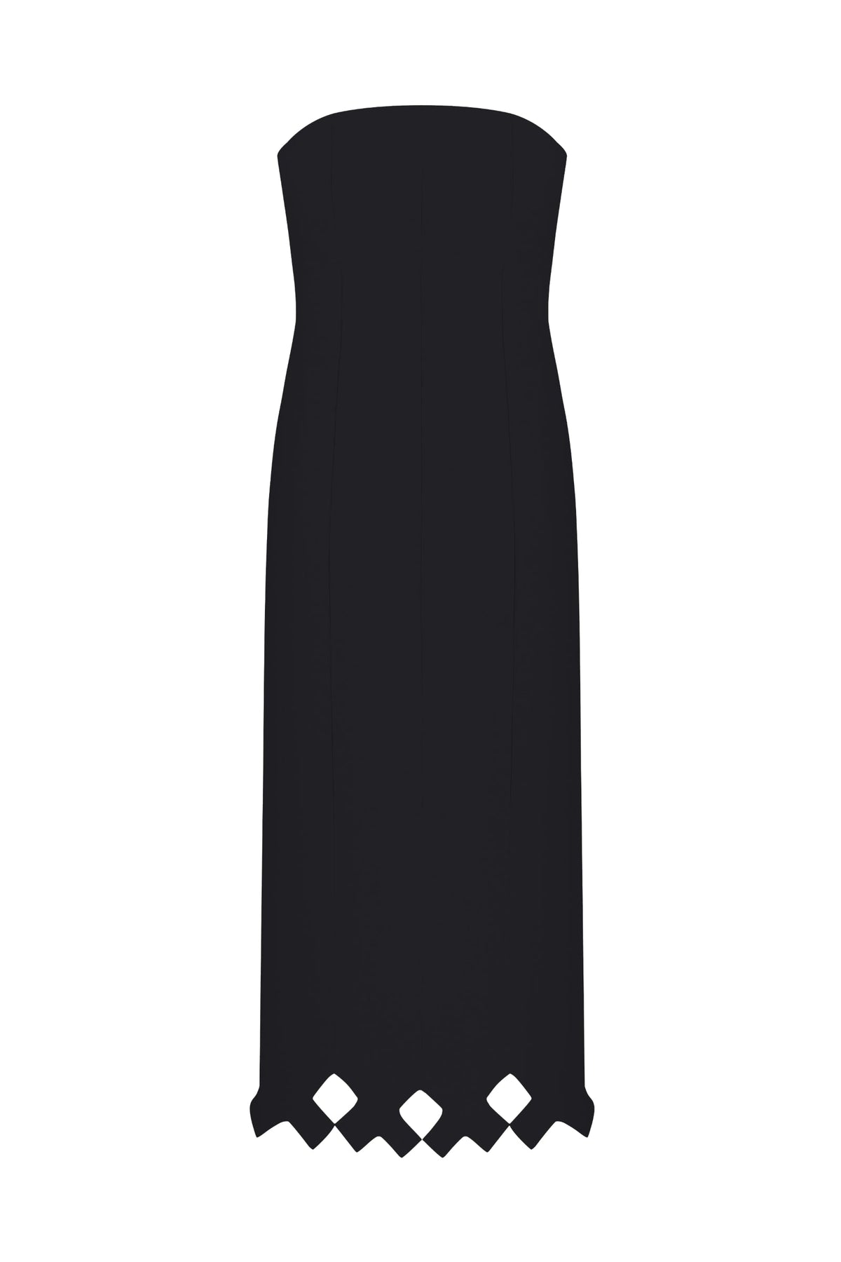 The Tympan Dress in Black is a sophisticated midi silhouette crafted from fluid viscose that drapes elegantly against the body. This strapless design features a fitted bodice that creates a refined, streamlined profile, while the back zip closure ensures a seamless fit and easy wear. The center-back vent provides subtle movement and comfort, allowing for graceful stride, while the scalloped hemline adds a distinctive design detail that elevates the piece beyond basic minimalism. Ideal for evening events, cocktail occasions, or refined daytime wear, this dress transitions effortlessly from season to season. The viscose fabric offers a luxurious feel with natural breathability, making it both comfortable and polished for any occasion requiring understated elegance.
