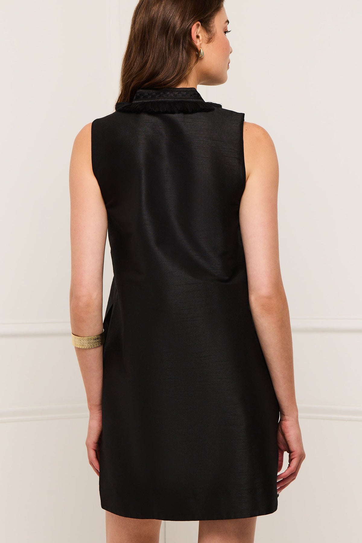 • Sleeveless silhouette with novelty braid and fringe detailing along placket