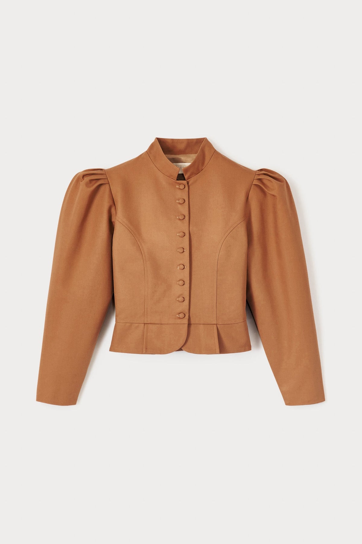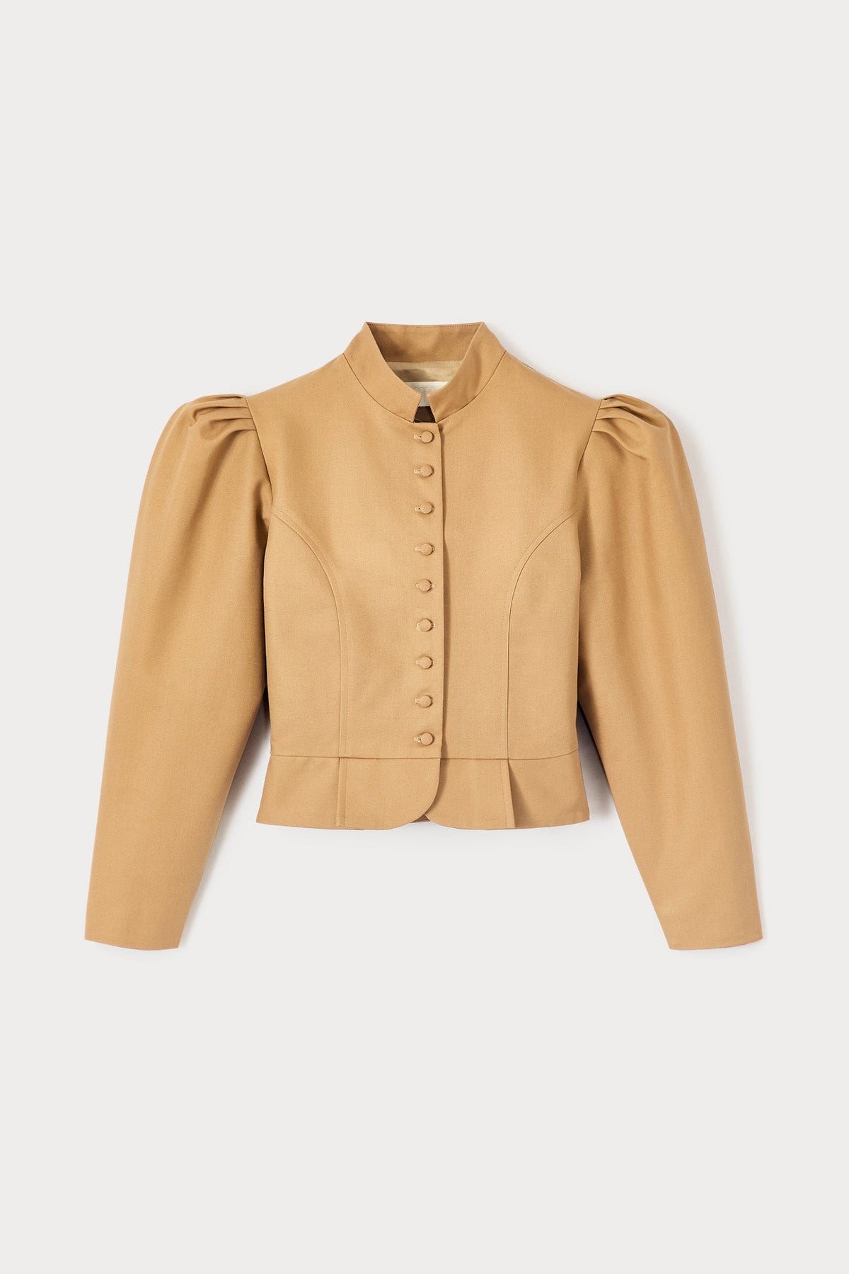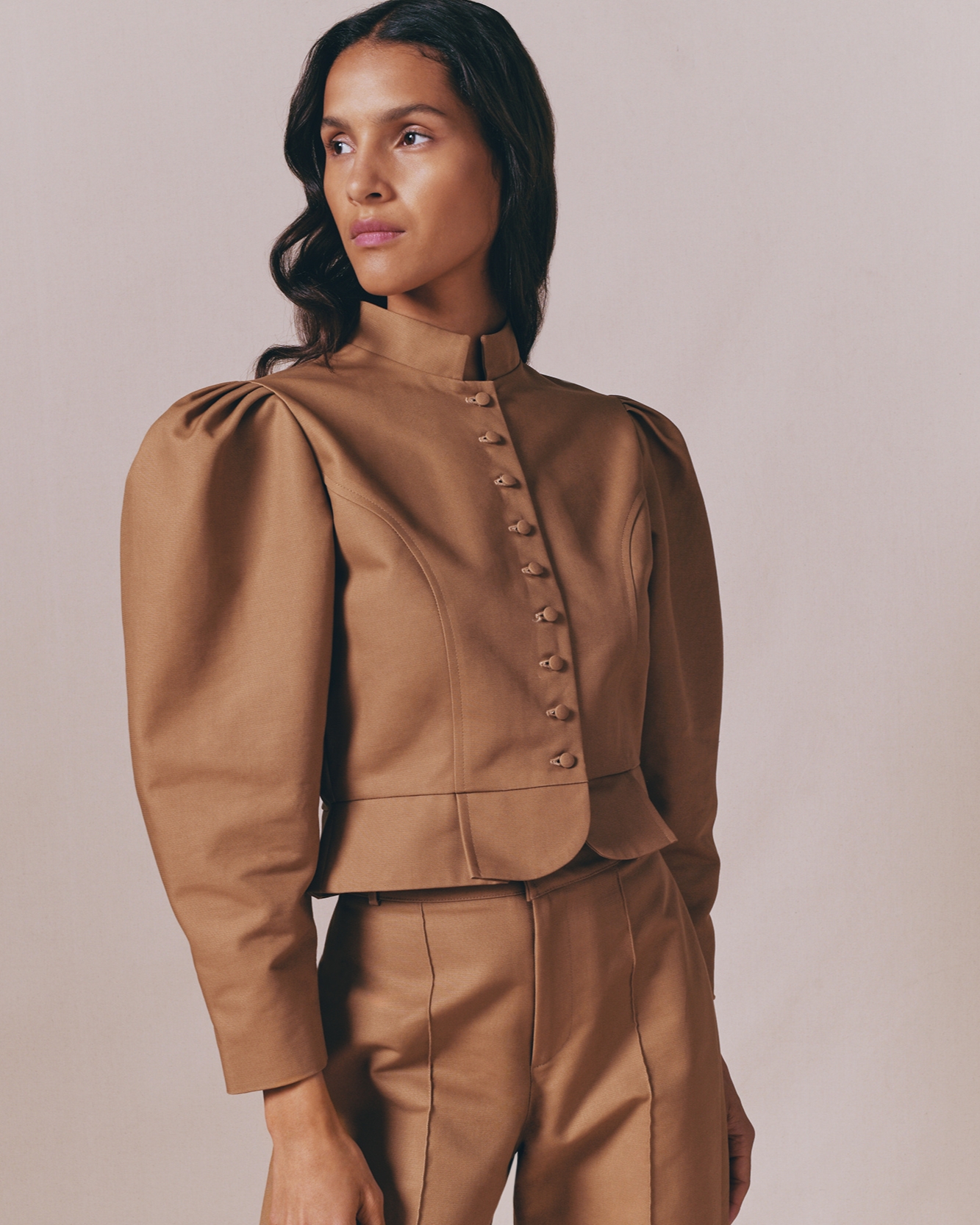 Cropped jacket featuring a mandarin collar and voluminous puff sleeves, creating a sculptural silhouette.