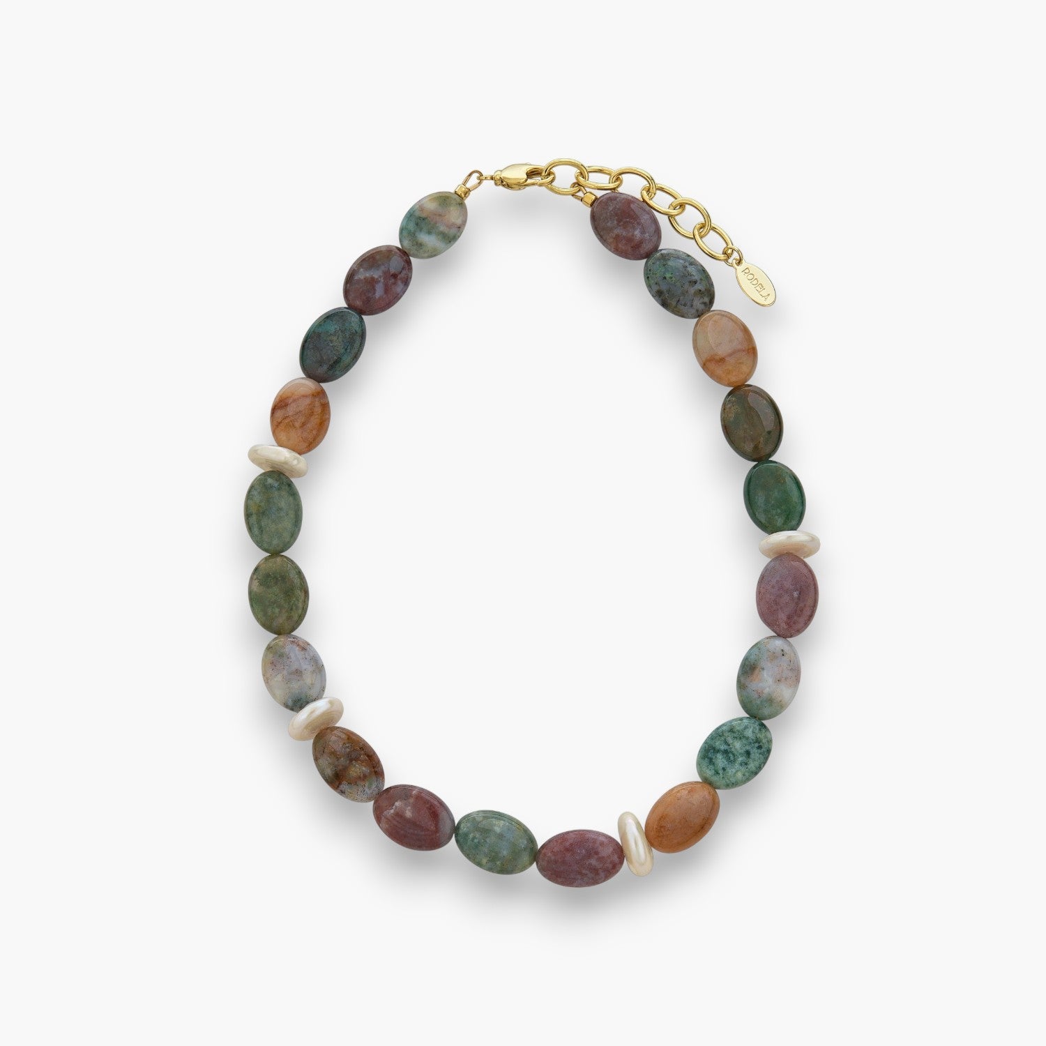The Adel Necklace pairs the grounding beauty of Indian agate with softly iridescent disc pearls—each one a quiet shimmer against rich, tonal greens. It’s a piece that feels both rooted and radiant, made for sun-drenched days and effortless layering.