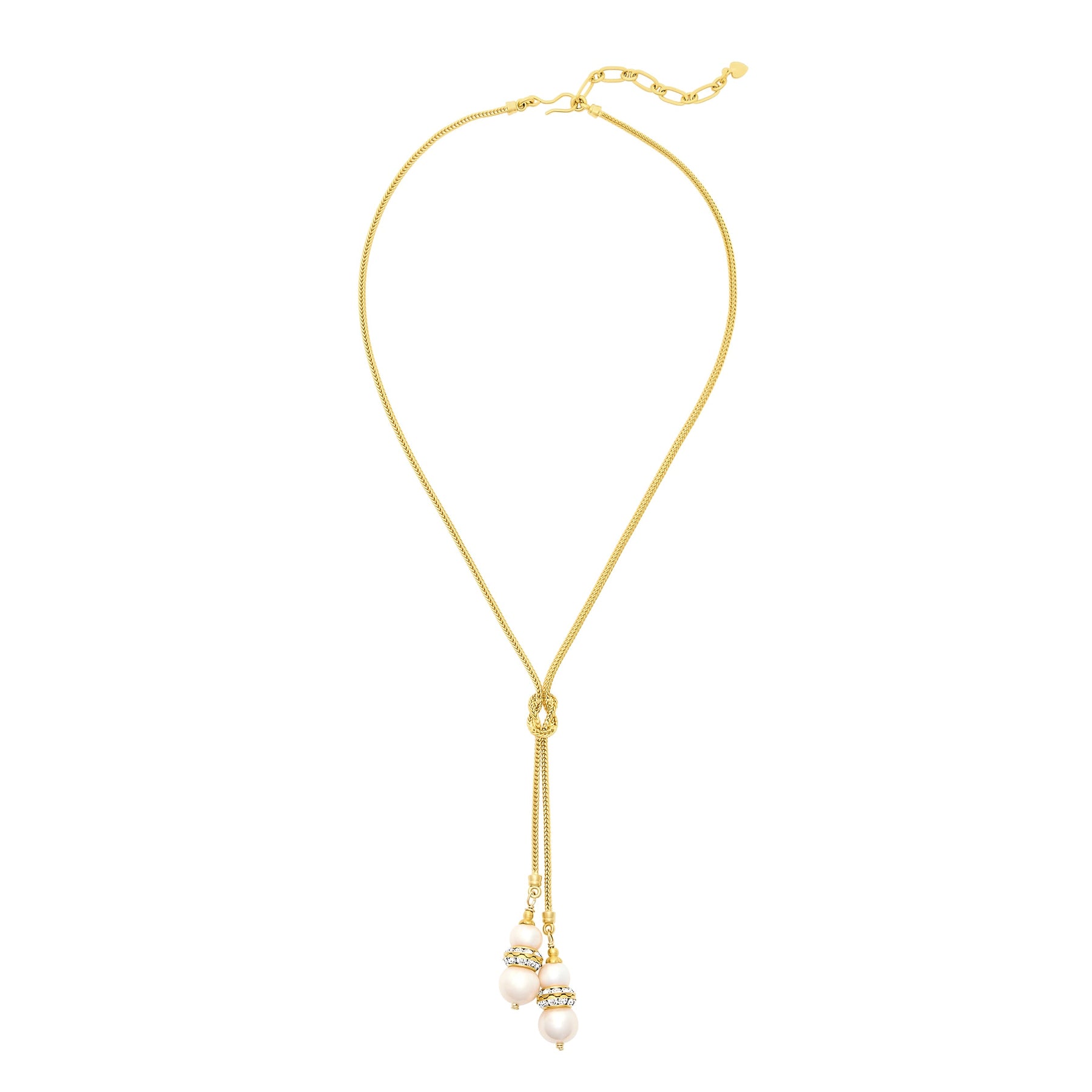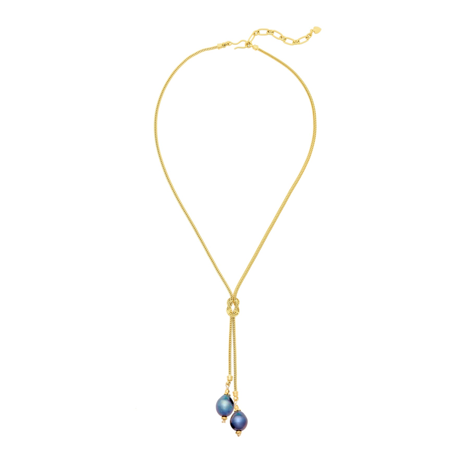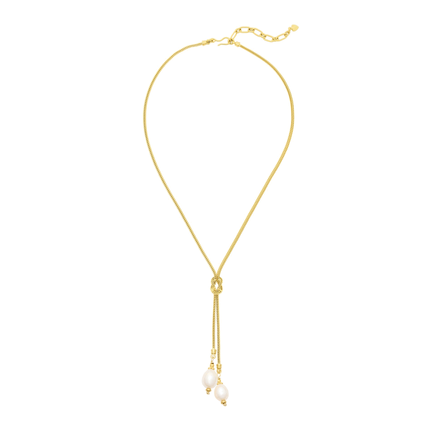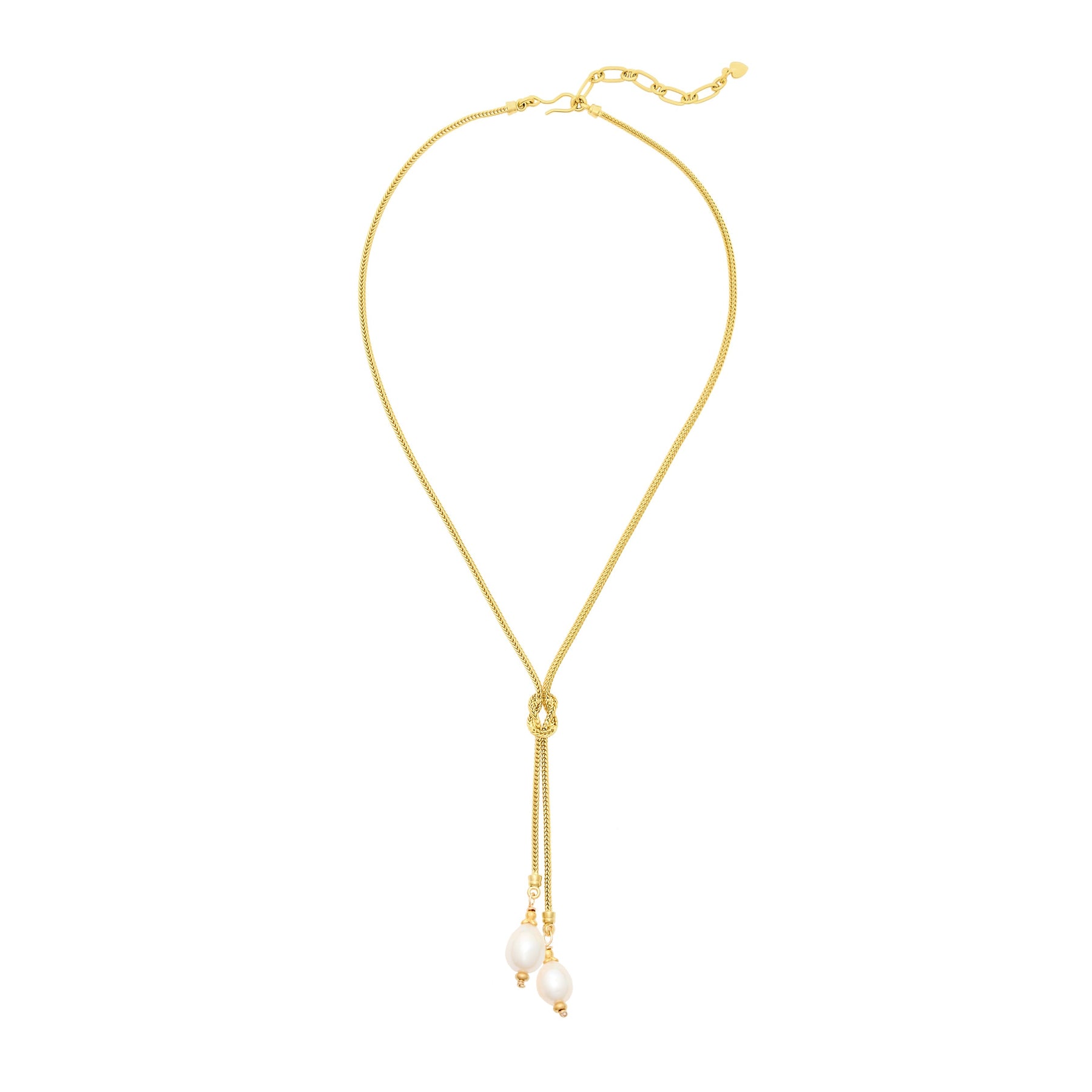 • Freshwater pearls hang from a knotted 24k antique gold plated foxtail chain