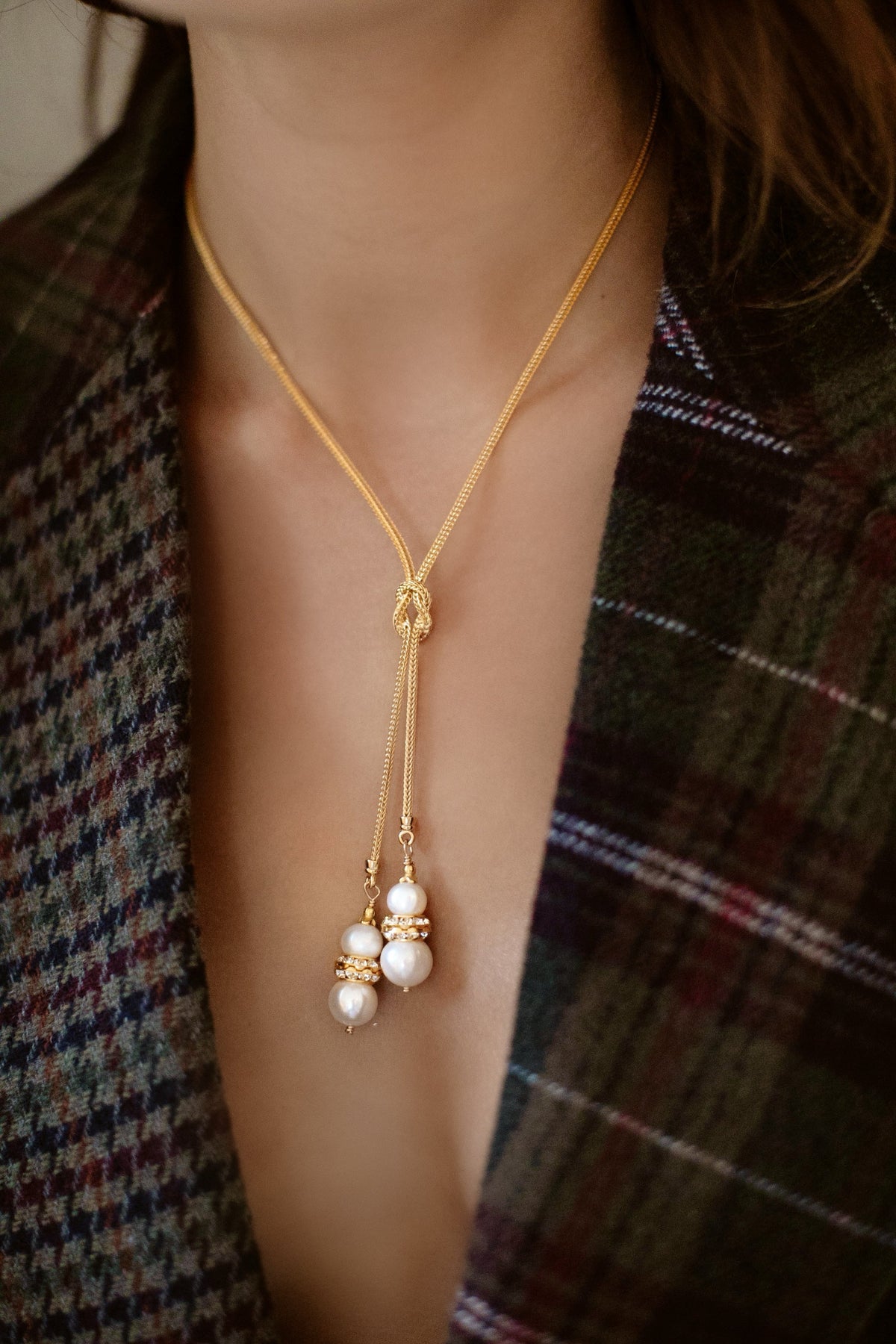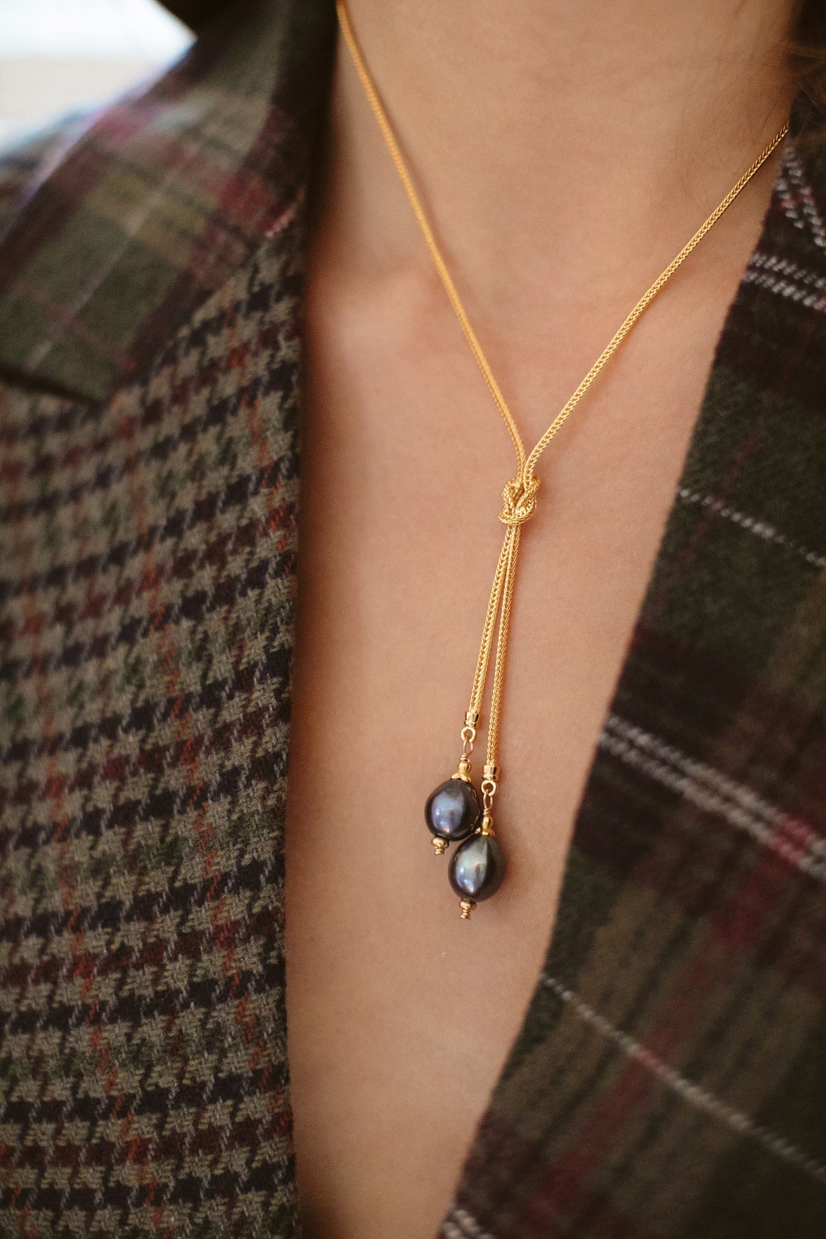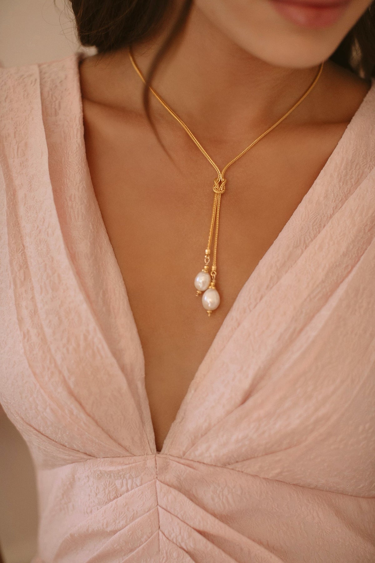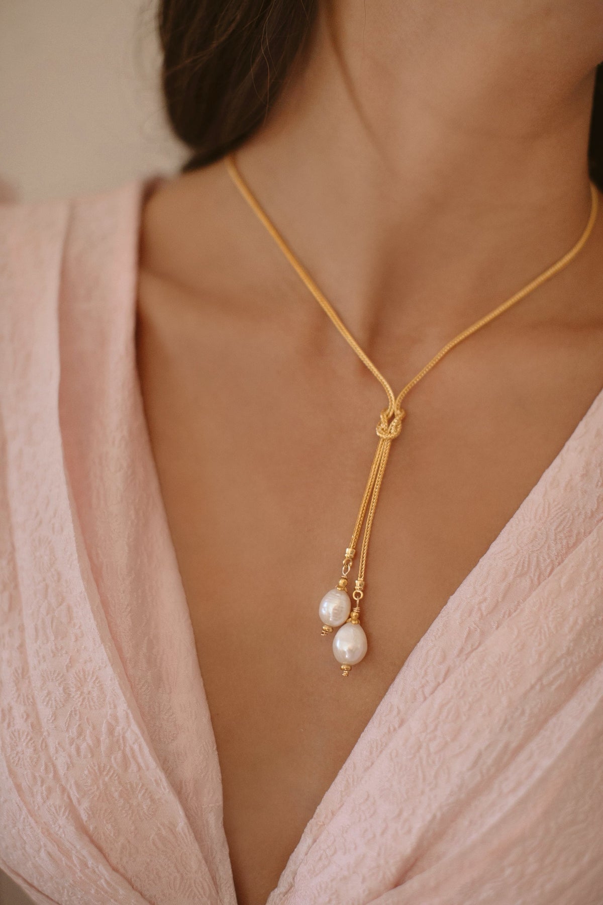 • Freshwater pearls hang from a knotted 24k antique gold plated foxtail chain