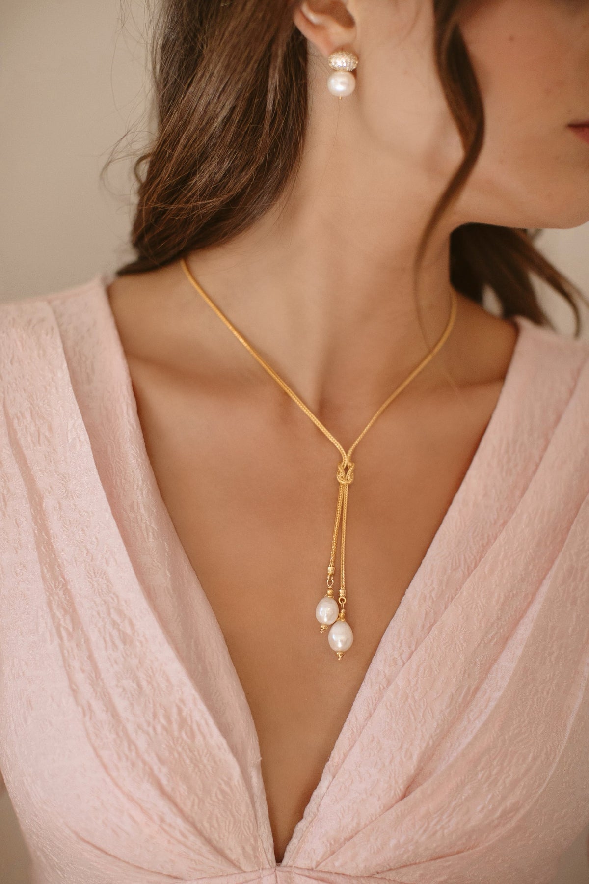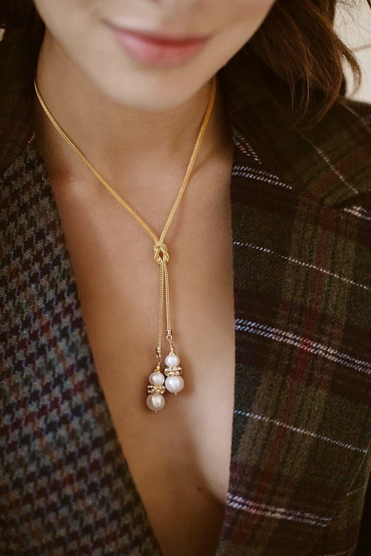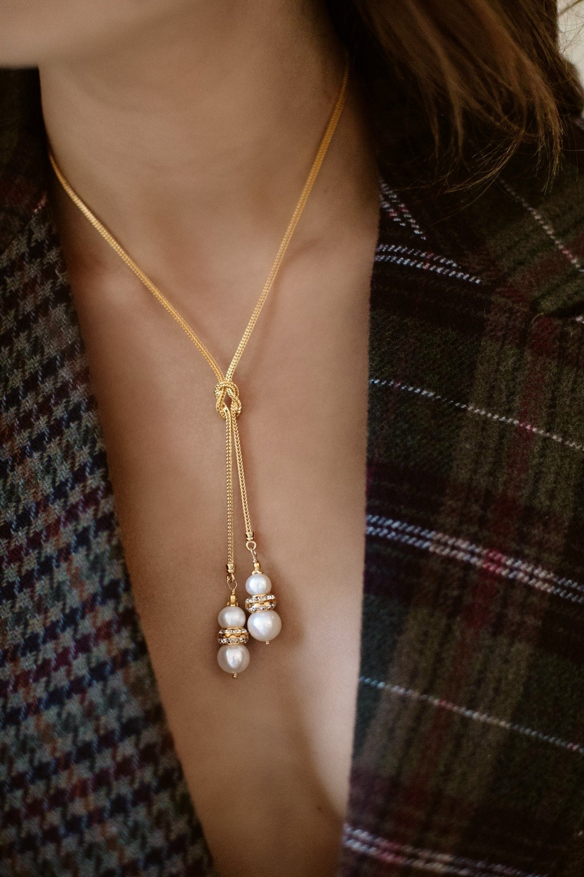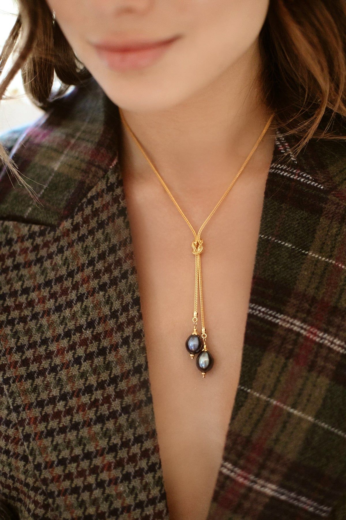 • Freshwater pearls hang from a knotted 24k antique gold plated foxtail chain