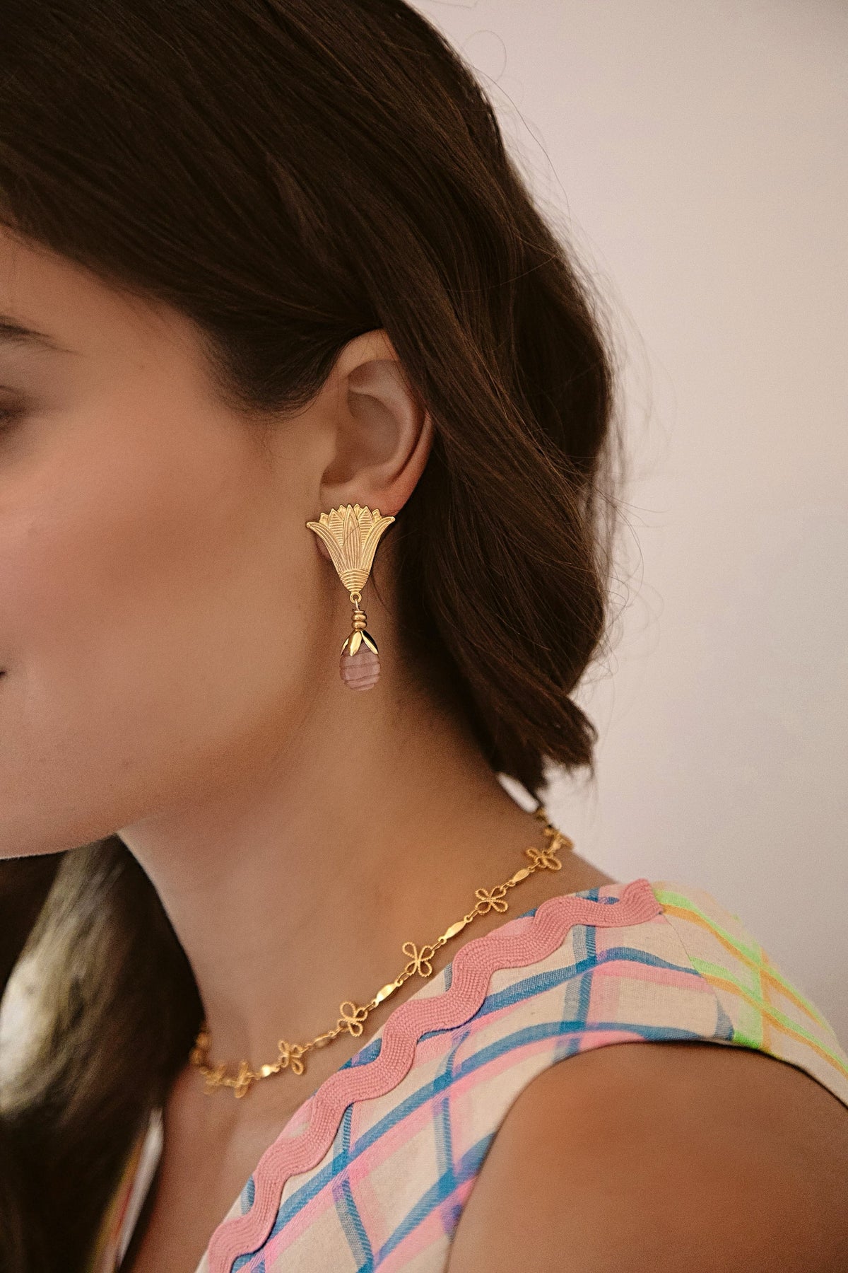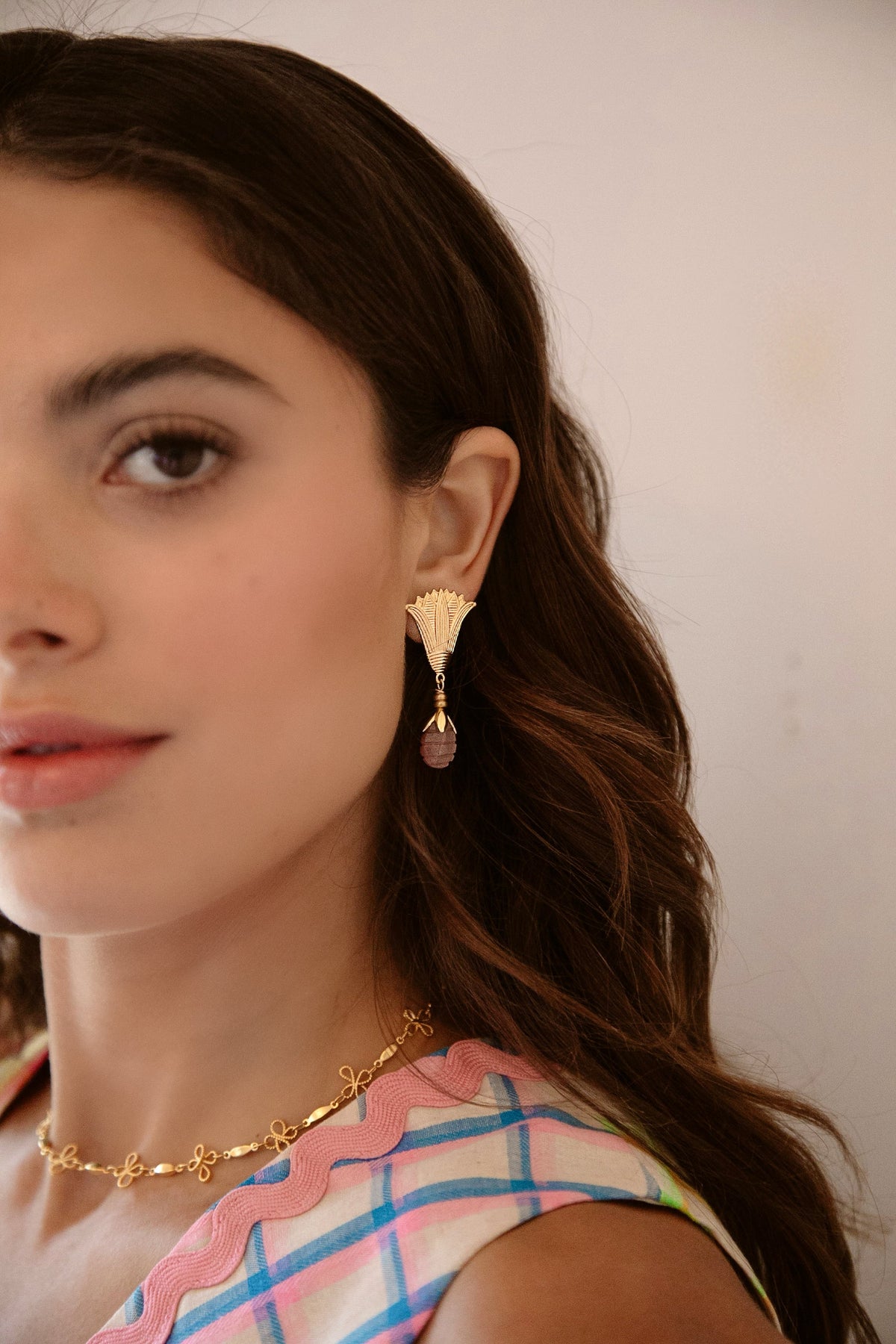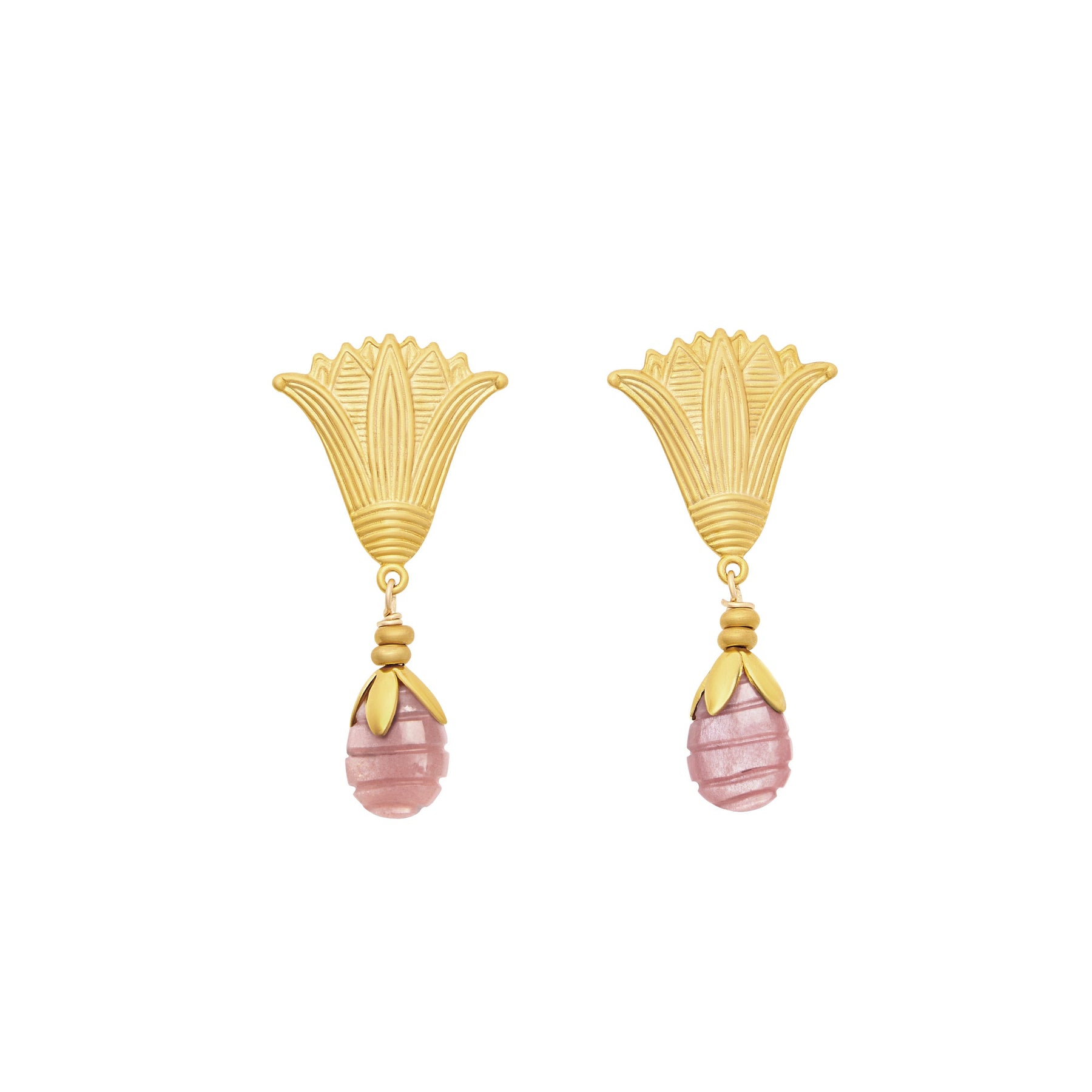 - Carved strawberry quartz teardrops set in 24k antique gold plated brass flowers and lotus flower toppers with stainless steel hypoallergenic posts